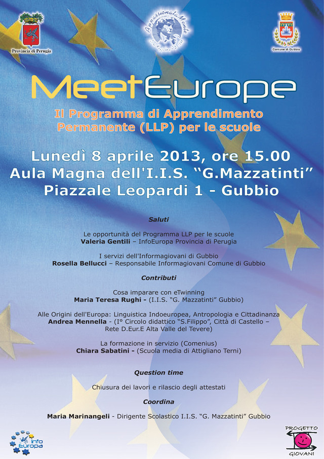 Le opportunità del Programma LLP per le scuole Valeria Gentili – InfoEuropa Provincia di Perugia I servizi dell'Informagiovani di Gubbio Rosella Bellucci – Responsabile Informagiovani Comune di Gubbio Contributi Cosa imparare con eTwinning Maria Teresa Rughi - (I.I.S. “G. Mazzatinti” Gubbio) Andrea Mennella - (I° Circolo didattico “S.Filippo”, Città di Castello – Rete D.Eur.E Alta Valle del Tevere) La formazione in servizio (Comenius) Chiara Sabatini - (Scuola media di Attigliano Terni) Question time Chiusura dei lavori e rilascio degli attestati Aula Magna dell'I.I.S. “G.Mazzatinti” Piazzale Leopardi 1 - Gubbio Lunedì 8 aprile 2013, ore 15.00 Alle Origini dell'Europa: Linguistica Indoeuropea, Antropologia e Cittadinanza Coordina Maria Marinangeli - Dirigente Scolastico I.I.S. “G. Mazzatinti” Gubbio MeetEurope