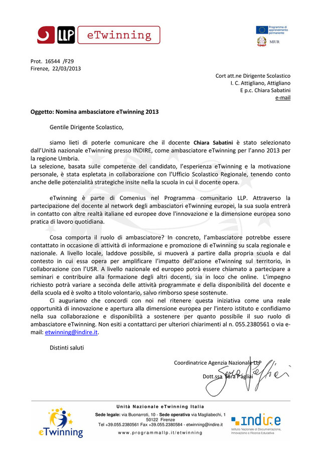 [email protected] w w w . p r o g r a m m a l l p . i t / e t w i n n i n g Prot. 16544 /F29 Firenze, 22/03/2013 Cort att.ne Dirigente Scolastico I. C. Attigliano, Attigliano E p.c. Chiara Sabatini e‐mail Oggetto: Nomina ambasciatore eTwinning 2013 Gentile Dirigente Scolastico, siamo lieti di poterle comunicare che il docente Chiara Sabatini è stato selezionato dall’Unità nazionale eTwinning presso INDIRE, come ambasciatore eTwinning per l’anno 2013 per la regione Umbria. La selezione, basata sulle competenze del candidato, l’esperienza eTwinning e la motivazione personale, è stata espletata in collaborazione con l’Ufficio Scolastico Regionale, tenendo conto anche delle potenzialità strategiche insite nella la scuola in cui il docente opera. eTwinning è parte di Comenius nel Programma comunitario LLP. Attraverso la partecipazione del docente al network degli ambasciatori eTwinning europei, la sua suola entrerà in contatto con altre realtà italiane ed europee dove l'innovazione e la dimensione europea sono pratica di lavoro quotidiana. Cosa comporta il ruolo di ambasciatore? In concreto, l’ambasciatore potrebbe essere contattato in occasione di attività di informazione e promozione di eTwinning su scala regionale e nazionale. A livello locale, laddove possibile, si muoverà a partire dalla propria scuola e dal contesto in cui essa opera per amplificare l’impatto dell’azione eTwinning sul territorio, in collaborazione con l’USR. A livello nazionale ed europeo potrà essere chiamato a partecipare a seminari e contribuire alla formazione degli altri docenti, sia in loco che online. L’impegno richiesto potrà variare a seconda delle attività programmate e della disponibilità del docente e della scuola ed è svolto a titolo volontario, salvo rimborso spese sostenute. Ci auguriamo che concordi con noi nel ritenere questa iniziativa come una reale opportunità di innovazione e apertura alla dimensione europea per l'intero istituto e confidiamo nella sua collaborazione e disponibilità a sostenere per quanto possibile il suo ruolo di ambasciatore eTwinning. Non esiti a contattarci per ulteriori chiarimenti al n. 055.2380561 o via e‐ mail: