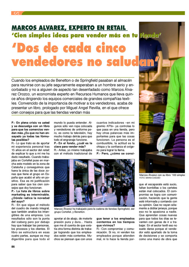 otras empresas cualquier chaval se tuerce un tobillo y está más tiempo de baja. P.- ¿Qué tiene el sector del r e t a i l (venta detallista) que no tengan otros? R.- Que es inmediato y el re- sultado se ve de hoy para hoy. No existe el problema de que no te paguen, y al final del día sabes lo que vendiste. Es su- percompetitivo, sobre todo en España, donde tenemos algu- nas de las principales marcas del mundo como Mango o In- ditex. La pena es que el co- mercio en nuestro país toda- vía no tiene prestigio, no está bien considerado ni se ve co- mo una profesión. P.- En eso quizá influye que a veces entras a una tienda y el empleado ni te saluda... R.- Nosotros solíamos medir qué porcentaje de vendedores daban los buenos días a los clientes mediante la técnica del mistery shopper ( c l i e n t e misterioso) y comprobamos que dos de cada cinco no lo hacía. Cuando pedíamos cuentas a los encargados nos decían que les faltaba forma- ción. Pero yo no creo que sea un tema de formación. Simple- mente, no están a gusto y de- jan pasar el tiempo, porque su trabajo no les apasiona. P.- ¿Qué opinión tiene del comercio en ciudades pe- queñas como Santander? R.- Mi experiencia es que el servicio es ligeramente mejor que en las grandes, porque el trato es más personalizado y el cliente más fiel. Quiere que le atienda un determinado vendedor y éste le conoce, a diferencia de Madrid o Barce- l o n a . P.- ¿Qué tendría que apren- der el pequeño comercio de las grandes cadenas? R.- Sobre todo flexibilidad, porque muchas tiendas no se han adaptado a los cambios del mercado y se las está co- miendo. Los pequeños fran- quiciados pueden hacer una guerra de guerrillas, ser el vietnamita contra los america- nos (por ejemplo, un ‘Benet- ton’ en Reinosa o en Castro) porque la gente les conoce y pueden prestar las prendas al cliente para que se las pruebe en casa o enseñarles la colec- ción antes que al resto. Sin embargo, en otras cosas tie- nen que profesionalizarse: de- volver el dinero porque ya na- die acepta vales o utilizar el ordenador para gestionar la tienda y no como si fuera una caja registradora. Tener una tienda ya no es montarle un negocio a un hijo para que no se aburra en casa PA T R I C I A SA N VI C E N T E 88 ▪ F A L T A D E C O M P R O M I S O Una vez le pidieron que analizara por qué en la tienda Springfield de Bar- celona las diferen- cias de inventario (pérdidas o robos) triplicaban las del resto de estableci- mientos de la cade- na, algo que sus responsables acha- caban al mayor ín- dice de robos de la Ciudad Condal. Tras estudiar la si- tuación descubrió que ningún emplea- do llevaba más de dos años trabajando, de modo que su compromiso era nulo: “Pasa- ban de todo y si robaban les daba igual, incluso se cogían el finiquito en prendas porque sabían que en seis meses estaban fuera”, cuenta. Au- mentando el compromiso dis- minuyeron la rotación y en un año recuperaron cerca de 750.000 euros en mermas de inventario. ▪ A G A C H A R S E A N T E E L C U E N T A P E R S O N A S : Muchas tiendas utilizan con- tadores en las alarmas para conocer su nivel de conver- sión, es decir, cuántos clien- tes compran de todos los que entran. El problema es que algunos vendedores, incluso sus clientes y amigos, se agachan en el momento de atravesar la entrada para no ser contabilizados y no que- darse sin comisión en caso de no alcanzar el porcentaje de ventas convenido. Cada año, entre 10 y 15 personas del Grupo Cortefiel se van a la calle porque una auditoría descubre que han tapado el cuentapersonas con celo o han colocado una planta de- lante para que no funcione. La recomendación de este experto es no centrarse tanto en los indicadores, porque el personal acaba haciendo t r a m p a s . ▪ S E R POLIVALENTE: A los vendedores suele gus- tarles cobrar al cliente porque ser cajero supone un estatus superior. Sin embargo, este experto en recursos humanos se ha encontrado con tiendas en las que los propios em- p l e a d o s impiden a sus com- pañeros conocer el funciona- miento de la caja. “De 12 em- pleados sólo sabían cobrar tres y cuando pregunté el mo- tivo lo achacaron a que los excluidos no estaban prepa- rados”. Mala excusa cuando el 60% de los dependientes tienen carrera universitaria. Cuando sus responsables no les creen capaces de cobrar o no confían en ellos, se des- m o t i v a n . ▪ C O N T A R C O N E L P E R- S O N A L : Lo que para el autor no pue- de fallar en una tienda es sa- ludar, ofrecer y surtir. Pero, el ofrecimiento varía cada vez que hay cambios signifi- cativos y eso hay que expli- cárselo al vendedor, no bas- ta con mandarle un argu- mentario. Él comprobó que cuando la ropa cambiaba de lugar ganaban un 20% me- nos porque el vendedor de- jaba de atender al cliente y la tienda tampoco vendía por sí sola, porque las prendas permanecían más tiempo desordenadas. Su consejo es contar con el personal pa- ra planificar los cambios. EXPERIENCIAS REALES DE TIENDAS EN APUROS Este experto en recursos humanos narra en el libro algunas de los problemas que tuvo que resolver en las tiendas para las que trabajaba.