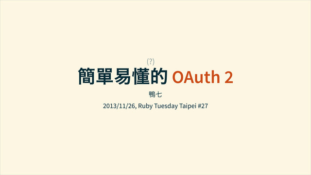 利用 OAuth 2 通訊協定,可以實作出 API 的存取管制,讓 API 得知要操作的對象 user 是誰,並且讓你做出像 Facebook 登入那樣子的登入流程。然而 OAuth 2.0 的 spec 根本就是個 [tl;dr] 的東西,但沒讀過 spec 也沒辦法輕鬆實作,更別說套現成的 gem 擋在 API 的前面。本演講會簡單介紹 OAuth 2 是怎麼一回事,並示範如何從零建立一個用 OAuth 2 鎖住的 Grape API。若您沒有 Ruby / Rails 的經驗,也可以大略得知製造 OAuth 2.0 API 鎖的方法。