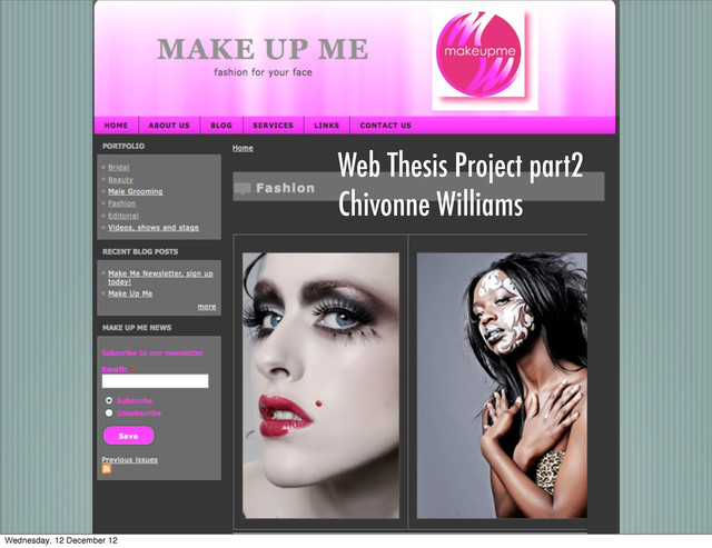 makeup business, with expertise in all areas of innovative beauty, fashion and photographic styling. Make Up Me currently needs a face-lift, a new design and additional interactive media including social elements and SEO. ¥ My aim is to redesign the site and the brand, expand the business model, make it more interactive and develop more online presence. I would like to give clients and browsers more reason to return to the site, stay on it longer and support a cause that’s close to my heart. I will add news and social forums for clients and patients to use as well as other Social Media such as Pinterest and Facebook, which will allow people to come up with campaigns to support women with Cancer who need help with makeup and hair. Wednesday, 12 December 12