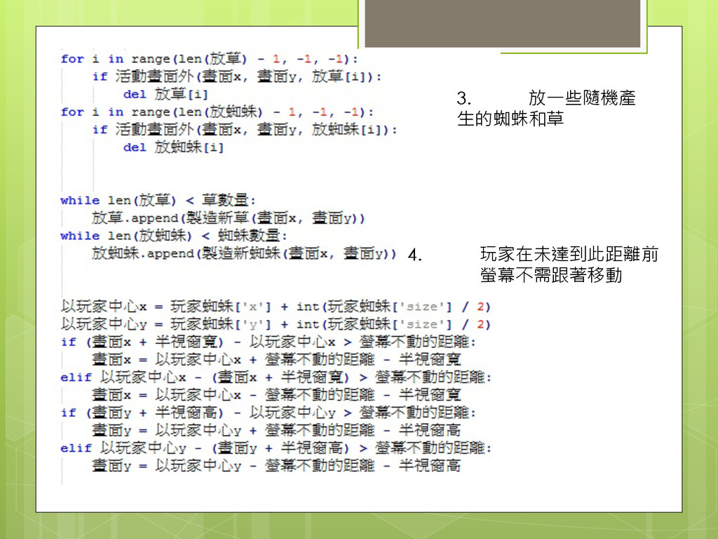Ø def 終止() Ø def 取得跳躍數值(現在跳躍數值, 跳躍速度, 跳躍高度 ) Ø def 取得隨機速度() Ø def 隨機草(畫面x, 畫面y, 物件寬, 物件高) Ø def 製造新蜘蛛(畫面x, 畫面y) Ø def 製造新草(畫面x, 畫面y) Ø def 活動畫面外(畫面x, 畫面y, obj)