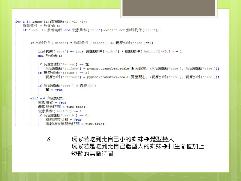 6. 玩家若吃到比自己小的蜘蛛è體型變大 玩家若是吃到比自己體型大的蜘蛛è扣生命值加上 短暫的無敵時間