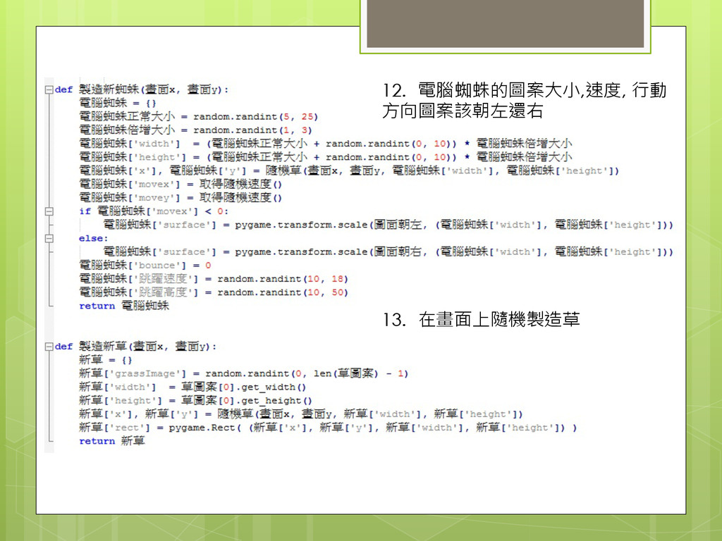 12. 電腦蜘蛛的圖案大小,速度, 行動 方向圖案該朝左還右 13. 在畫面上隨機製造草