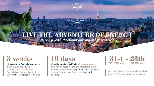 Polish up your French and knowledge of France with a complete cultural and language trip to Paris and Vichy, from December 31st 2022 to January 28th 2024!