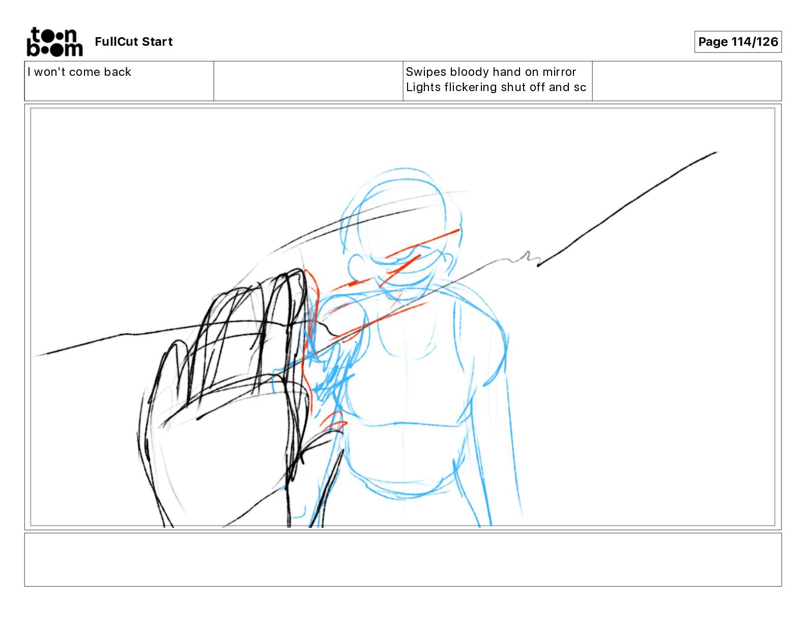 I won't come back Swipes bloody hand on mirror Lights