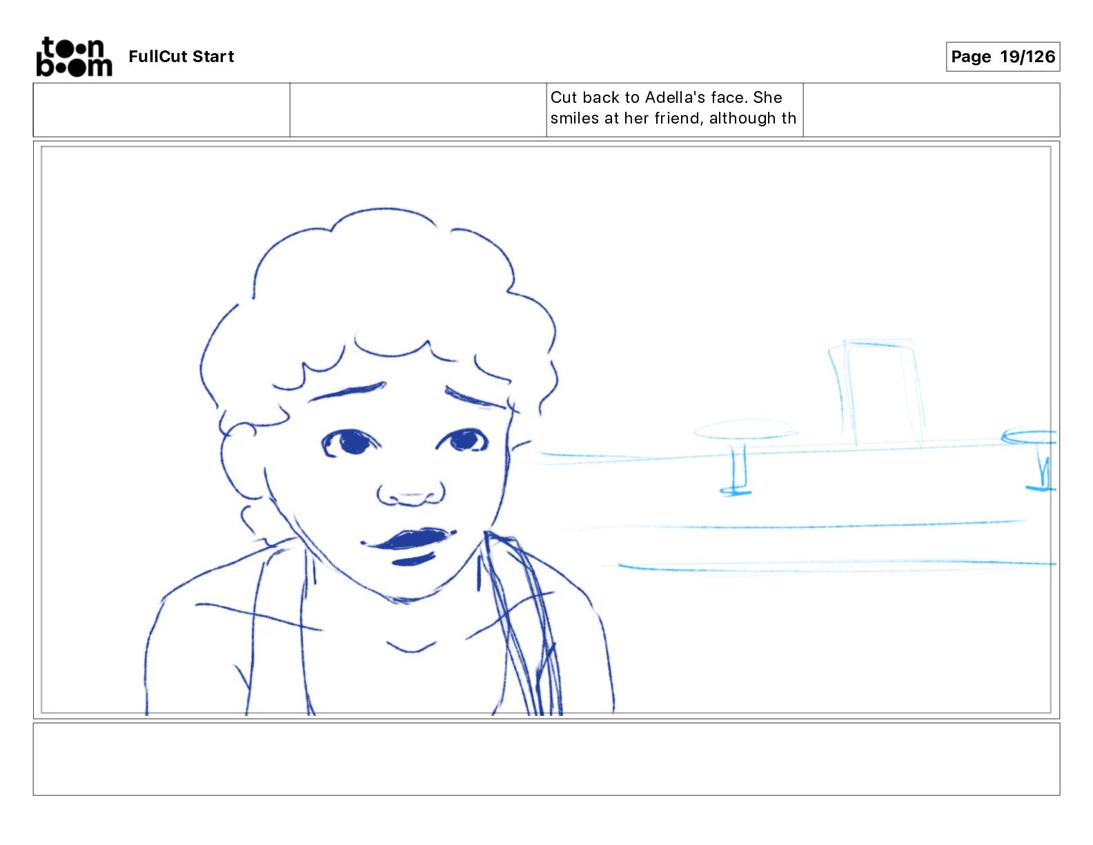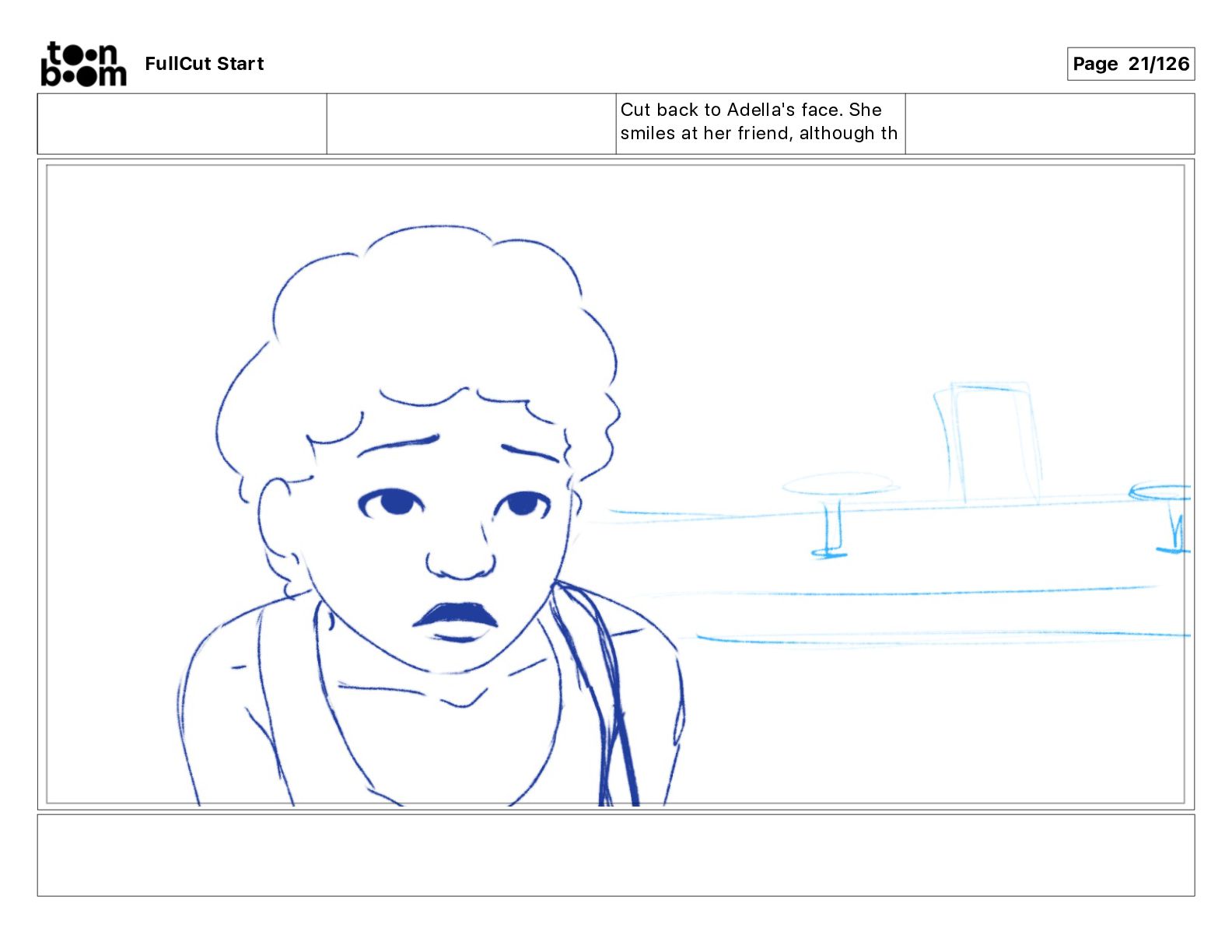 Cut back to Adella's face. She smiles at her friend,