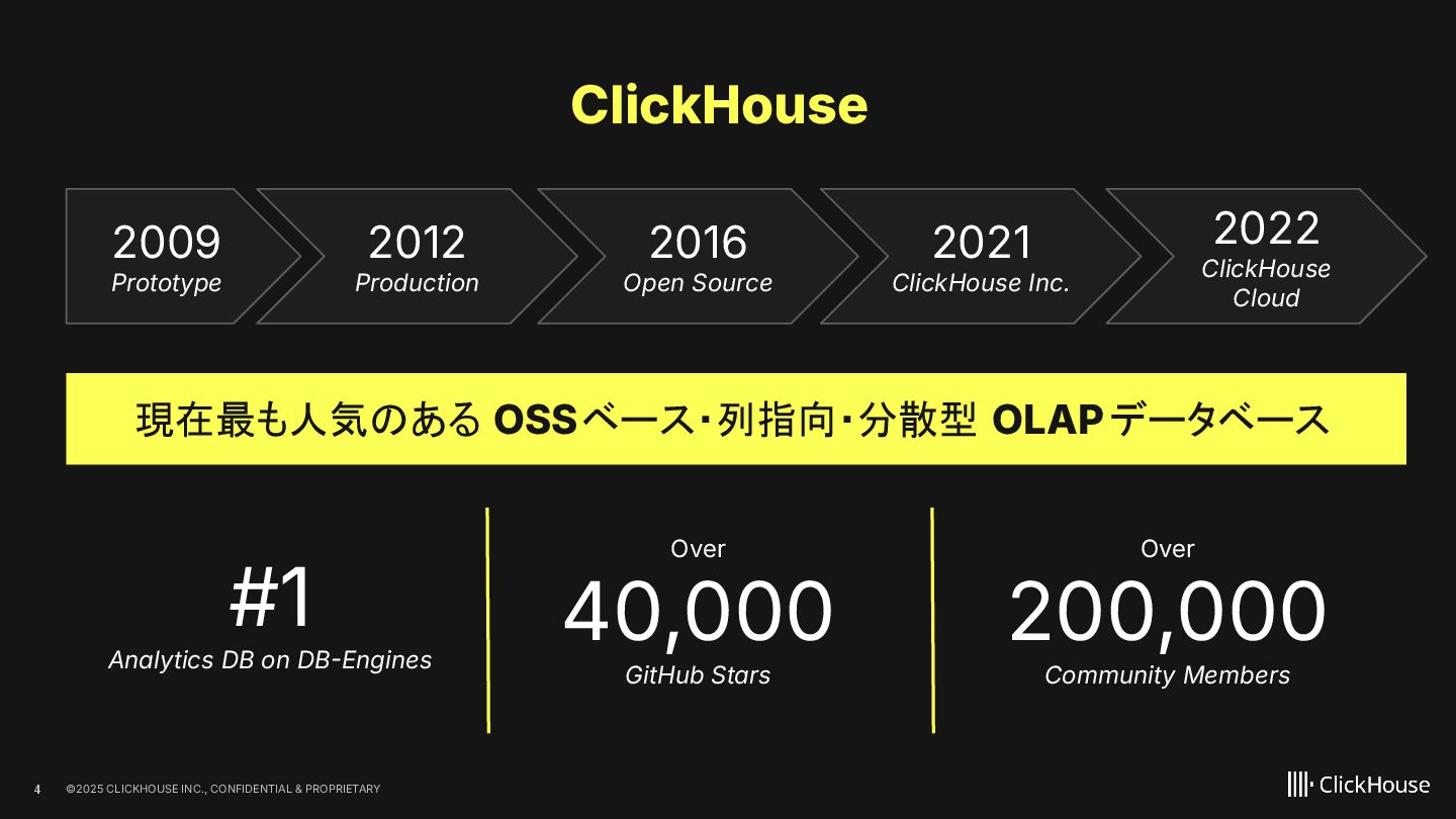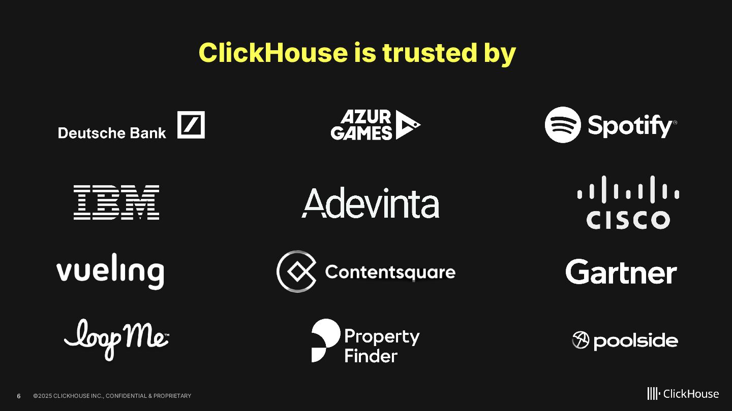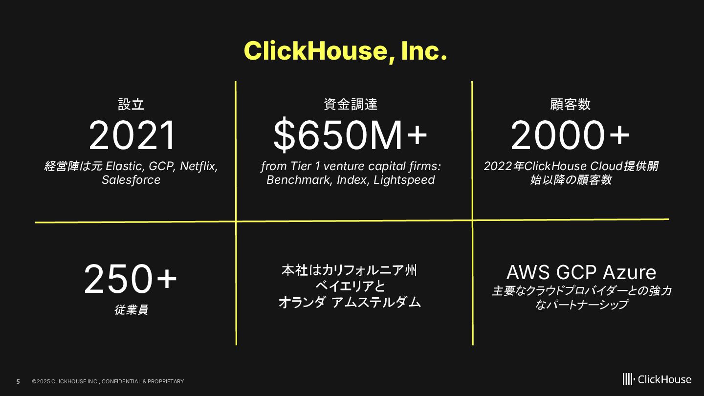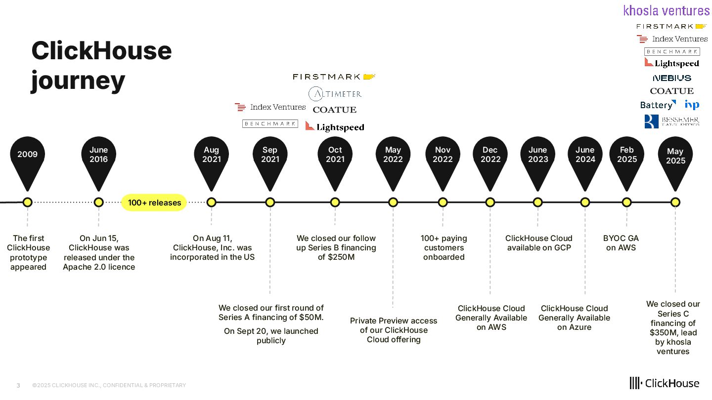2023 ClickHouse Cloud available on GCP Dec 2022 ClickHouse Cloud Generally Available on AWS Nov 2022 100+ paying customers onboarded May 2022 Private Preview access of our ClickHouse Cloud offering Sep 2021 We closed our first round of Series A financing of $50M. On Sept 20, we launched publicly Aug 2021 On Aug 11, ClickHouse, Inc. was incorporated in the US 2009 The first ClickHouse prototype appeared 100+ releases June 2016 On Jun 15, ClickHouse was released under the Apache 2.0 licence June 2024 ClickHouse Cloud Generally Available on Azure Feb 2025 BYOC GA on AWS Oct 2021 We closed our follow up Series B financing of $250M May 2025 We closed our Series C financing of $350M, lead by khosla ventures