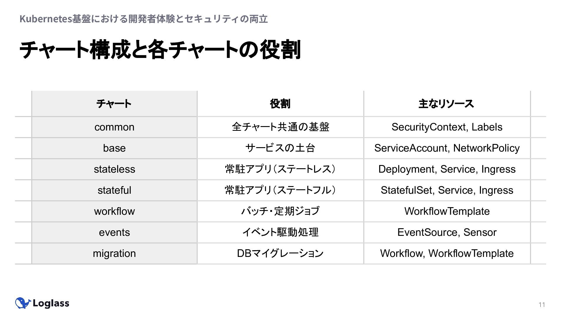 Kubernetes基盤における開発者体験とセキュリティの両⽴ 10 なぜ1つの巨大チャートにしないのか • 役割ごとにチャートを分割 → テンプレートの可読性・保守性が向上 • 全チャートが common