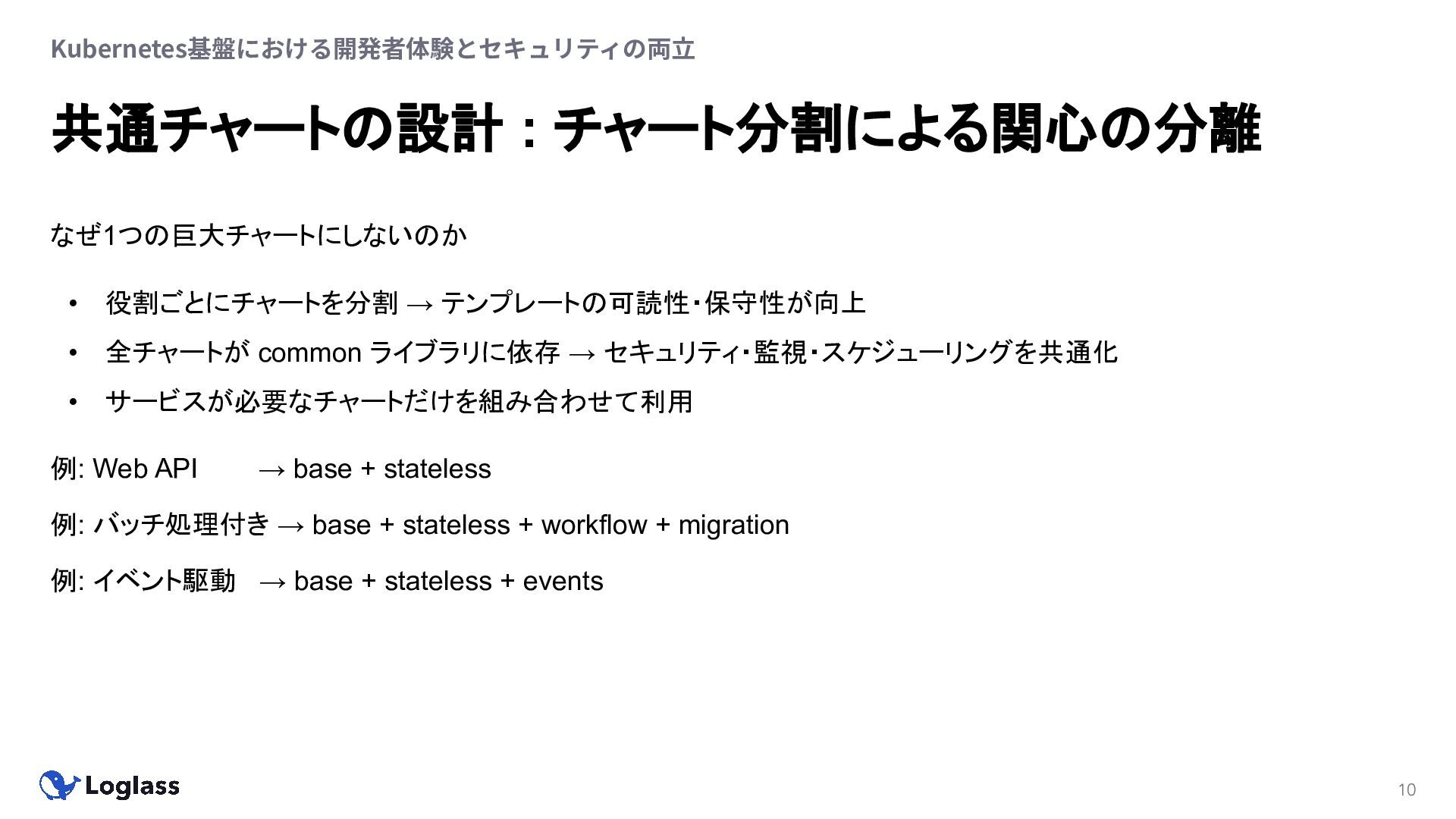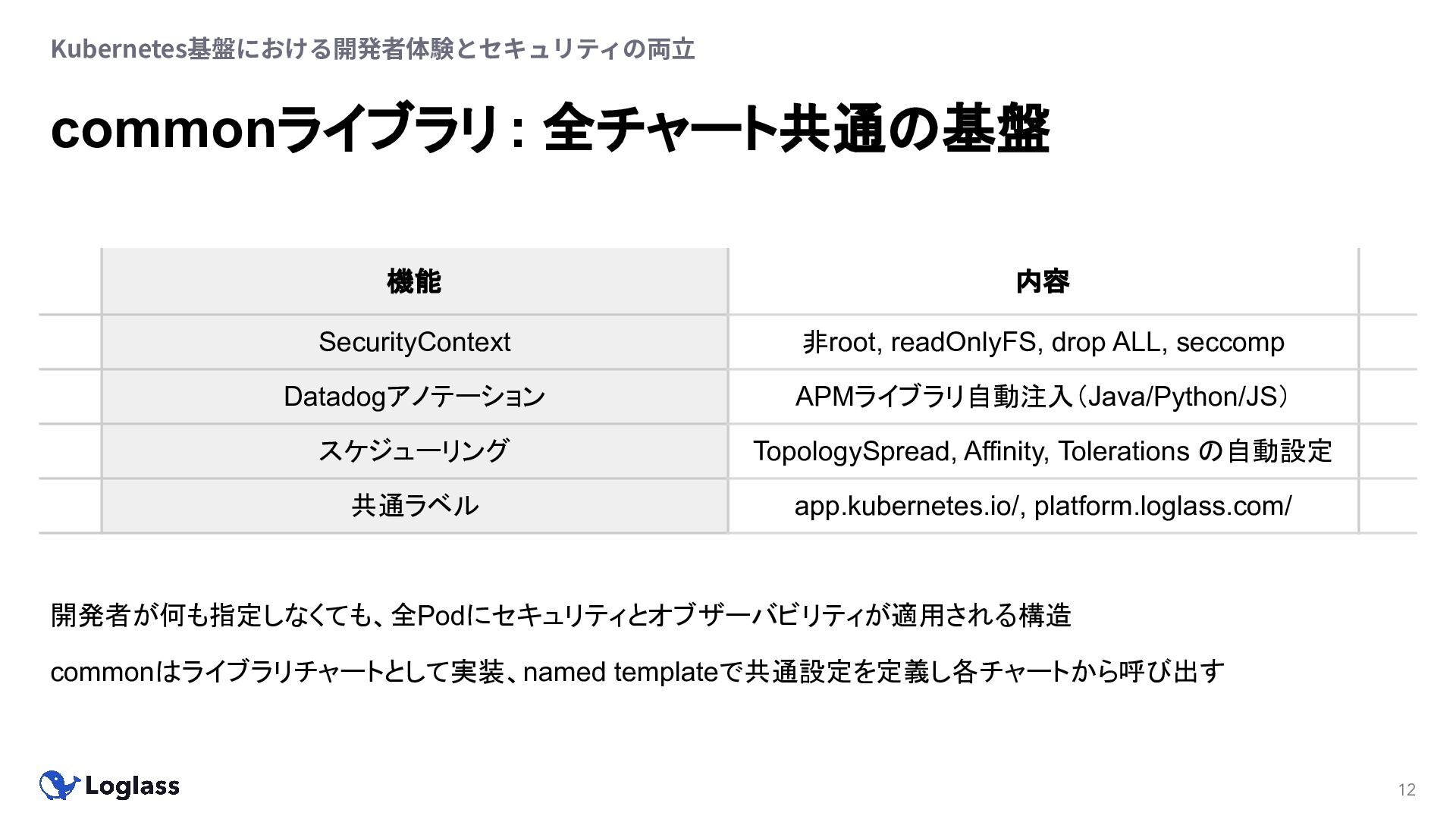 drop ALL, seccomp Datadogアノテーション APMライブラリ自動注入(Java/Python/JS) スケジューリング TopologySpread, Affinity, Tolerations の自動設定 共通ラベル app.kubernetes.io/, platform.loglass.com/ 開発者が何も指定しなくても、全Podにセキュリティとオブザーバビリティが適用される構造 commonはライブラリチャートとして実装、named templateで共通設定を定義し各チャートから呼び出す