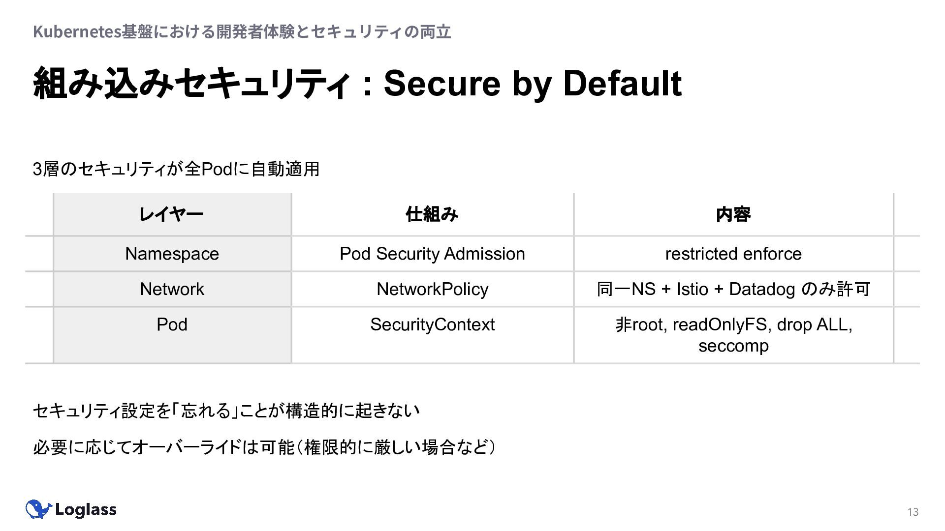 13 組み込みセキュリティ : Secure by Default Kubernetes基盤における開発者体験とセキュリティの両⽴ レイヤー 仕組み 内容