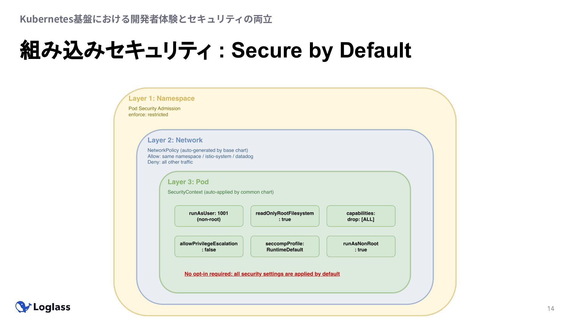 Kubernetes基盤における開発者体験とセキュリティの両⽴ 組み込みセキュリティ : Secure by Default 14