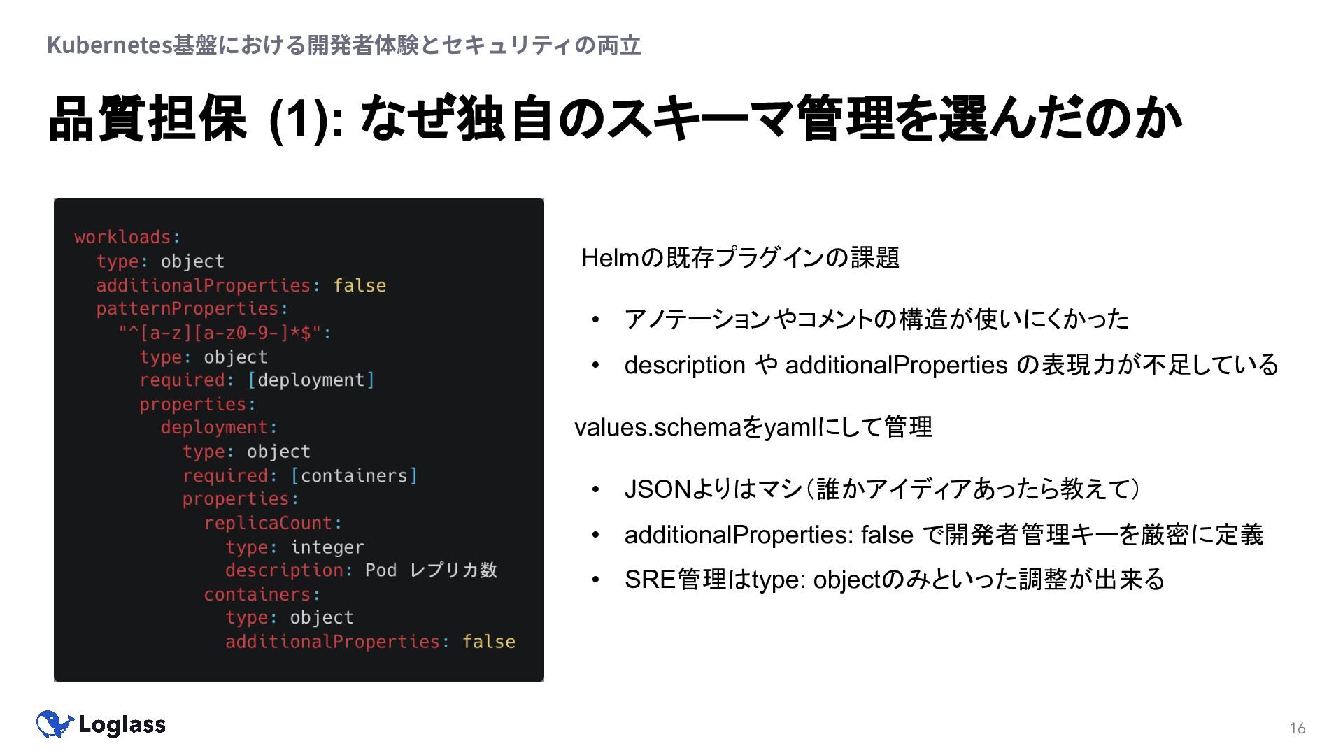 や additionalProperties の表現力が不足している values.schemaをyamlにして管理 • JSONよりはマシ(誰かアイディアあったら教えて) • additionalProperties: false で開発者管理キーを厳密に定義 • SRE管理はtype: objectのみといった調整が出来る
