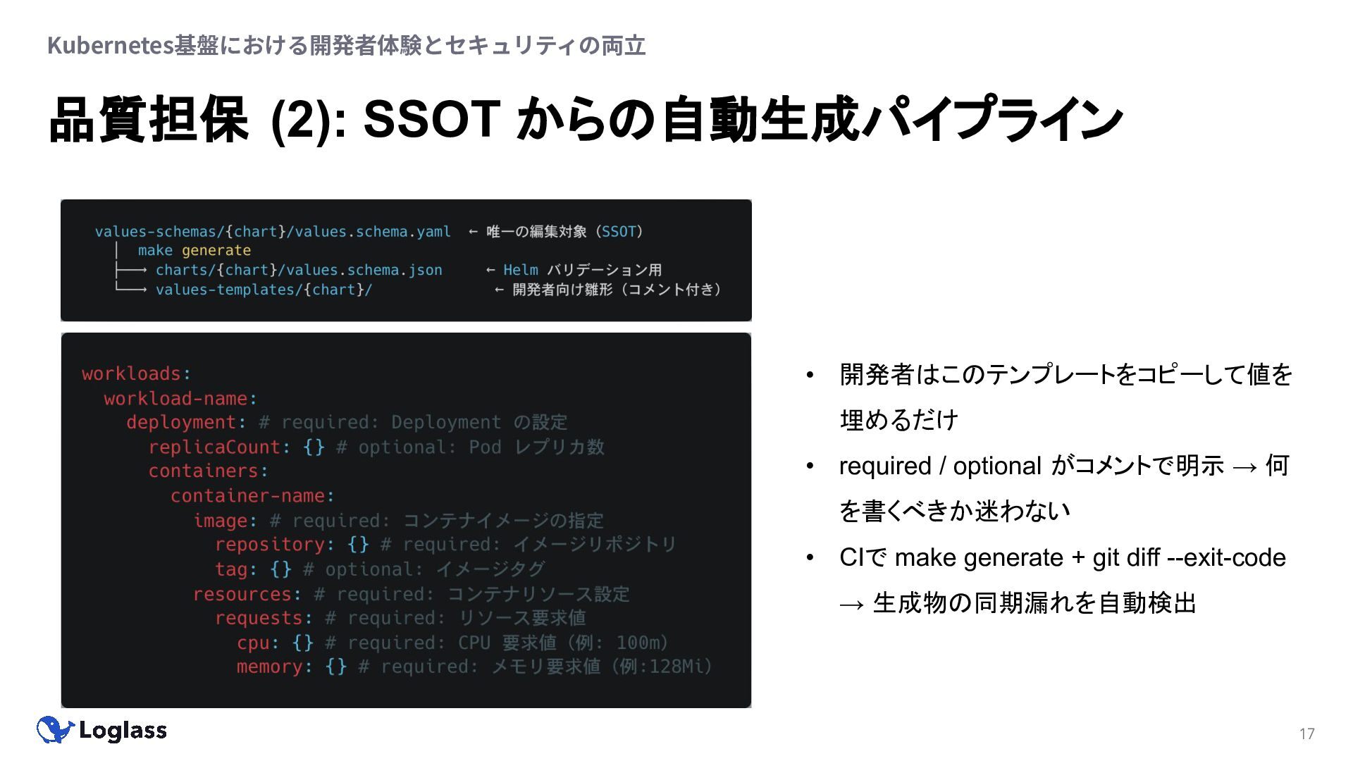 Kubernetes基盤における開発者体験とセキュリティの両⽴ 17 品質担保 (2): SSOT からの自動生成パイプライン • 開発者はこのテンプレートをコピーして値を 埋めるだけ •