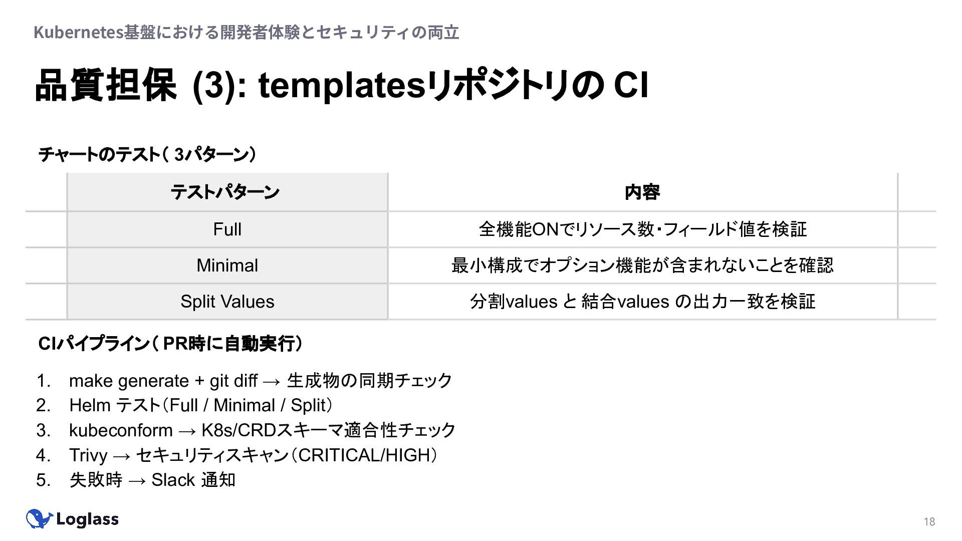 18 品質担保 (3): templatesリポジトリの CI Kubernetes基盤における開発者体験とセキュリティの両⽴ テストパターン 内容 Full 全機能ONでリソース数・フィールド値を検証