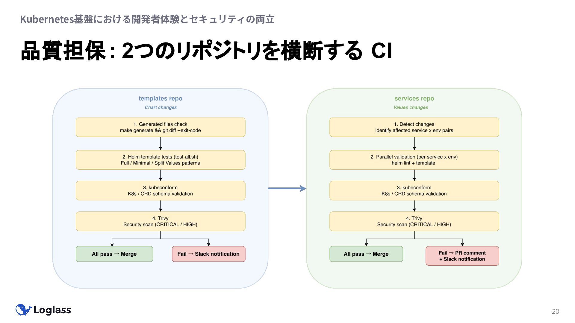 20 品質担保: 2つのリポジトリを横断する CI Kubernetes基盤における開発者体験とセキュリティの両⽴
