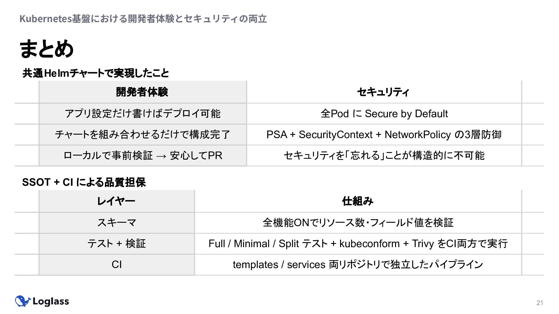 Default チャートを組み合わせるだけで構成完了 PSA + SecurityContext + NetworkPolicy の3層防御 ローカルで事前検証 → 安心してPR セキュリティを「忘れる」ことが構造的に不可能 共通Helmチャートで実現したこと レイヤー 仕組み スキーマ 全機能ONでリソース数・フィールド値を検証 テスト + 検証 Full / Minimal / Split テスト + kubeconform + Trivy をCI両方で実行 CI templates / services 両リポジトリで独立したパイプライン SSOT + CI による品質担保
