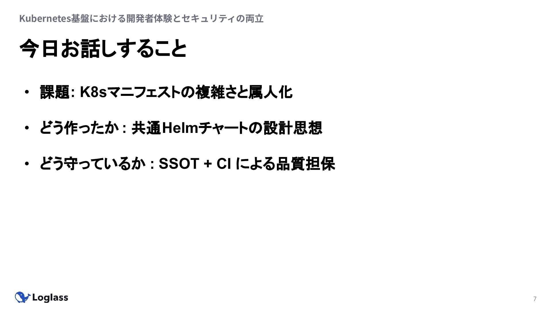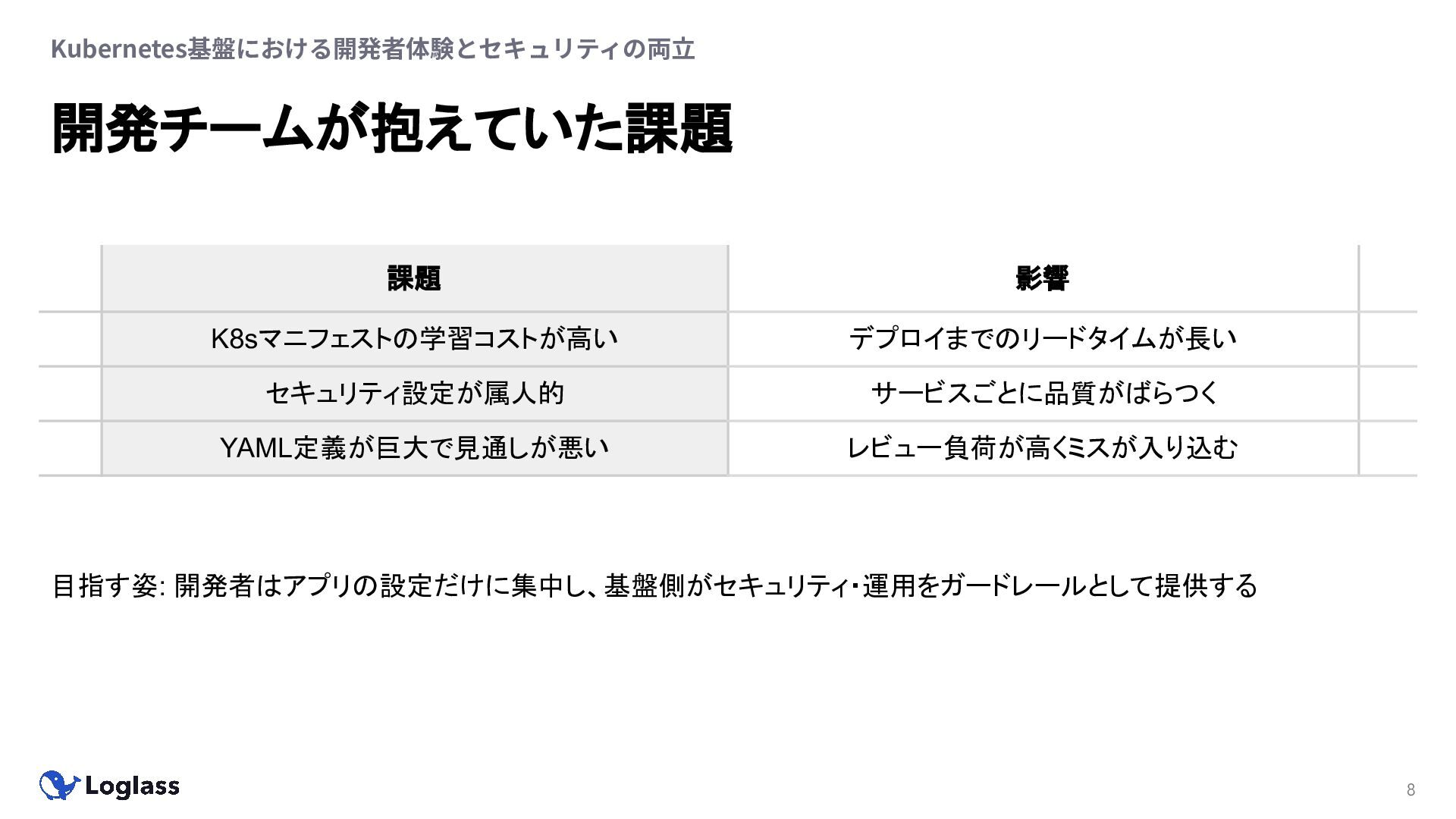 Kubernetes基盤における開発者体験とセキュリティの両⽴ 7 • 課題: K8sマニフェストの複雑さと属人化 • どう作ったか : 共通Helmチャートの設計思想 •