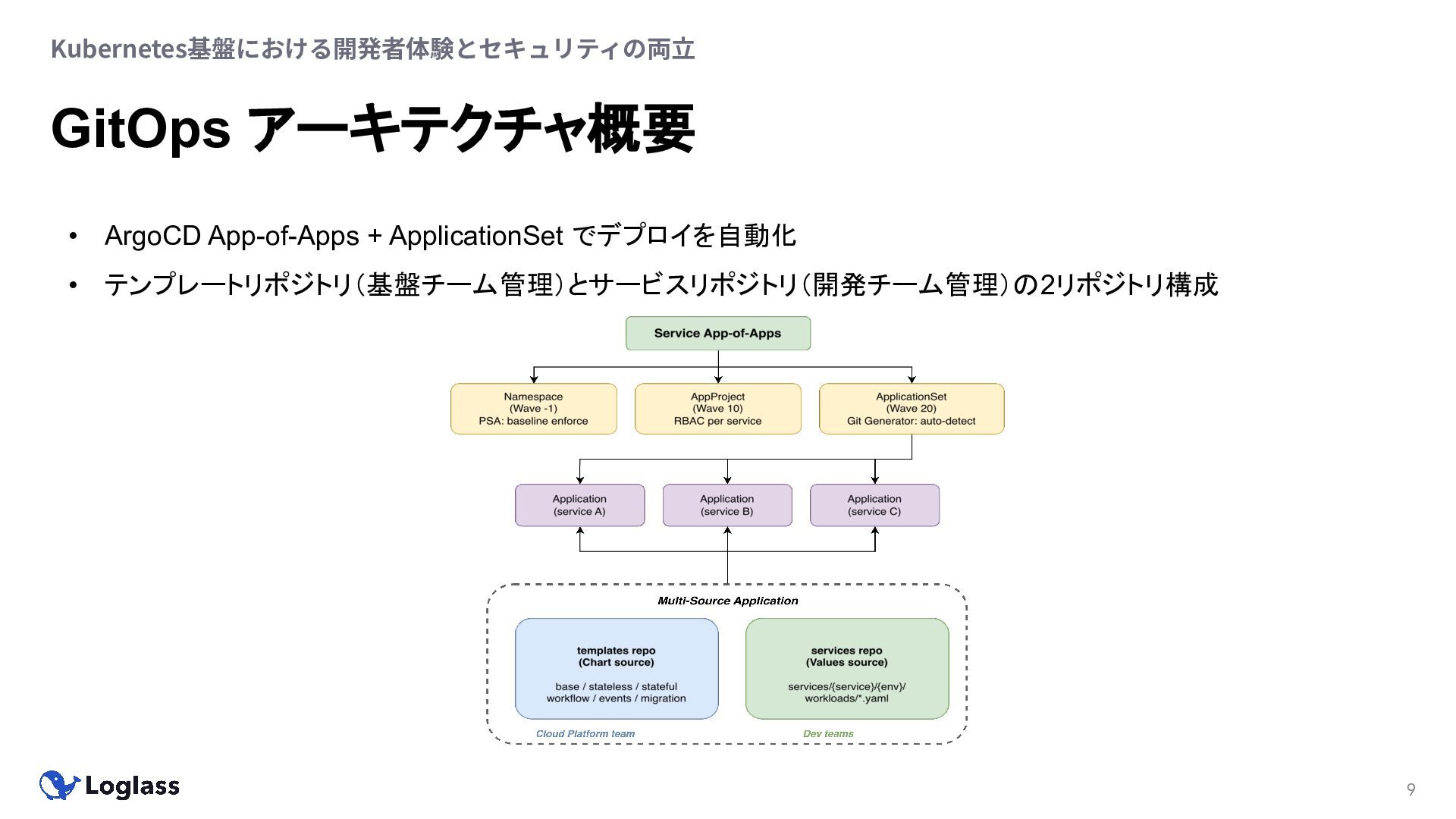 Kubernetes基盤における開発者体験とセキュリティの両⽴ 9 • ArgoCD App-of-Apps + ApplicationSet でデプロイを自動化 • テンプレートリポジトリ(基盤チーム管理)とサービスリポジトリ(開発チーム管理)の2リポジトリ構成
