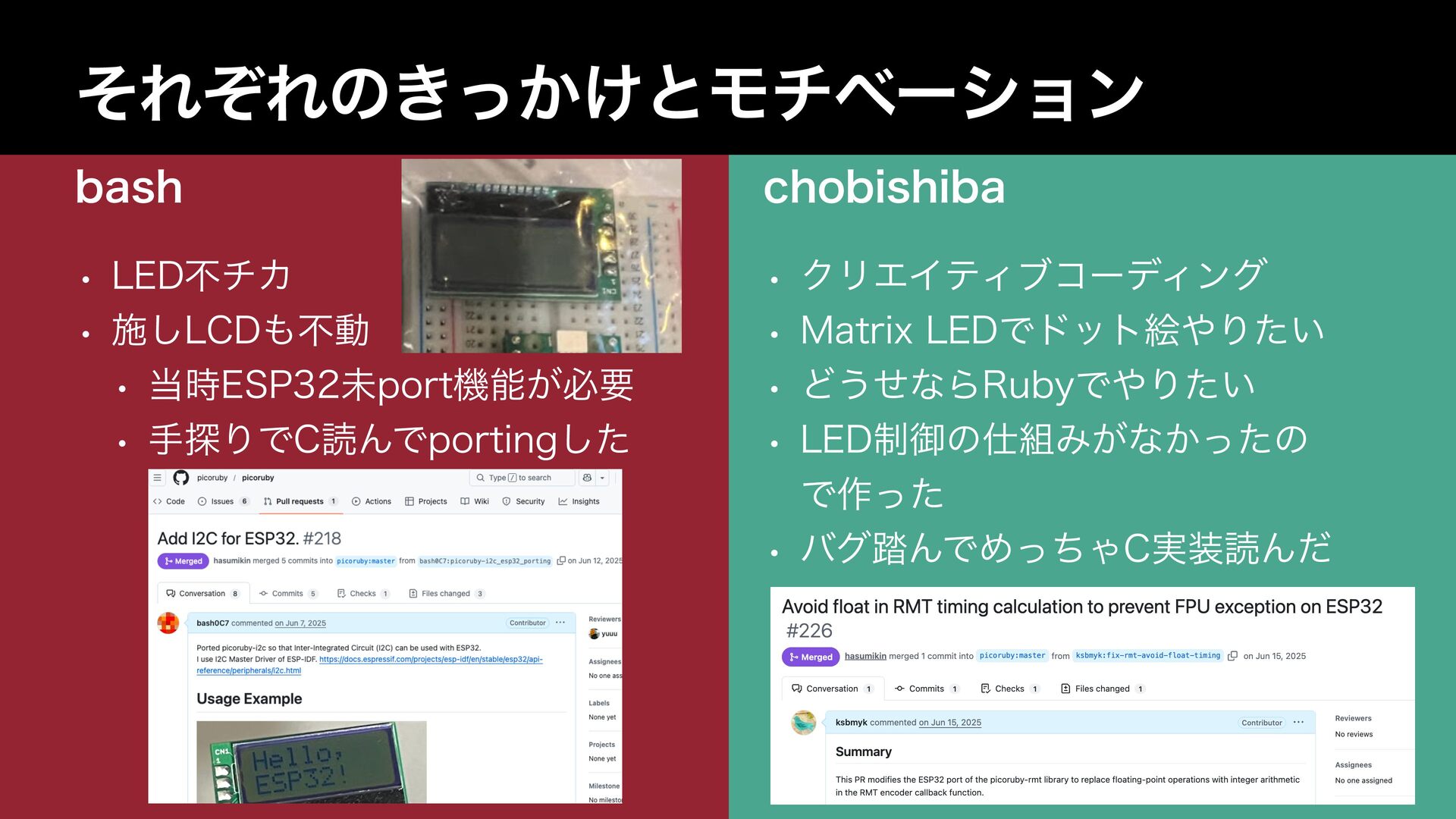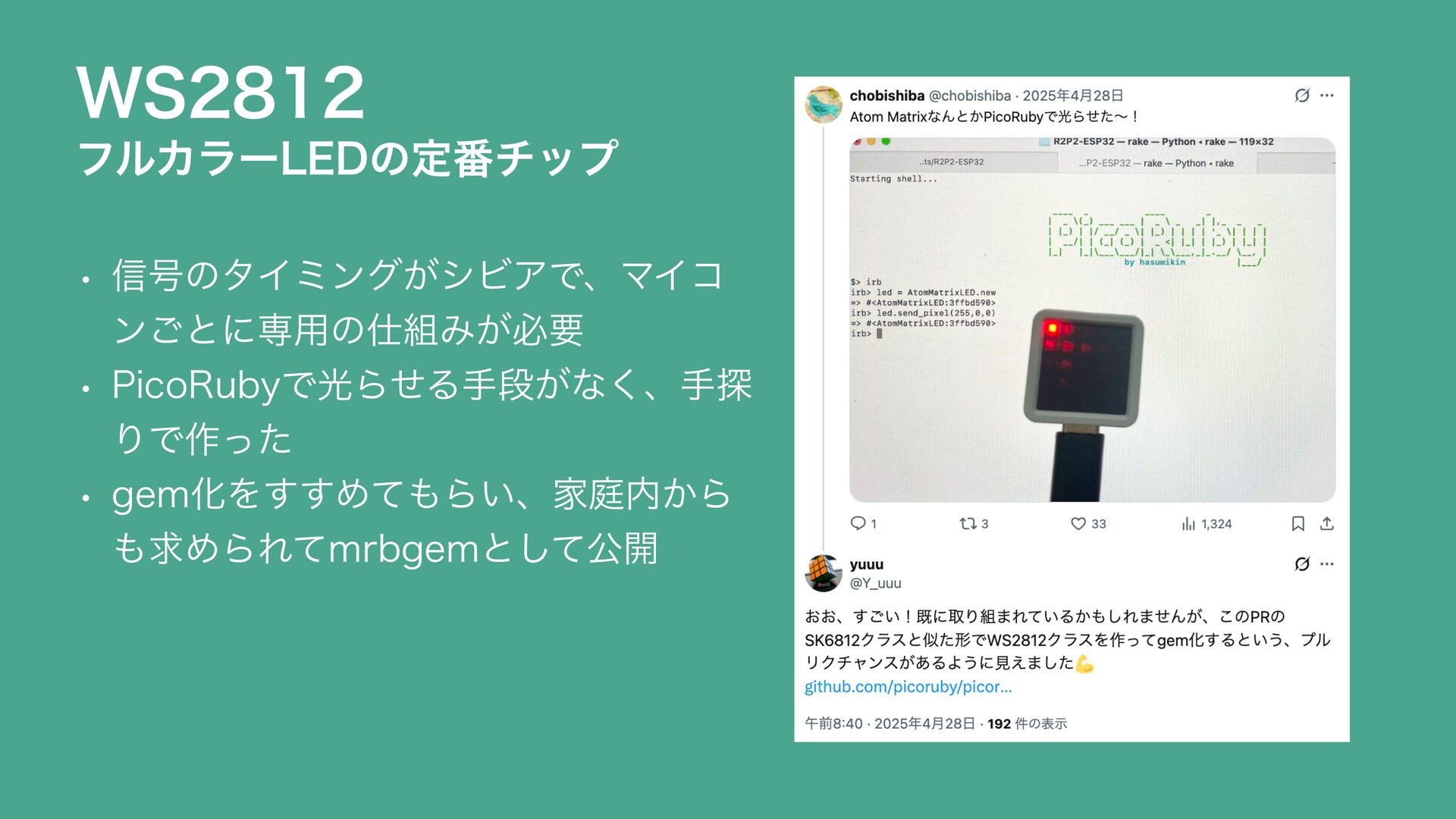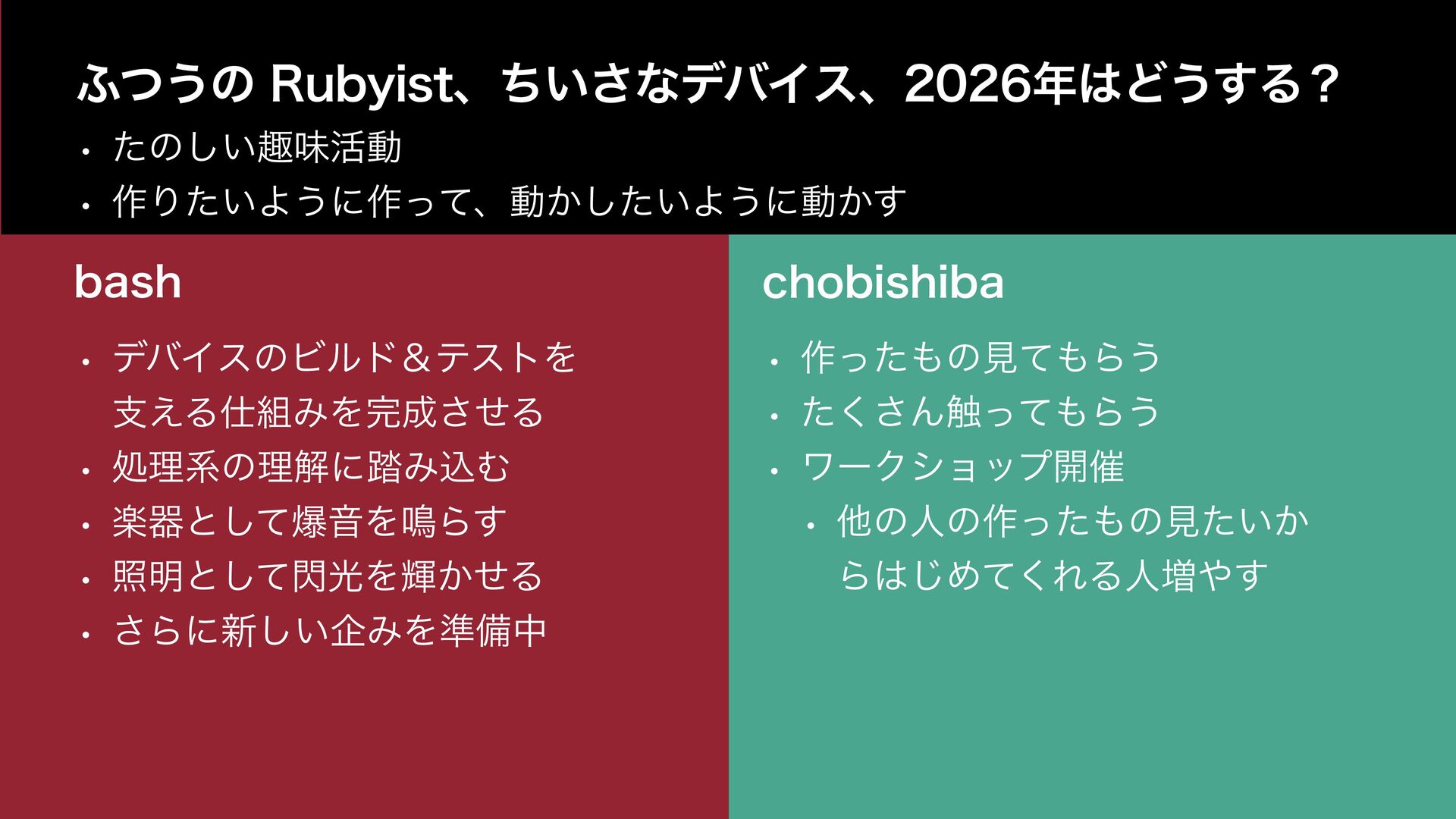 2025 年、爆発的ブームの PicoRuby。こしば家は総出で登壇・展示・mrbgem 開発などに飛び回っています。 きっかけ、モチベーション、協力分担といったご家庭コミュニティー活動の背景を紹介します。