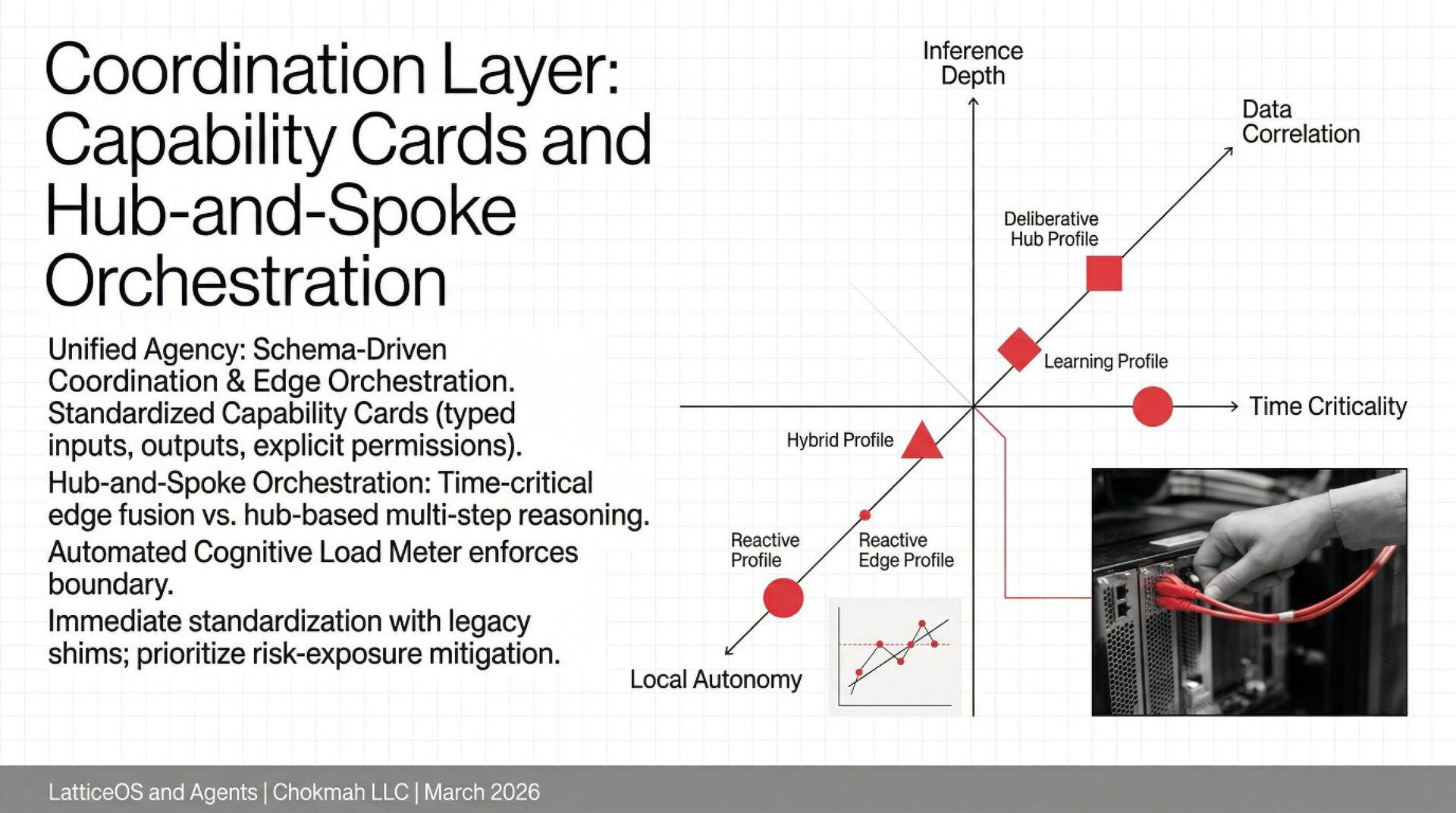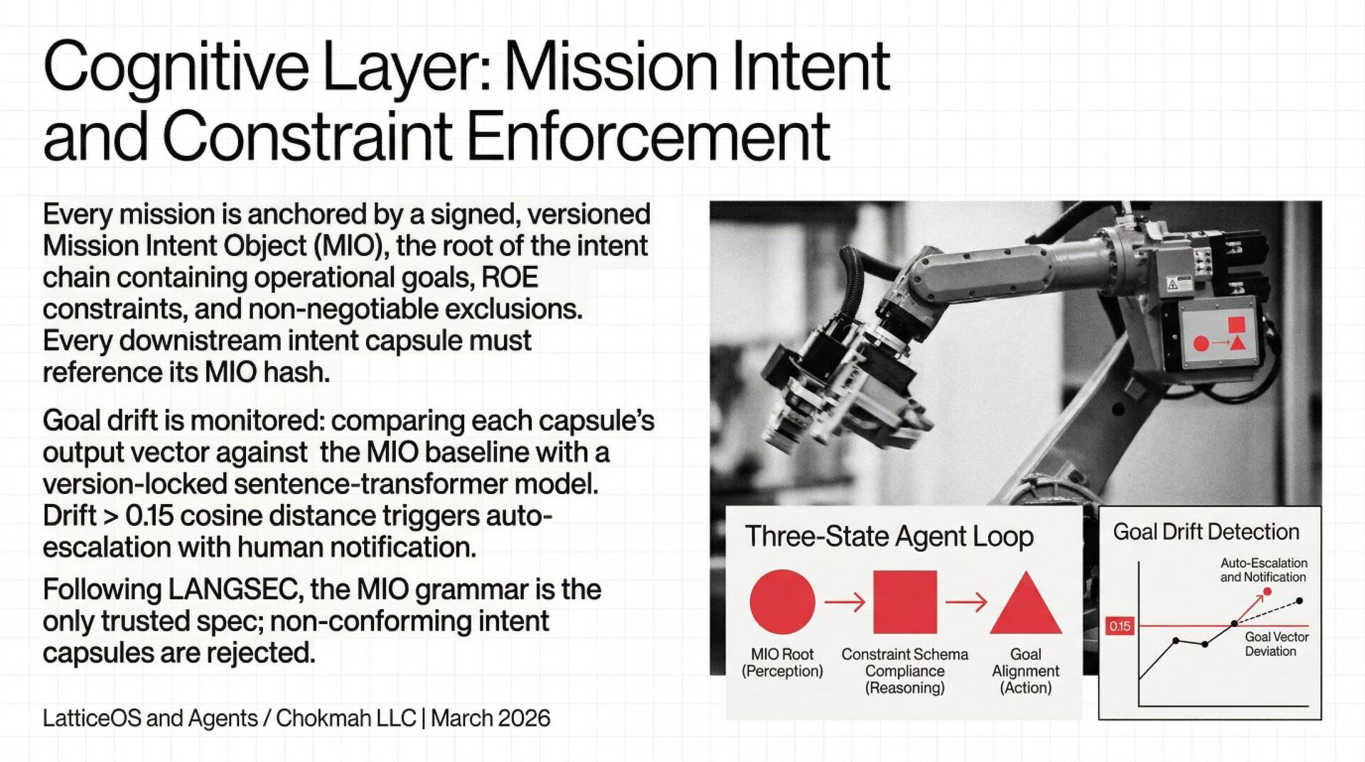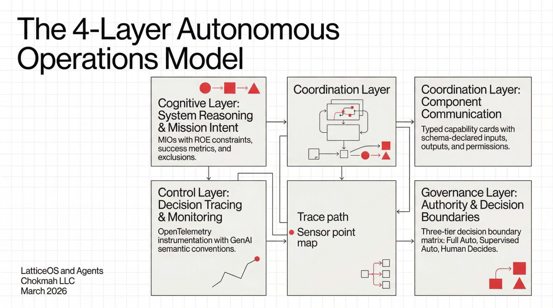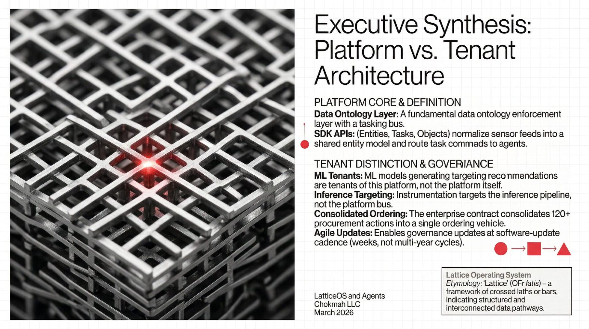 LatticeOS is fundamentally a data ontology enforcement layer with a tasking bus, not an AI operating system. The SDK's primary APIs (Entities, Tasks, Objects) normalize sensor feeds into a shared entity model and route task commands to agents. ML models that generate targeting recommendations are tenants of this platform, not the platform itself. This distinction transforms the governance problem: instrumentation targets the inference pipeline, not the platform bus. The $20B enterprise contract consolidates 120+ procurement actions into a single ordering vehicle, enabling governance updates at software-update cadence (weeks, not multi-year cycles).