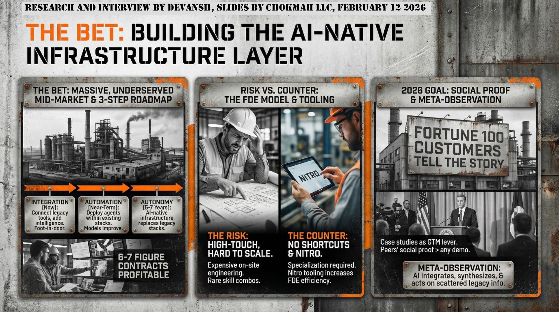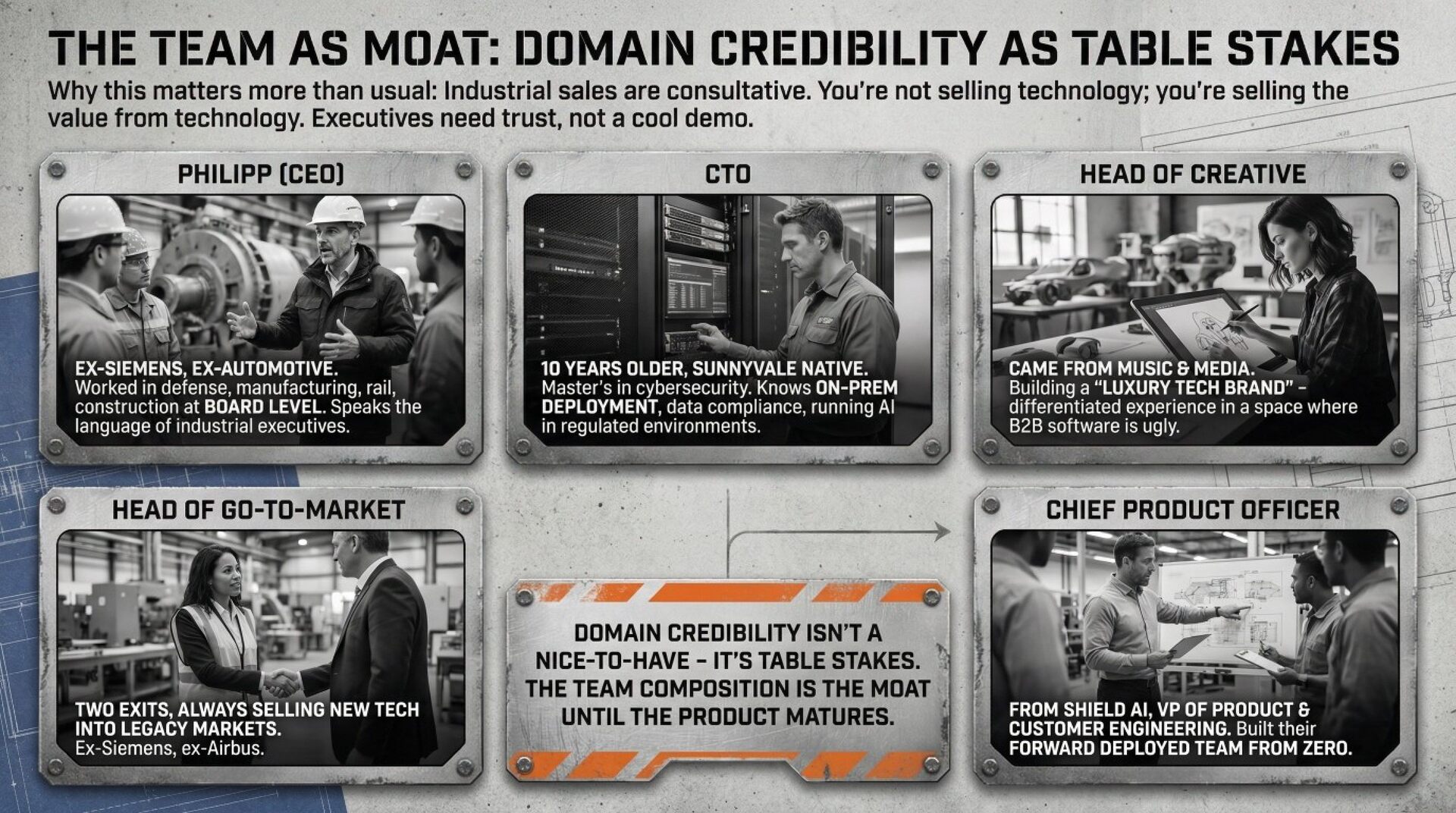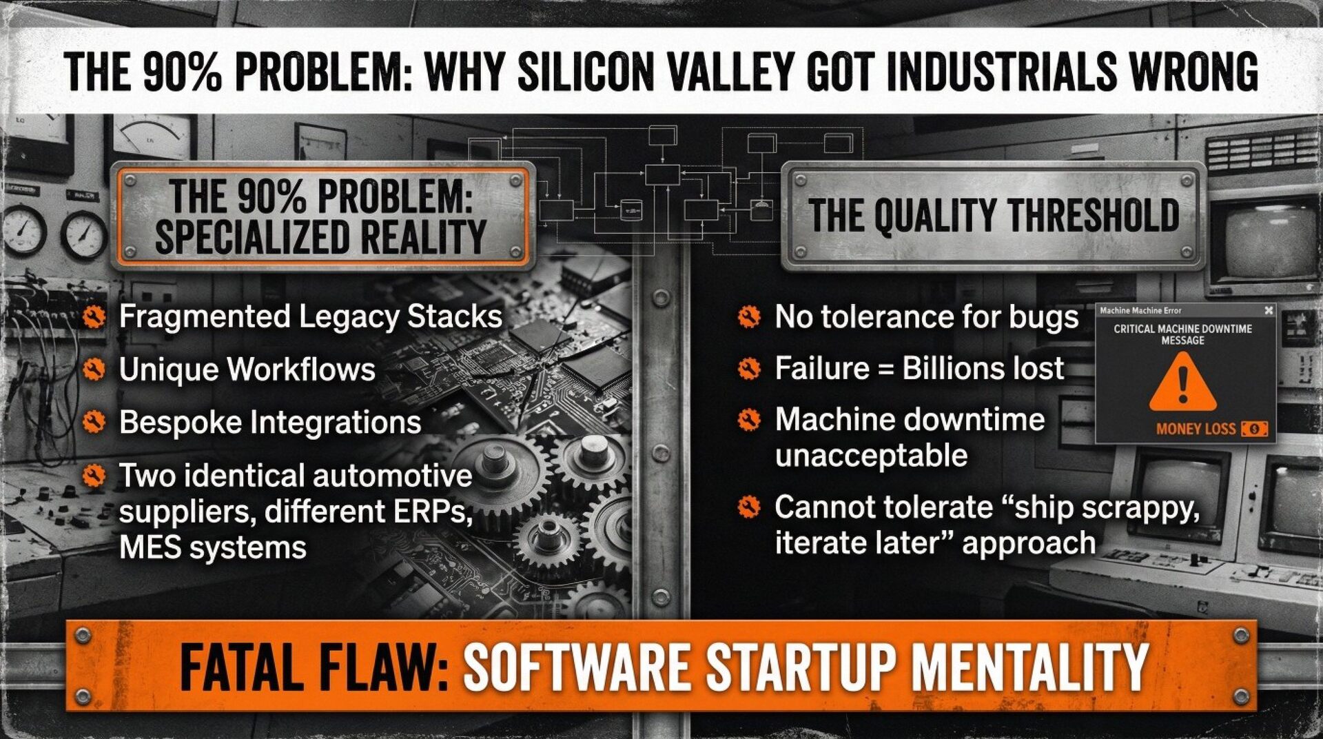 The real unlock is integration. Industrial data lives in fragmented legacy systems: ERPs, MES platforms, Excel sheets, paper workflows. Pre-AI software demanded humans bridge these gaps. Now AI agents can unify, reason across, and act on this scattered information autonomously. This is "brownfield digitization": extracting value from existing infrastructure without rip-and-replace. The moat is trust. Industrial buyers purchase from teams who speak their language, understand their risk tolerance, and deliver with industrial-grade reliability. The winners won't be those with the best models, but those who best tailor raw AI capabilities to messy, high-stakes operational realities