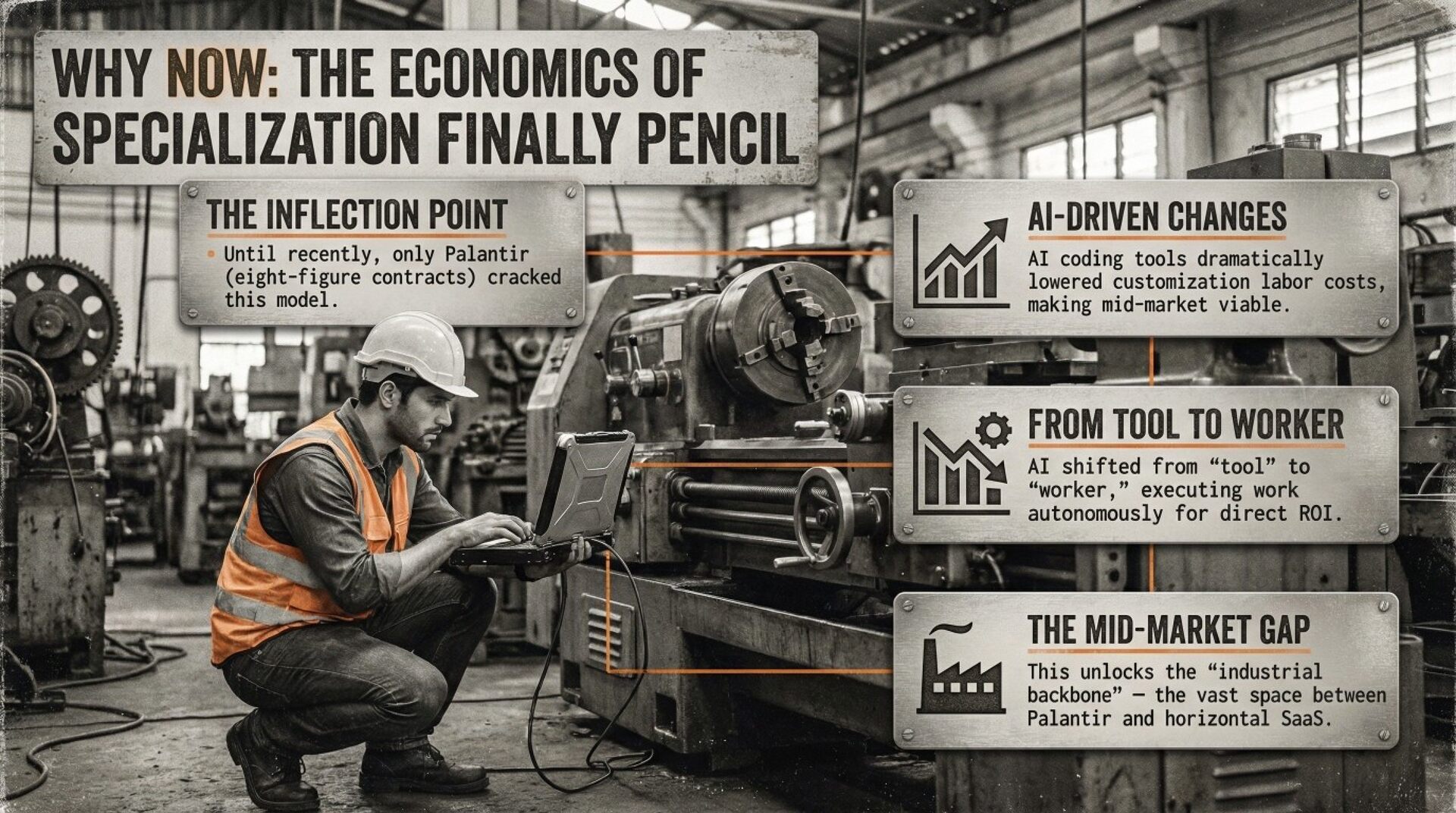 Industrial software failed for decades because 90% of problems are specialized ie custom stacks, unique workflows, zero tolerance for downtime. Horizontal SaaS can't handle this heterogeneity; Palantir could only serve giants with eight-figure budgets. Now AI changes the economics: coding tools slash customization costs, and agents automate work rather than assist it.