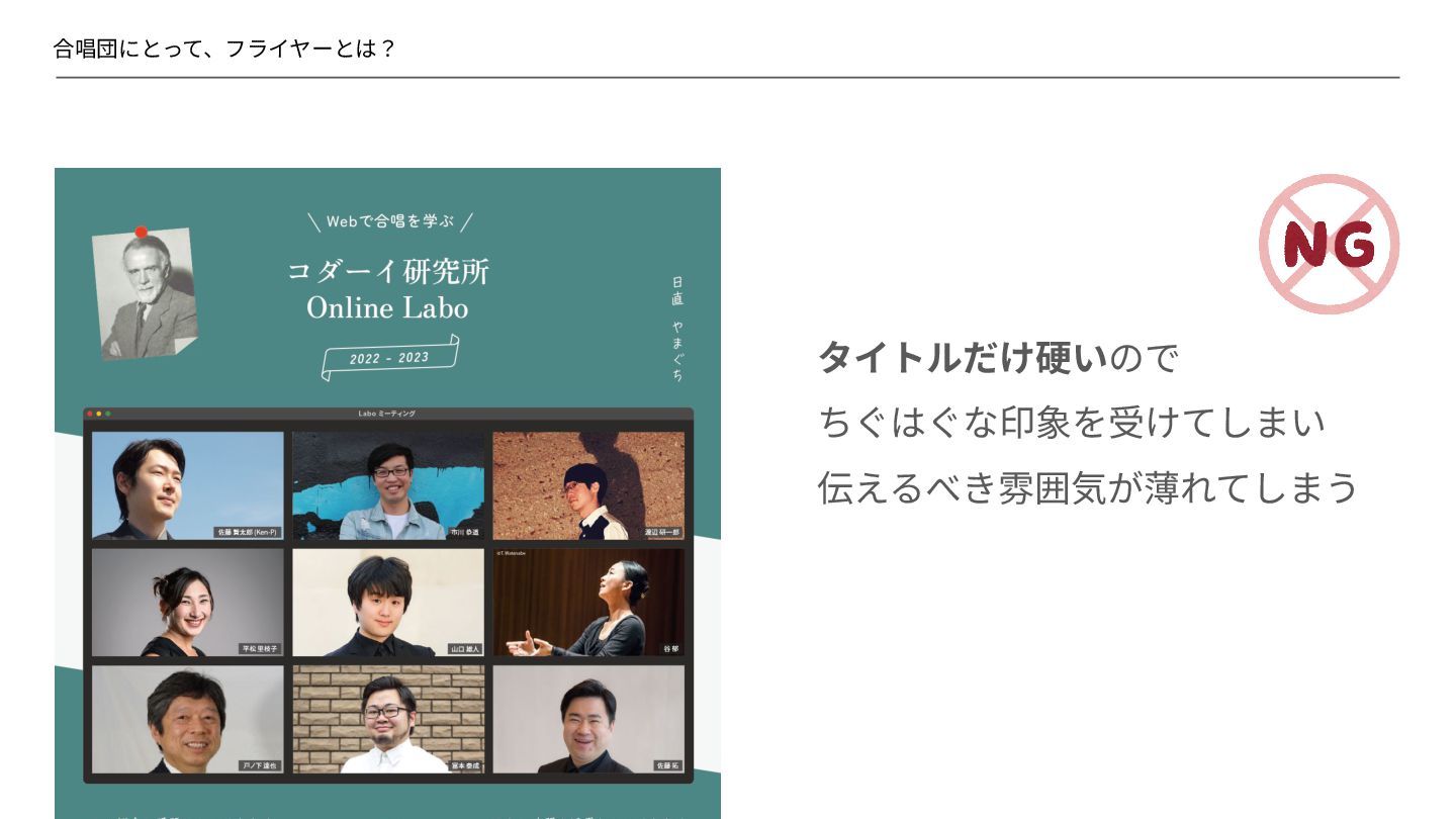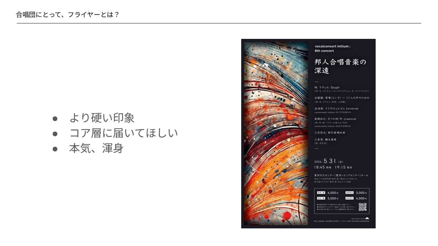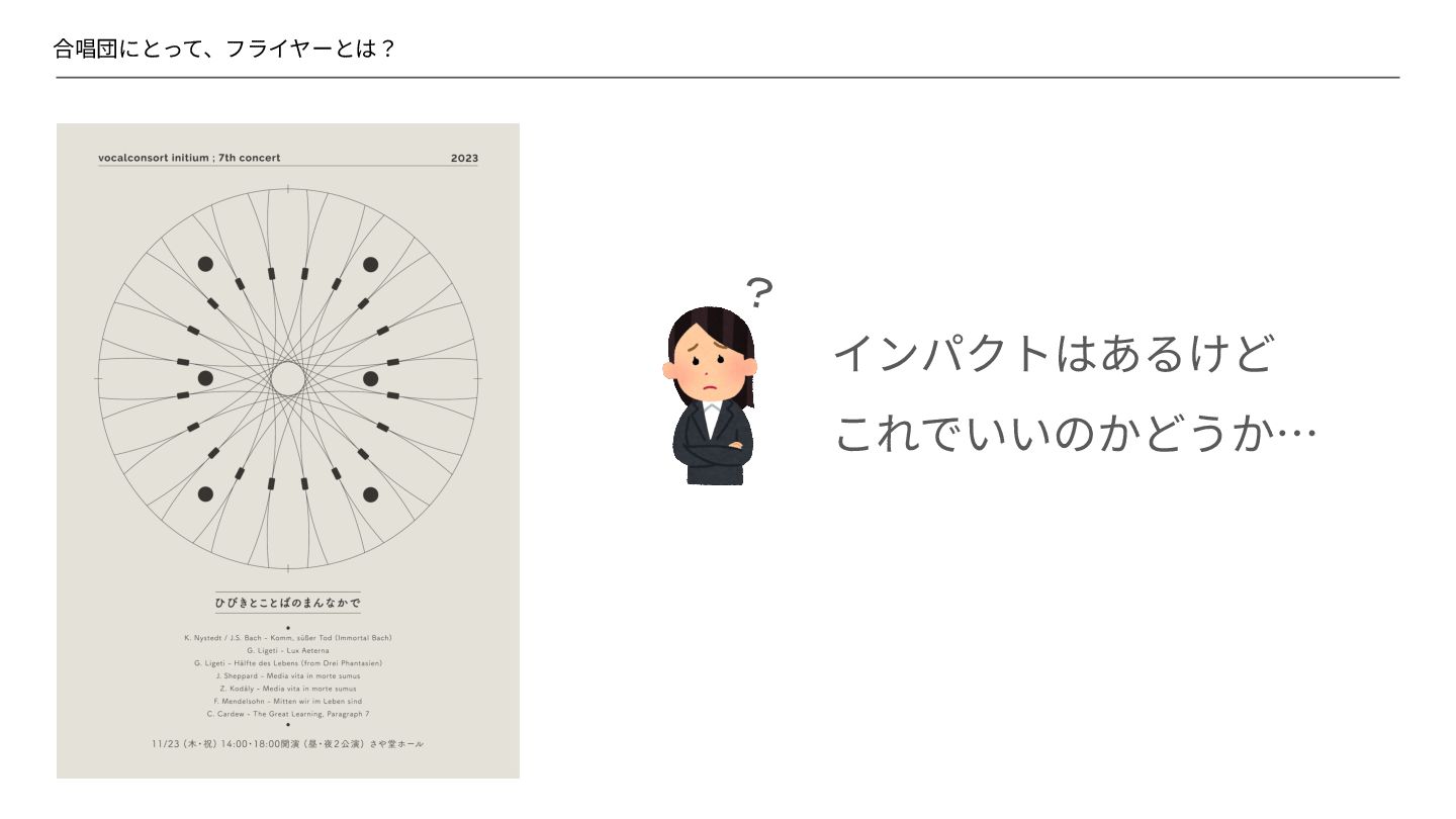 合唱団にとって、フライヤーとは? タイトルだけ硬いので ちぐはぐな印象を受けてしまい 伝えるべき雰囲気が薄れてしまう