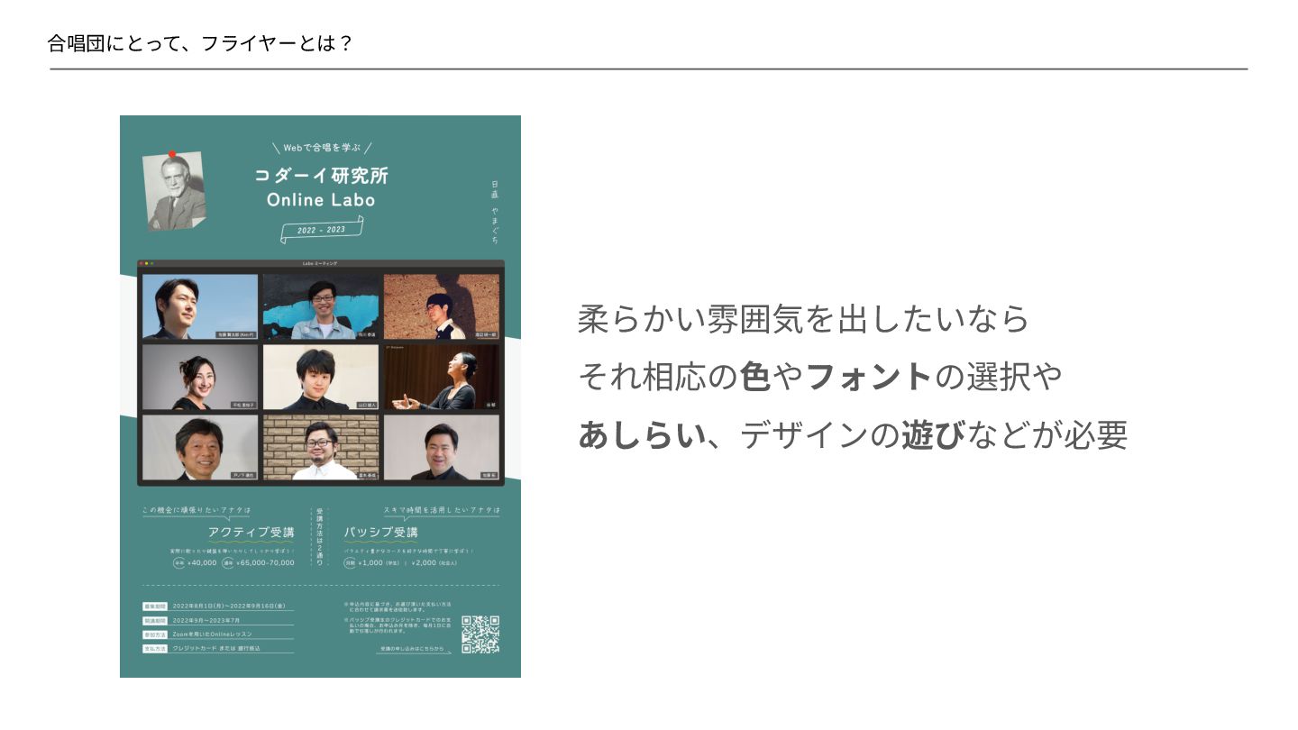 合唱団にとって、フライヤーとは? 柔らかい雰囲気を出したいなら それ相応の⾊やフォントの選択や あしらい、デザインの遊びなどが必要