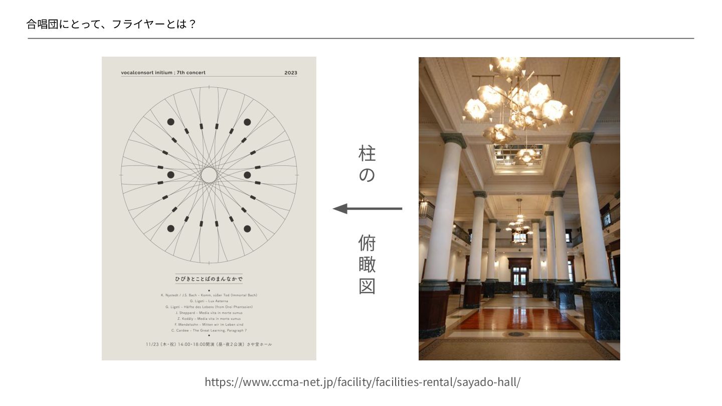 合唱団にとって、フライヤーとは? https://www.ccma-net.jp/facility/facilities-rental/sayado-hall/ 柱 の 俯 瞰 図