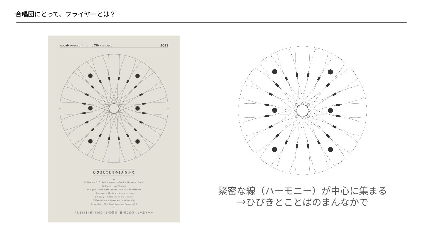 合唱団にとって、フライヤーとは? 緊密な線(ハーモニー)が中⼼に集まる →ひびきとことばのまんなかで