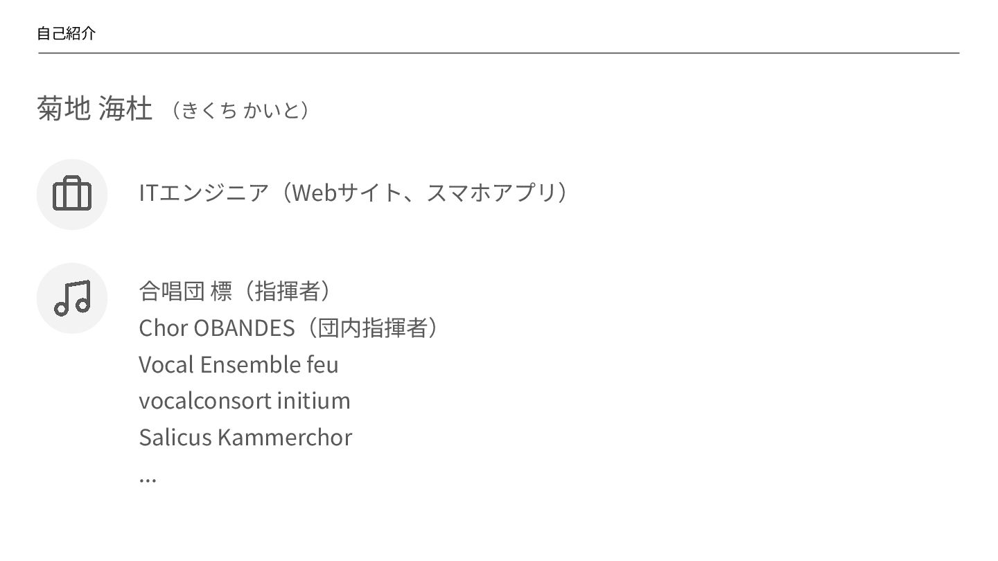 ⾃⼰紹介 菊地 海杜 (きくち かいと) ITエンジニア(Webサイト、スマホアプリ) 合唱団 標(指揮者) Chor OBANDES(団内指揮者)