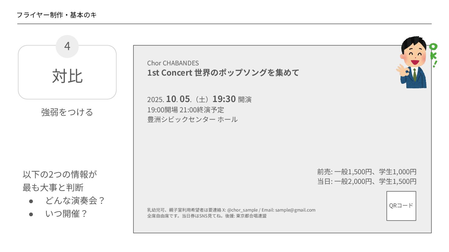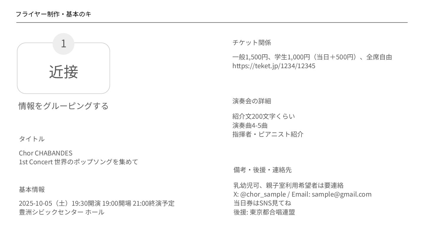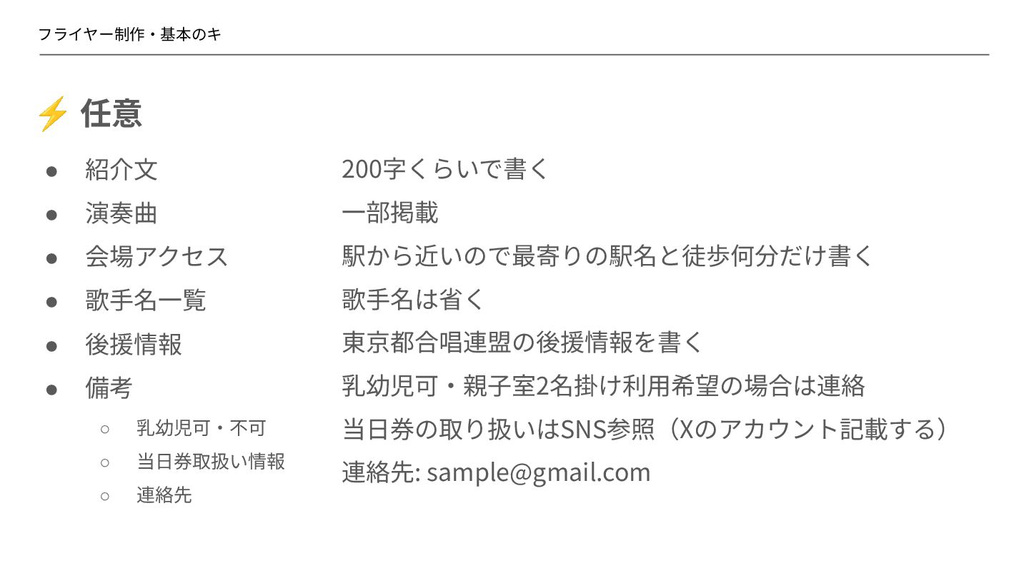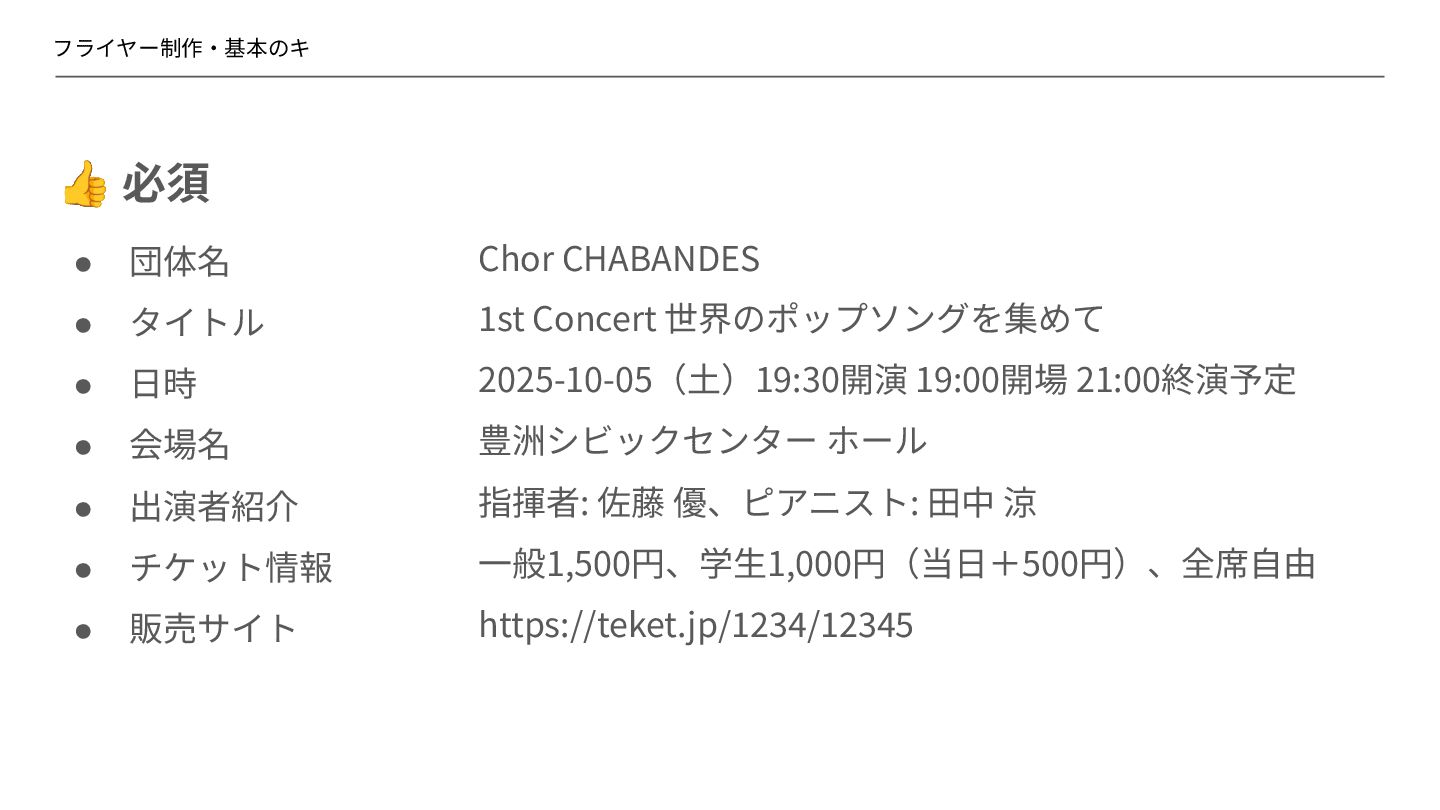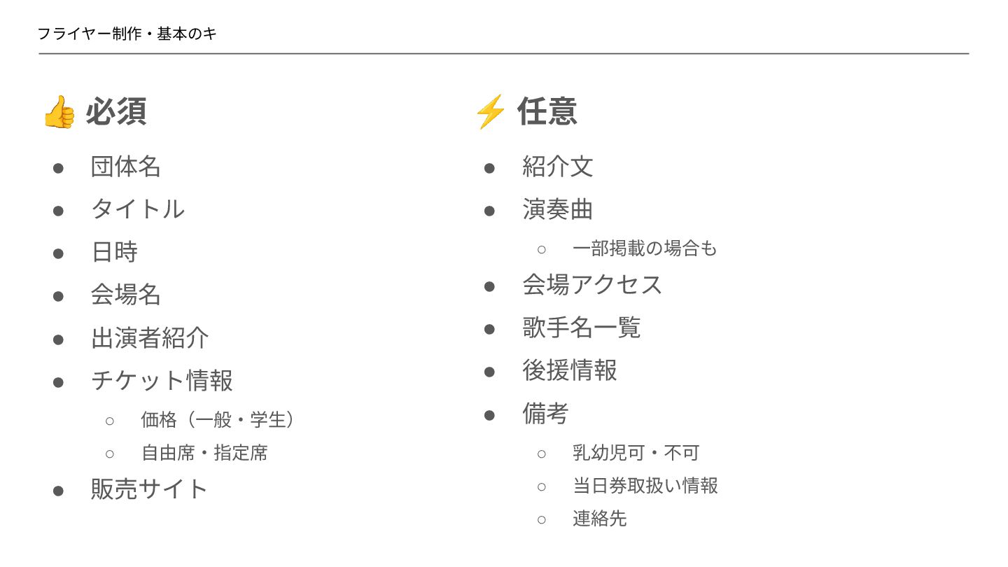 • 歌⼿名⼀覧 • 後援情報 • 備考 ◦ 乳幼児可‧不可 ◦ 当⽇券取扱い情報 ◦ 連絡先 フライヤー制作‧基本のキ 👍 必須 • 団体名 • タイトル • ⽇時 • 会場名 • 出演者紹介 • チケット情報 ◦ 価格(⼀般‧学⽣) ◦ ⾃由席‧指定席 • 販売サイト