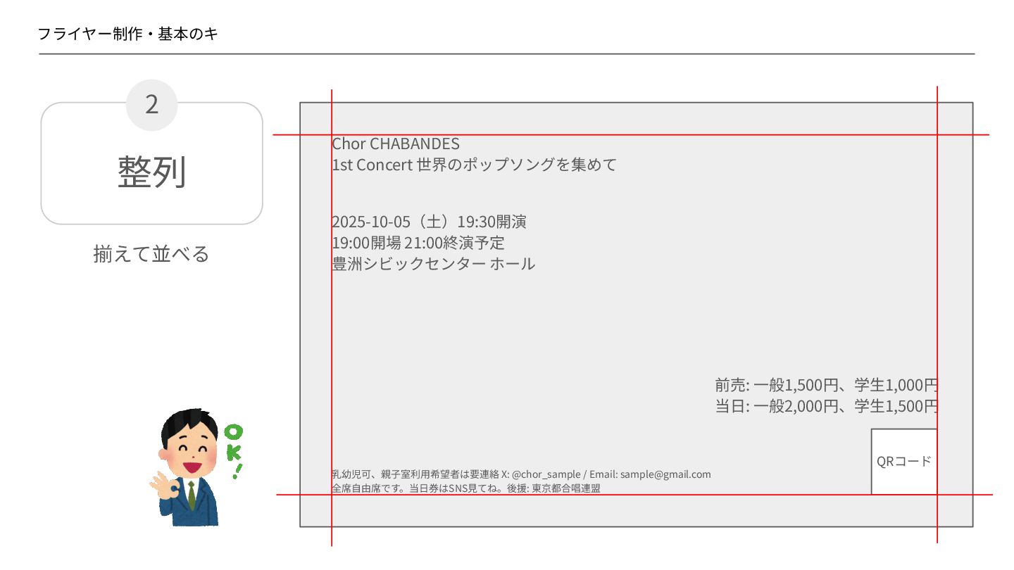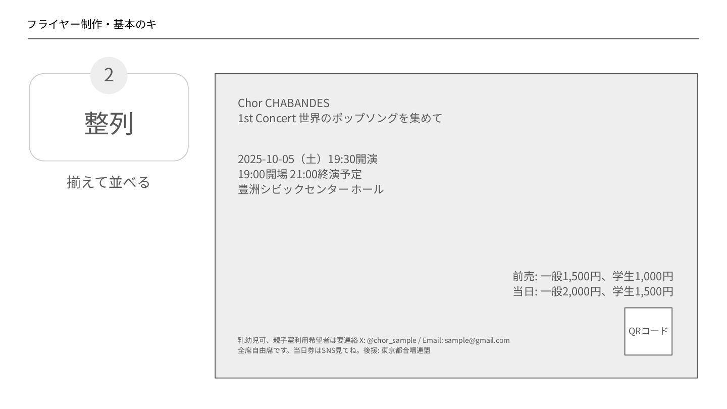 フライヤー制作‧基本のキ 2 整列 揃えて並べる 前売: ⼀般1,500円、学⽣1,000円 当⽇: ⼀般2,000円、学⽣1,500円 Chor CHABANDES