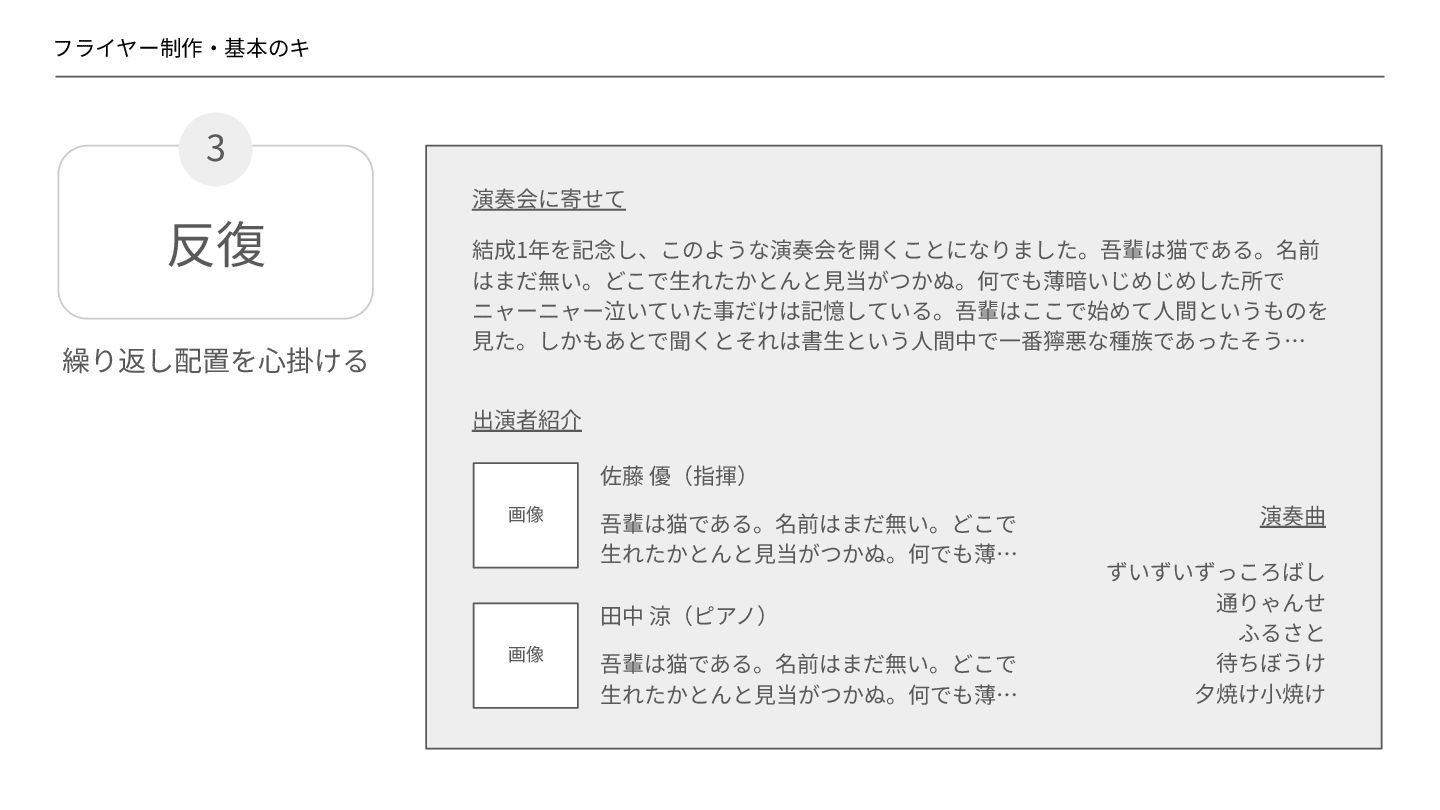 吾輩は猫である。名前はまだ無い。どこで ⽣れたかとんと⾒当がつかぬ。何でも薄… 結成1年を記念し、このような演奏会を開くことになりました。吾輩は猫である。名前 はまだ無い。どこで⽣れたかとんと⾒当がつかぬ。何でも薄暗いじめじめした所で ニャーニャー泣いていた事だけは記憶している。吾輩はここで始めて⼈間というものを ⾒た。しかもあとで聞くとそれは書⽣という⼈間中で⼀番獰悪な種族であったそう… フライヤー制作‧基本のキ 3 反復 繰り返し配置を⼼掛ける