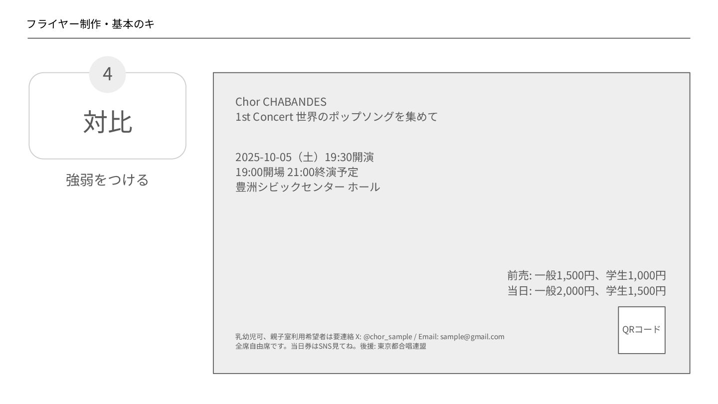 フライヤー制作‧基本のキ 4 対⽐ 前売: ⼀般1,500円、学⽣1,000円 当⽇: ⼀般2,000円、学⽣1,500円 強弱をつける Chor CHABANDES