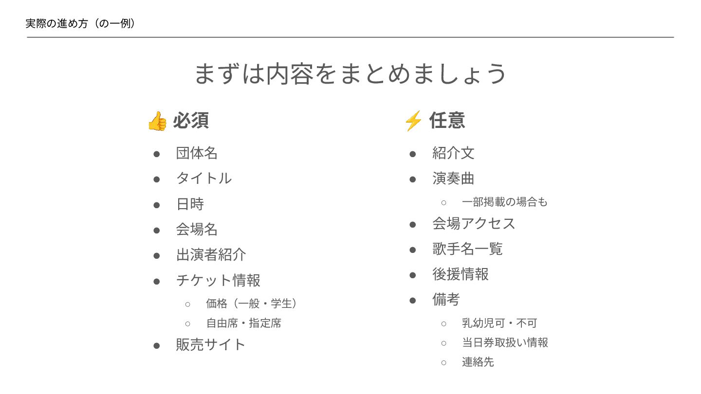 会場アクセス • 歌⼿名⼀覧 • 後援情報 • 備考 ◦ 乳幼児可‧不可 ◦ 当⽇券取扱い情報 ◦ 連絡先 👍 必須 • 団体名 • タイトル • ⽇時 • 会場名 • 出演者紹介 • チケット情報 ◦ 価格(⼀般‧学⽣) ◦ ⾃由席‧指定席 • 販売サイト まずは内容をまとめましょう