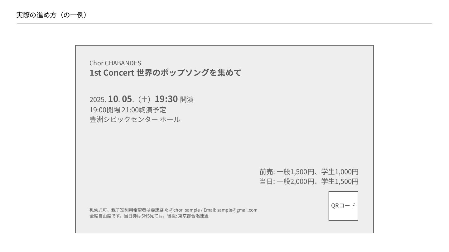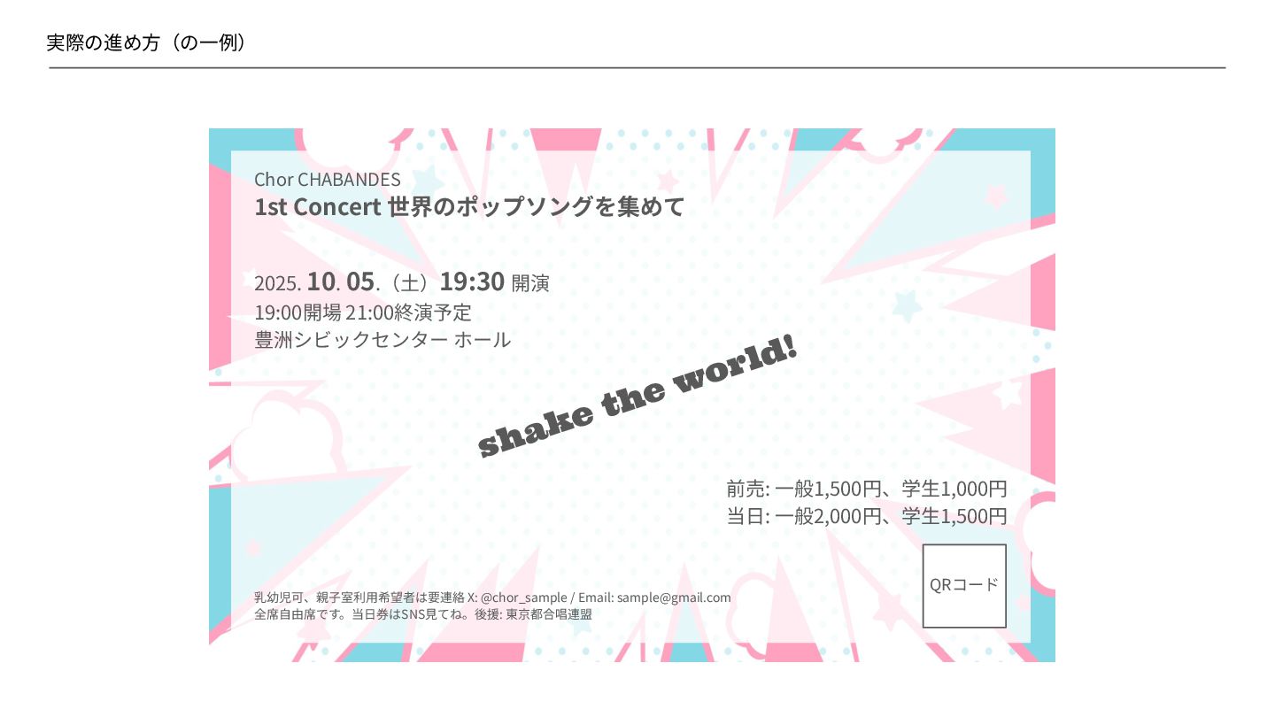 実際の進め⽅(の⼀例) 前売: ⼀般1,500円、学⽣1,000円 当⽇: ⼀般2,000円、学⽣1,500円 Chor CHABANDES 1st Concert 世界のポップソングを集めて