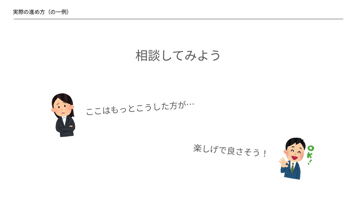 実際の進め⽅(の⼀例) 相談してみよう ここはもっとこうした⽅が… 楽しげで良さそう!