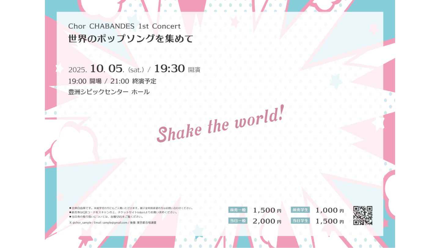 1st Concert 世界のポップソングを集めて 2025-10-05(⼟)19:30開演 19:00開場 21:00終演予定 豊洲シビックセンター ホール 乳幼児可、親⼦室利⽤希望者は要連絡 X: @chor_sample / Email: