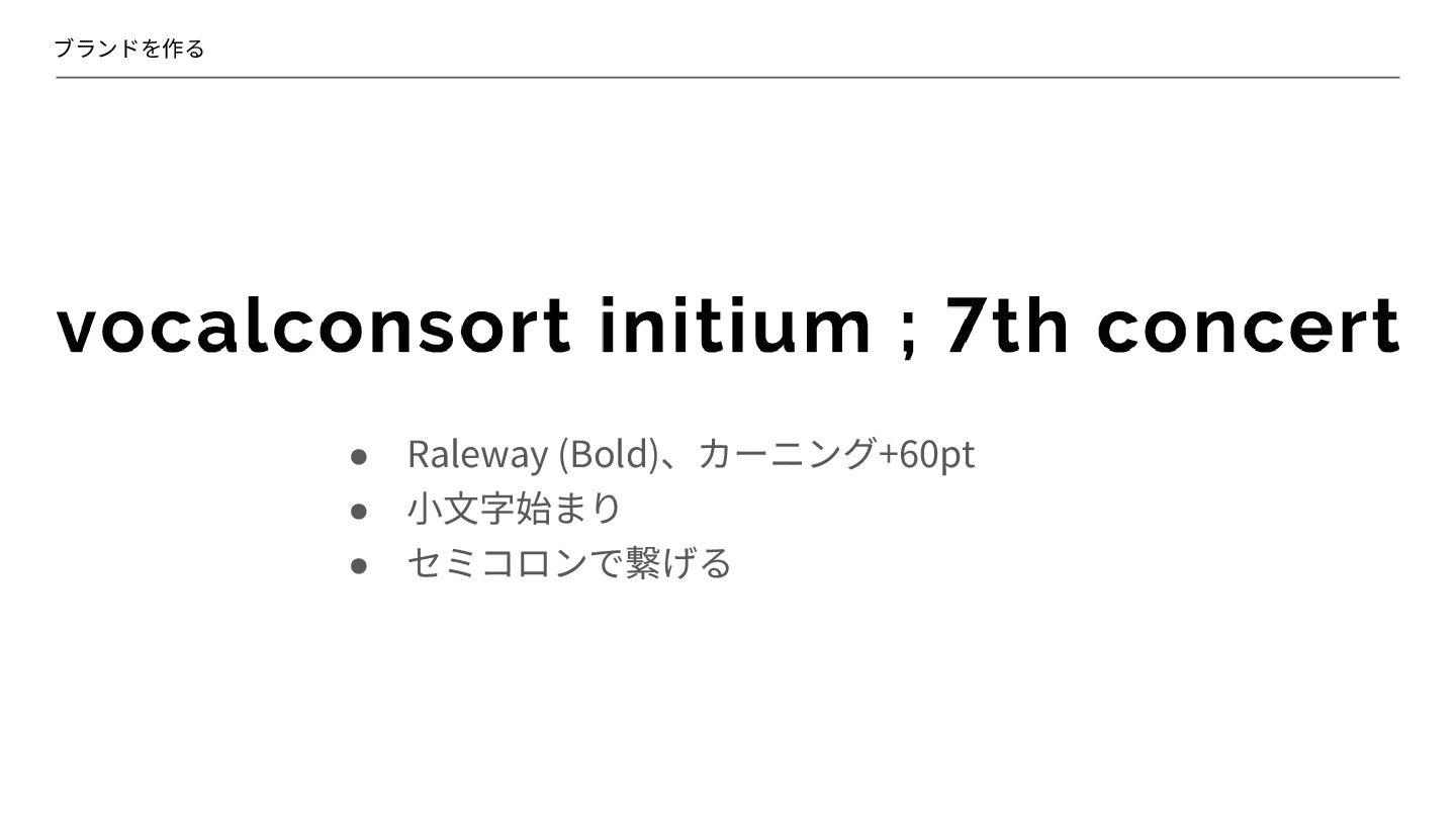 ブランドを作る • Raleway (Bold)、カーニング+60pt • ⼩⽂字始まり • セミコロンで繋げる