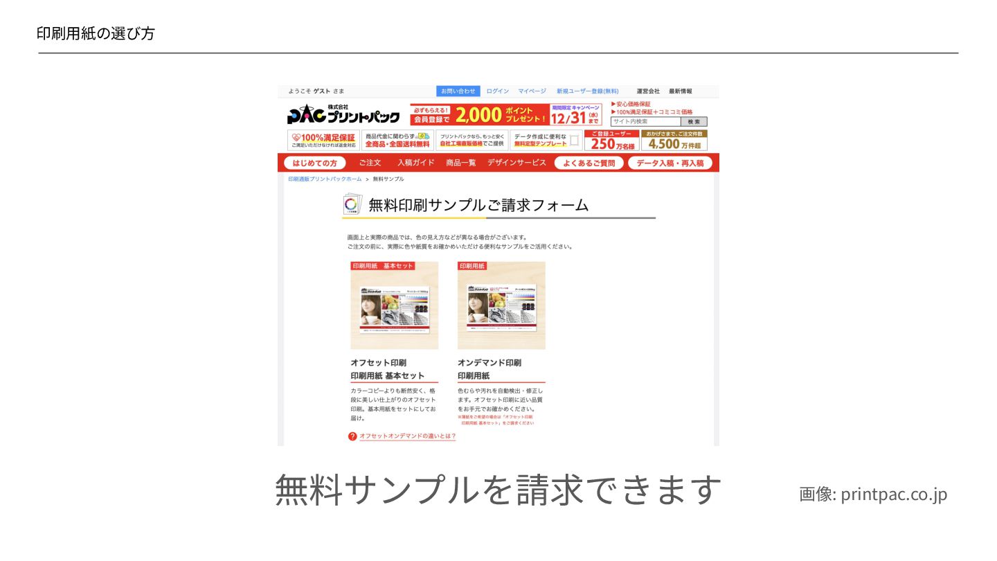 印刷⽤紙の選び⽅ 無料サンプルを請求できます 画像: printpac.co.jp