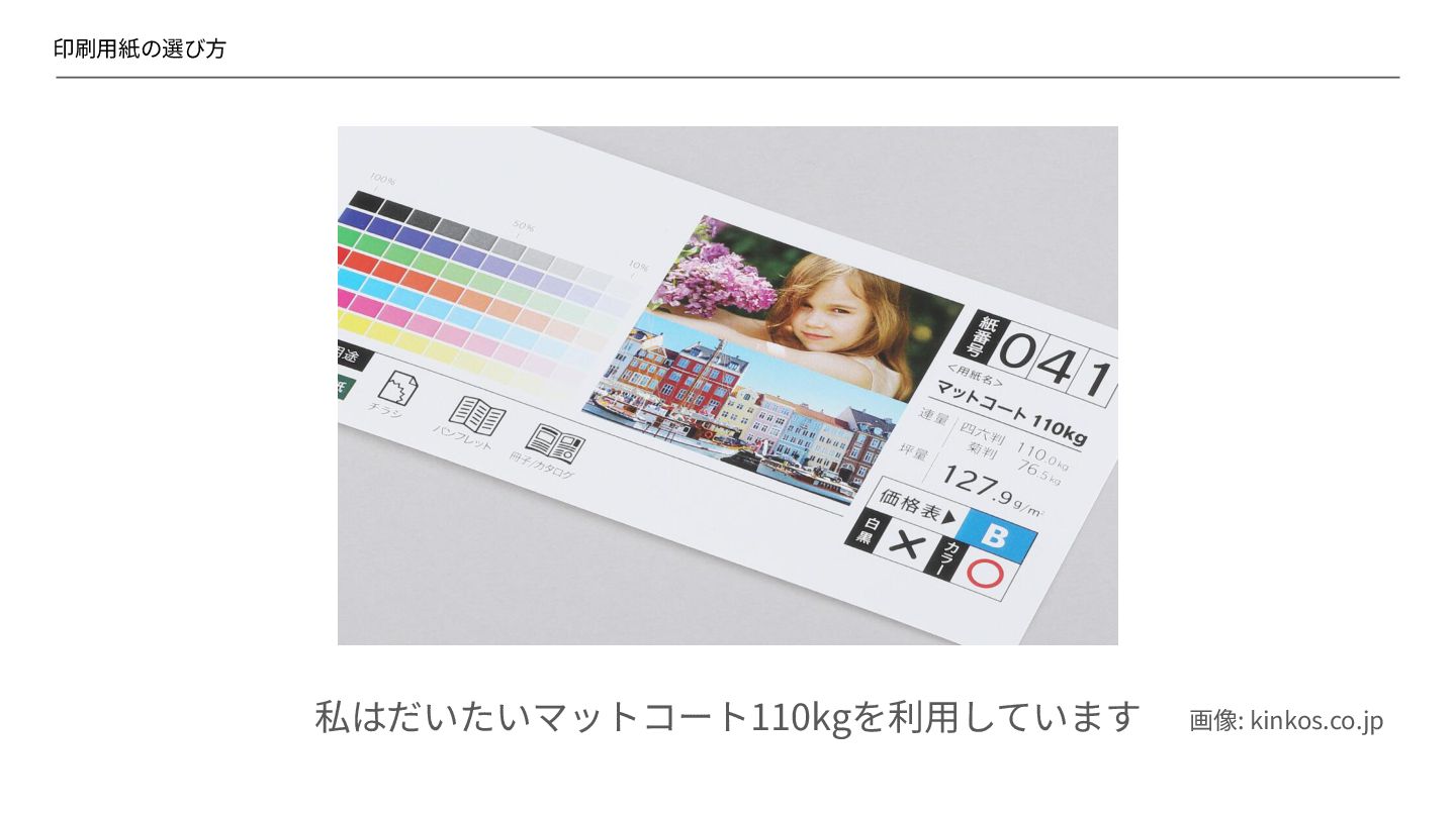 印刷⽤紙の選び⽅ 私はだいたいマットコート110kgを利⽤しています 画像: kinkos.co.jp