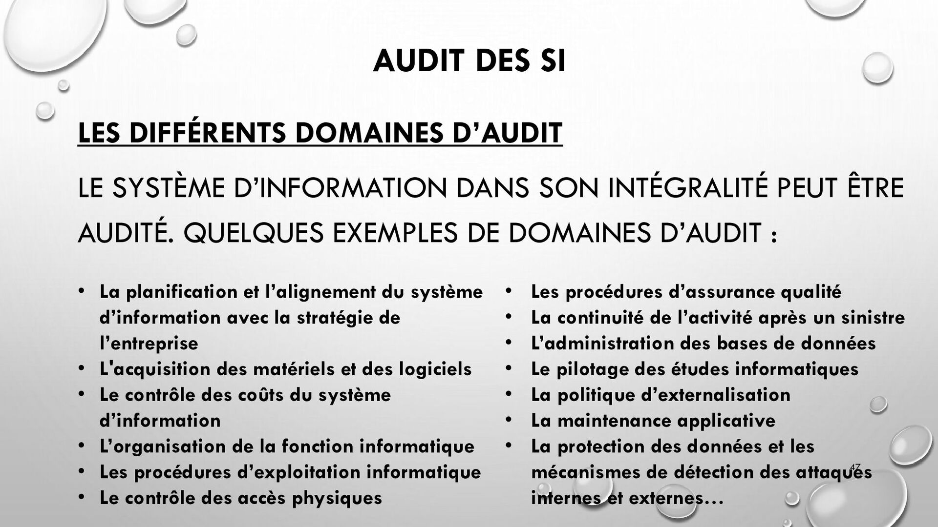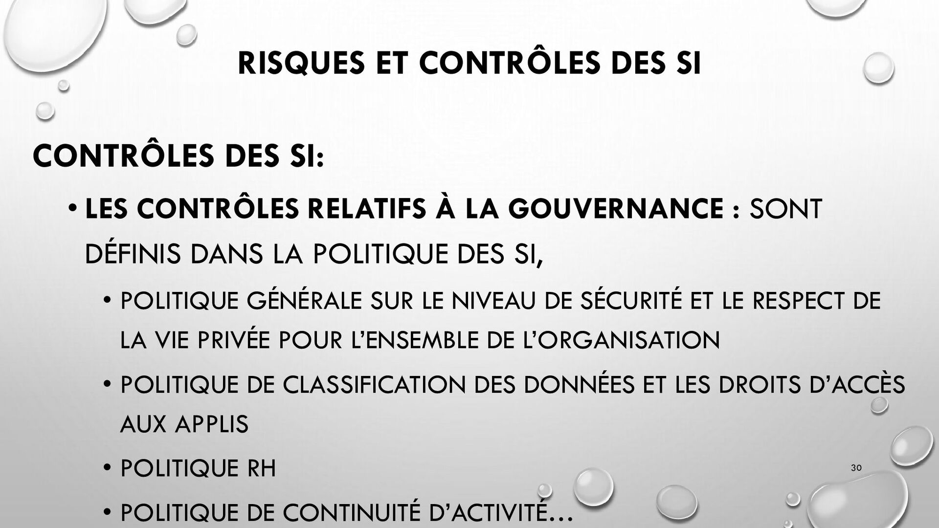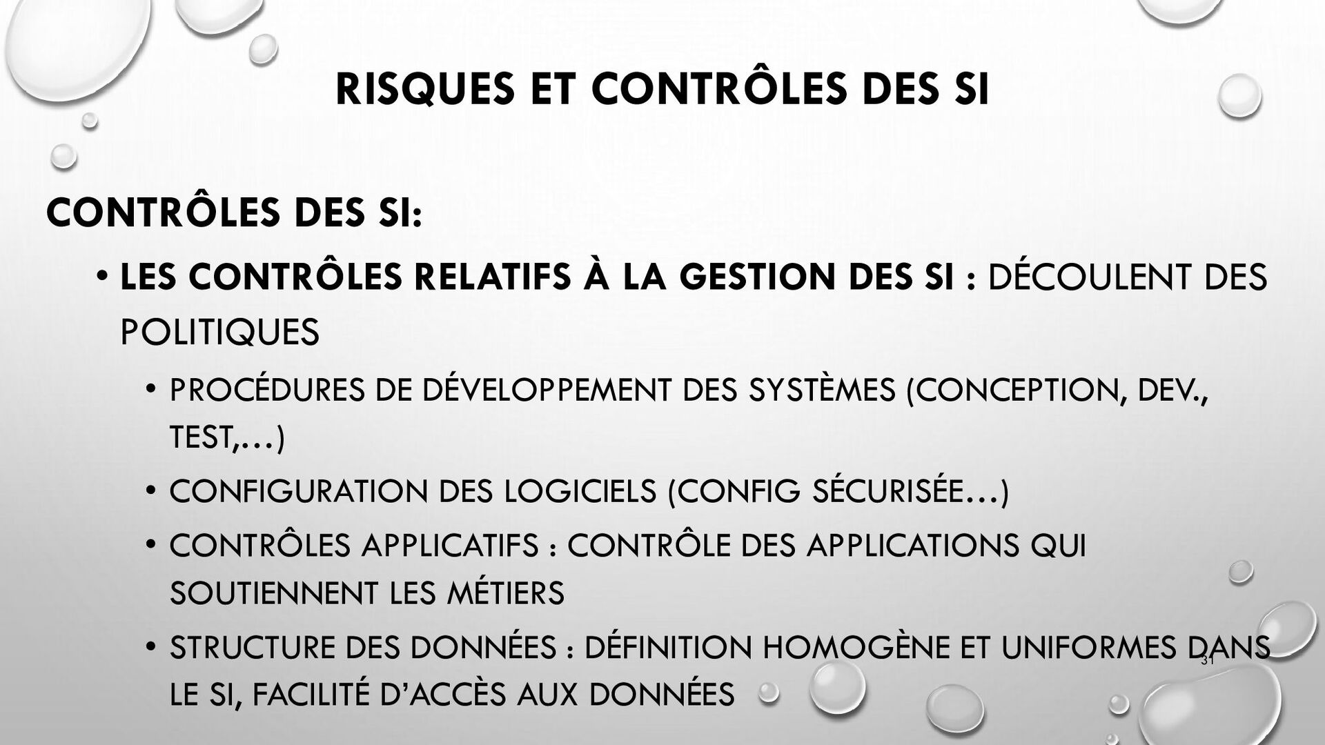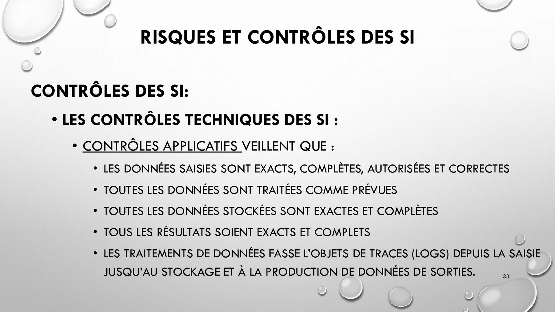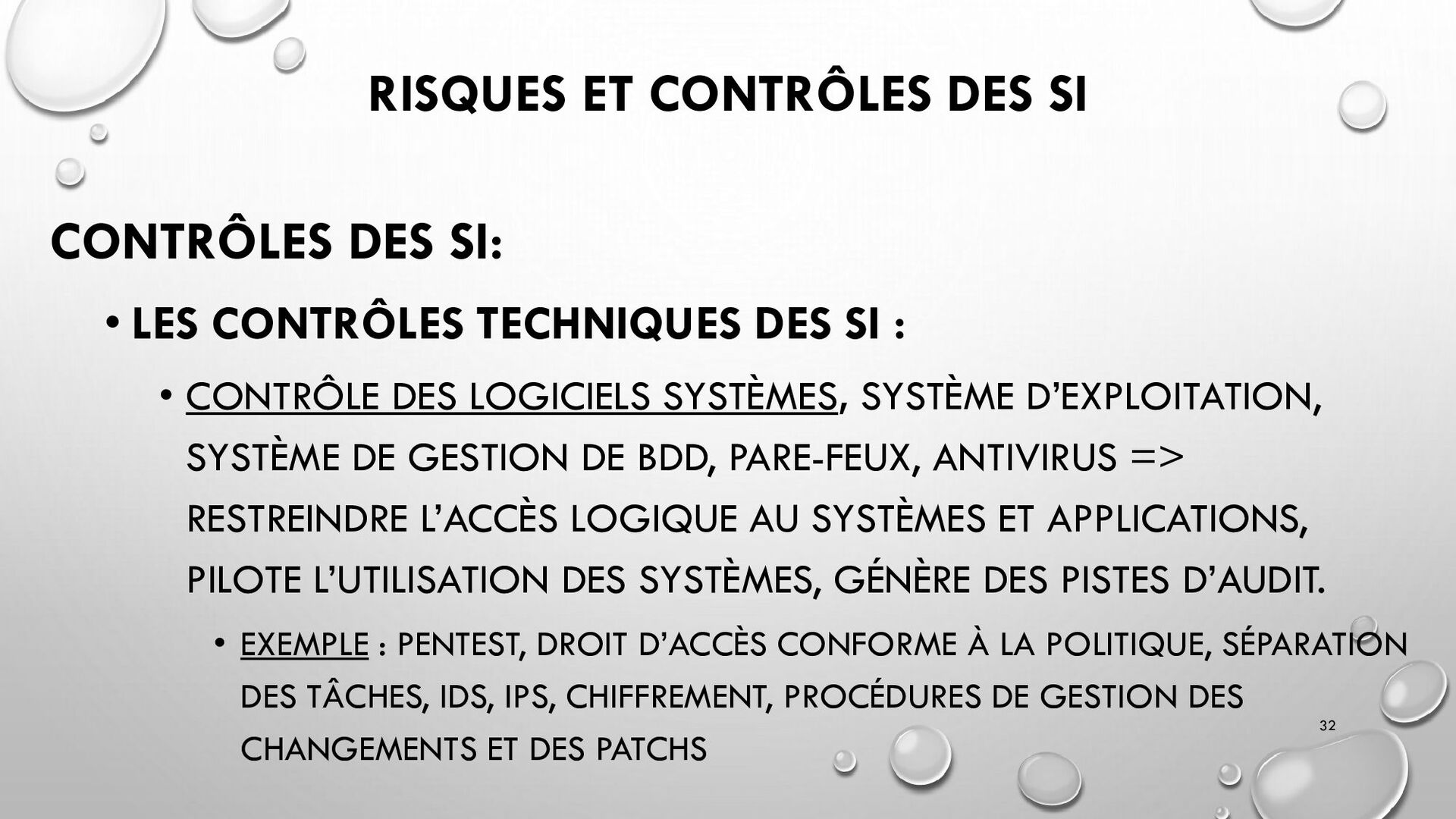 CONTRÔLES TECHNIQUES DES SI : • CONTRÔLE DES LOGICIELS SYSTÈMES, SYSTÈME D’EXPLOITATION, SYSTÈME DE GESTION DE BDD, PARE-FEUX, ANTIVIRUS => RESTREINDRE L’ACCÈS LOGIQUE AU SYSTÈMES ET APPLICATIONS, PILOTE L’UTILISATION DES SYSTÈMES, GÉNÈRE DES PISTES D’AUDIT. • EXEMPLE : PENTEST, DROIT D’ACCÈS CONFORME À LA POLITIQUE, SÉPARATION DES TÂCHES, IDS, IPS, CHIFFREMENT, PROCÉDURES DE GESTION DES CHANGEMENTS ET DES PATCHS 32