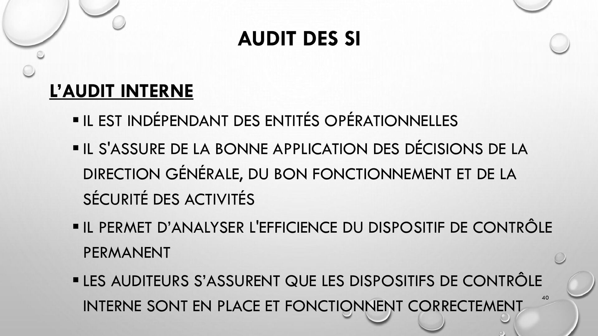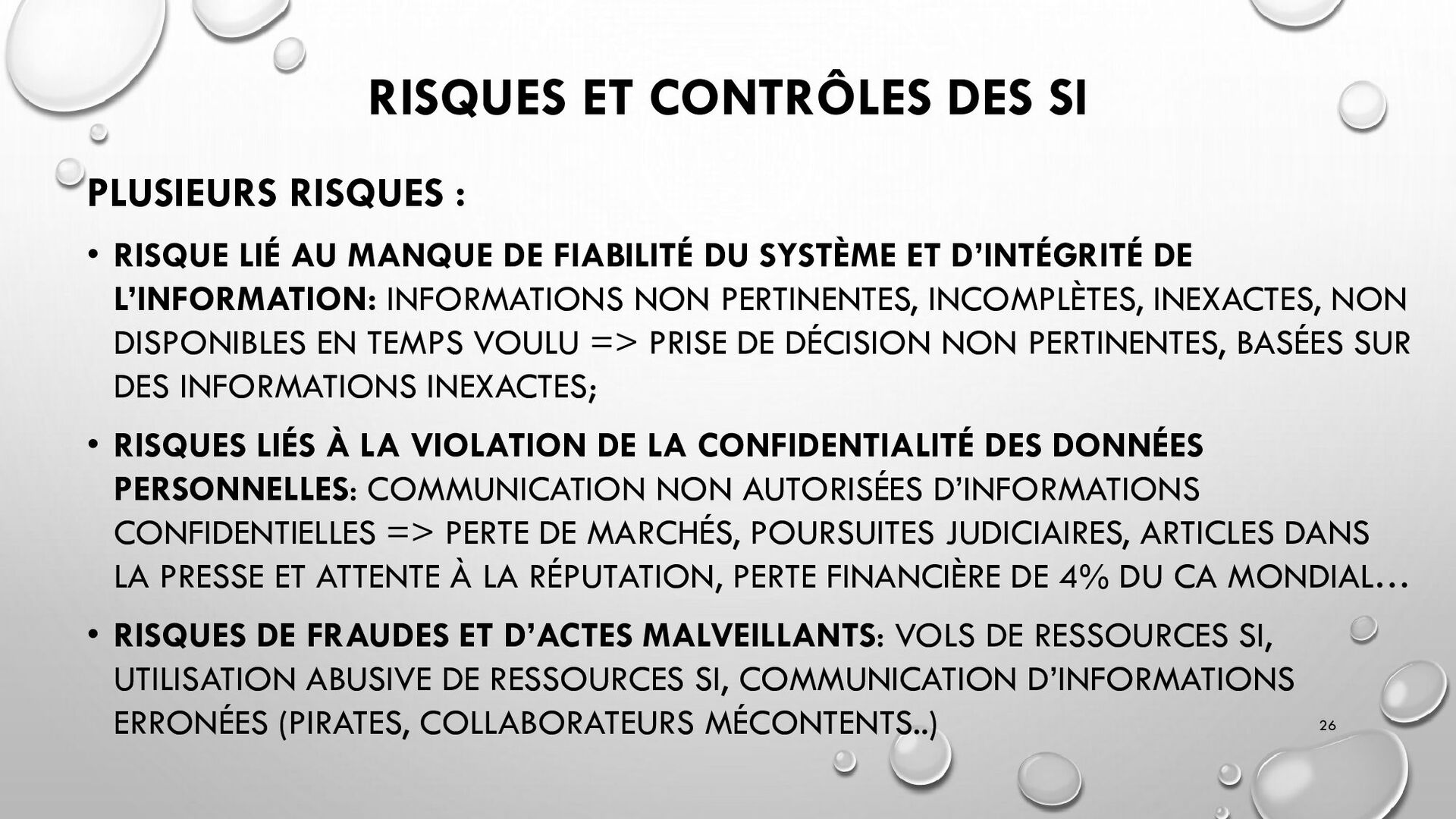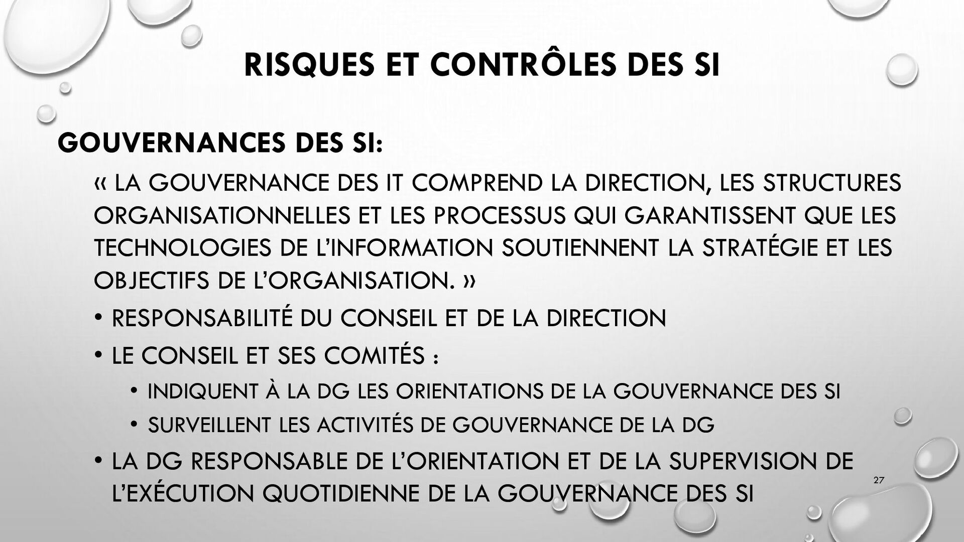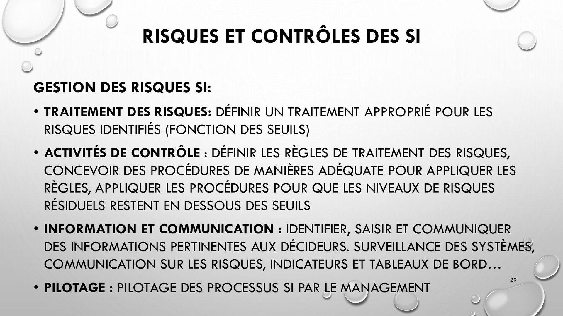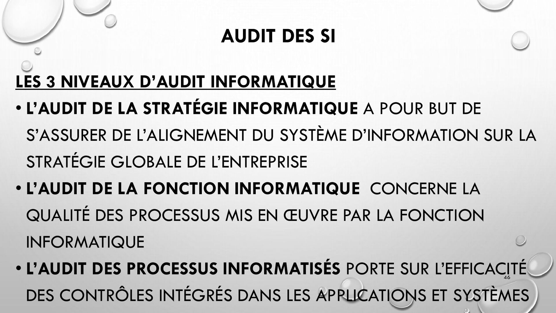 CONTRÔLES TECHNIQUES DES SI : • CONTRÔLE DES LOGICIELS SYSTÈMES, SYSTÈME D’EXPLOITATION, SYSTÈME DE GESTION DE BDD, PARE-FEUX, ANTIVIRUS => RESTREINDRE L’ACCÈS LOGIQUE AU SYSTÈMES ET APPLICATIONS, PILOTE L’UTILISATION DES SYSTÈMES, GÉNÈRE DES PISTES D’AUDIT. • EXEMPLE : PENTEST, DROIT D’ACCÈS CONFORME À LA POLITIQUE, SÉPARATION DES TÂCHES, IDS, IPS, CHIFFREMENT, PROCÉDURES DE GESTION DES CHANGEMENTS ET DES PATCHS 32