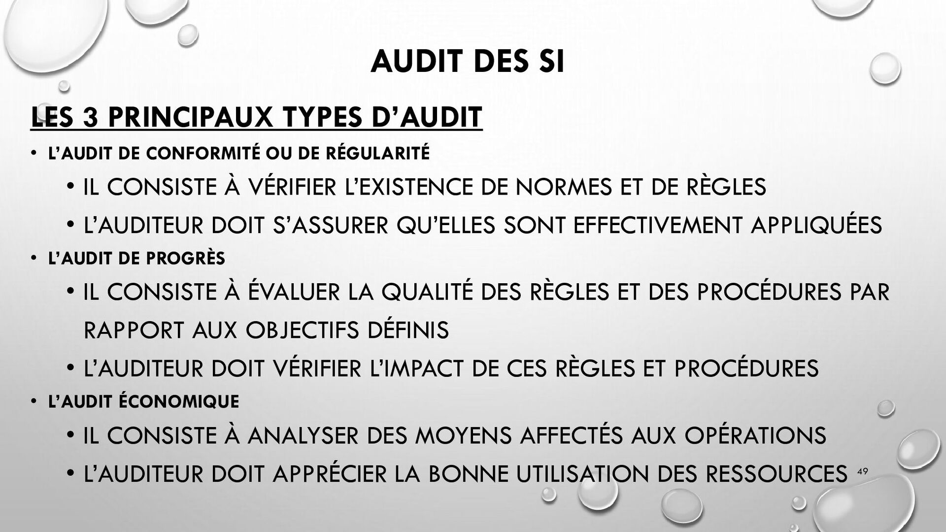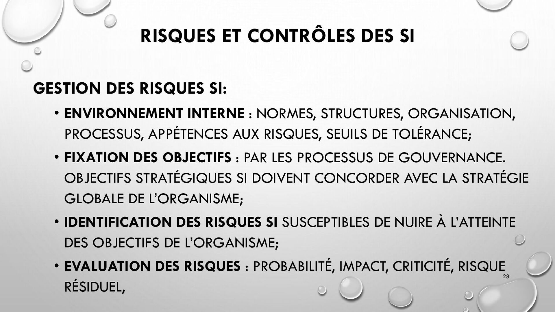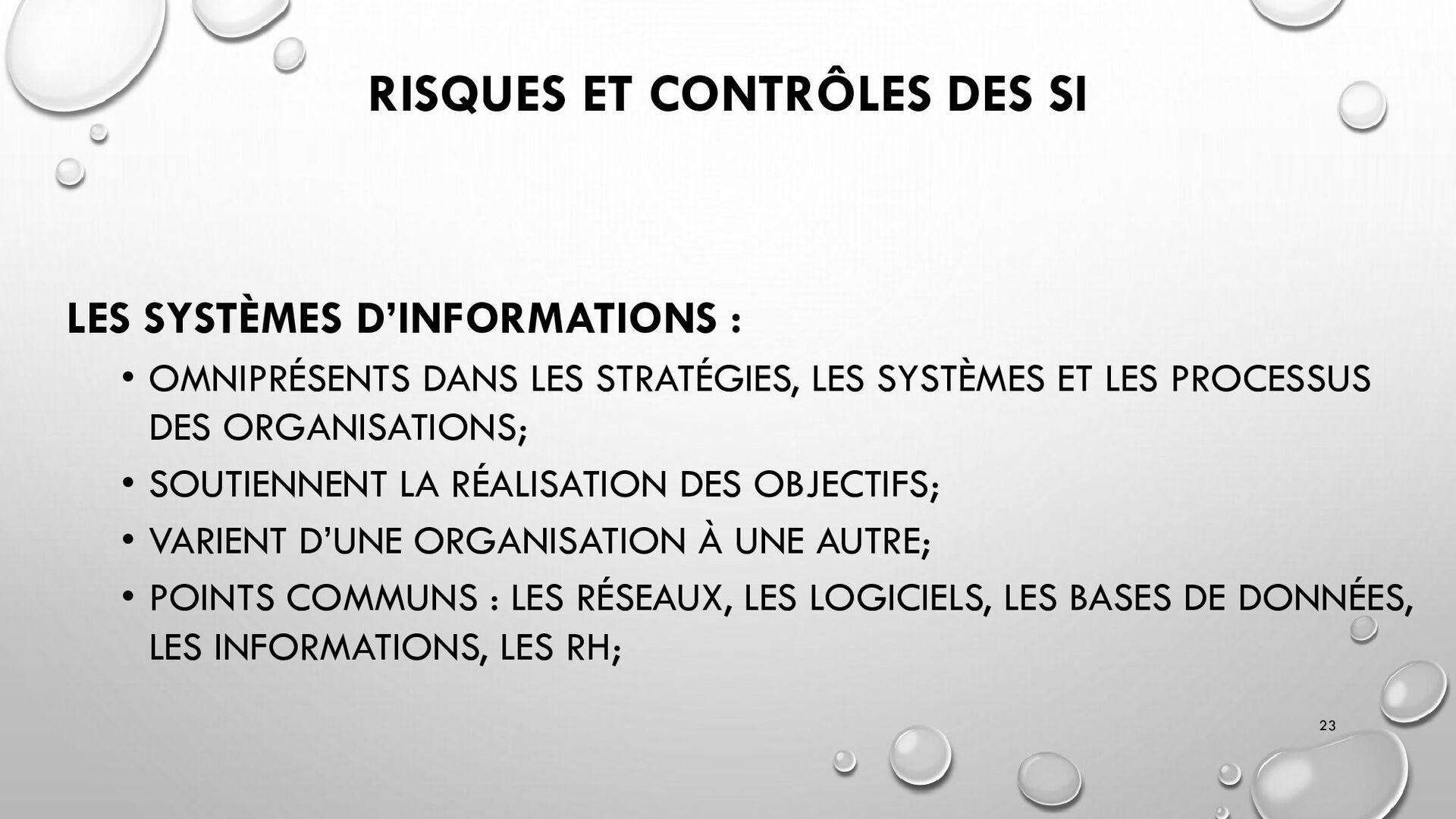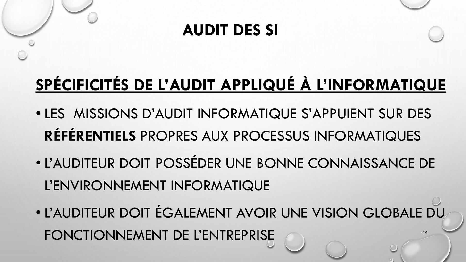 CONTRÔLES TECHNIQUES DES SI : • CONTRÔLE DES LOGICIELS SYSTÈMES, SYSTÈME D’EXPLOITATION, SYSTÈME DE GESTION DE BDD, PARE-FEUX, ANTIVIRUS => RESTREINDRE L’ACCÈS LOGIQUE AU SYSTÈMES ET APPLICATIONS, PILOTE L’UTILISATION DES SYSTÈMES, GÉNÈRE DES PISTES D’AUDIT. • EXEMPLE : PENTEST, DROIT D’ACCÈS CONFORME À LA POLITIQUE, SÉPARATION DES TÂCHES, IDS, IPS, CHIFFREMENT, PROCÉDURES DE GESTION DES CHANGEMENTS ET DES PATCHS 32
