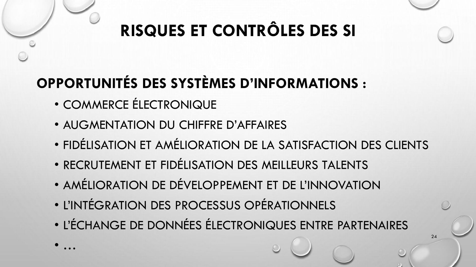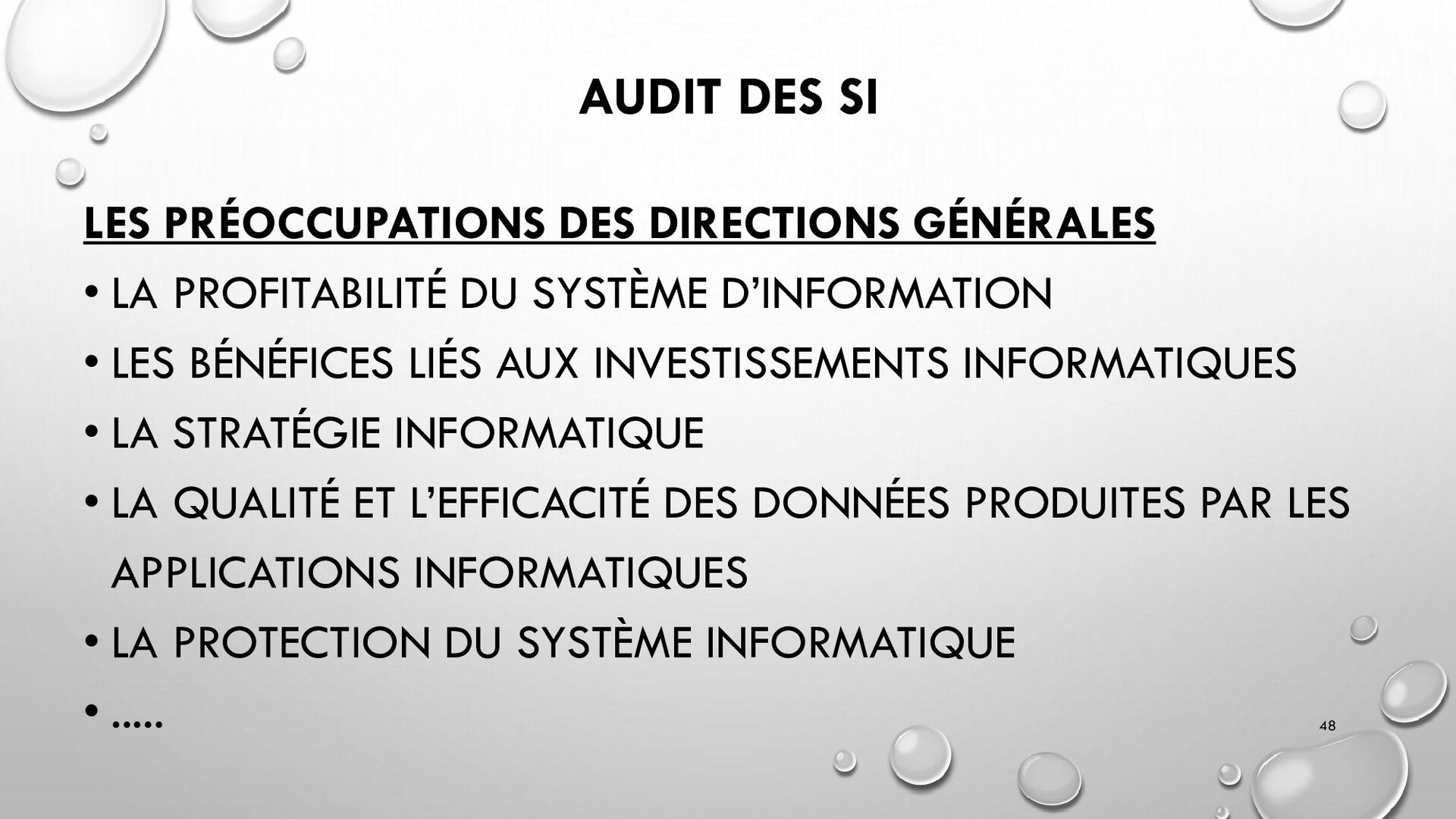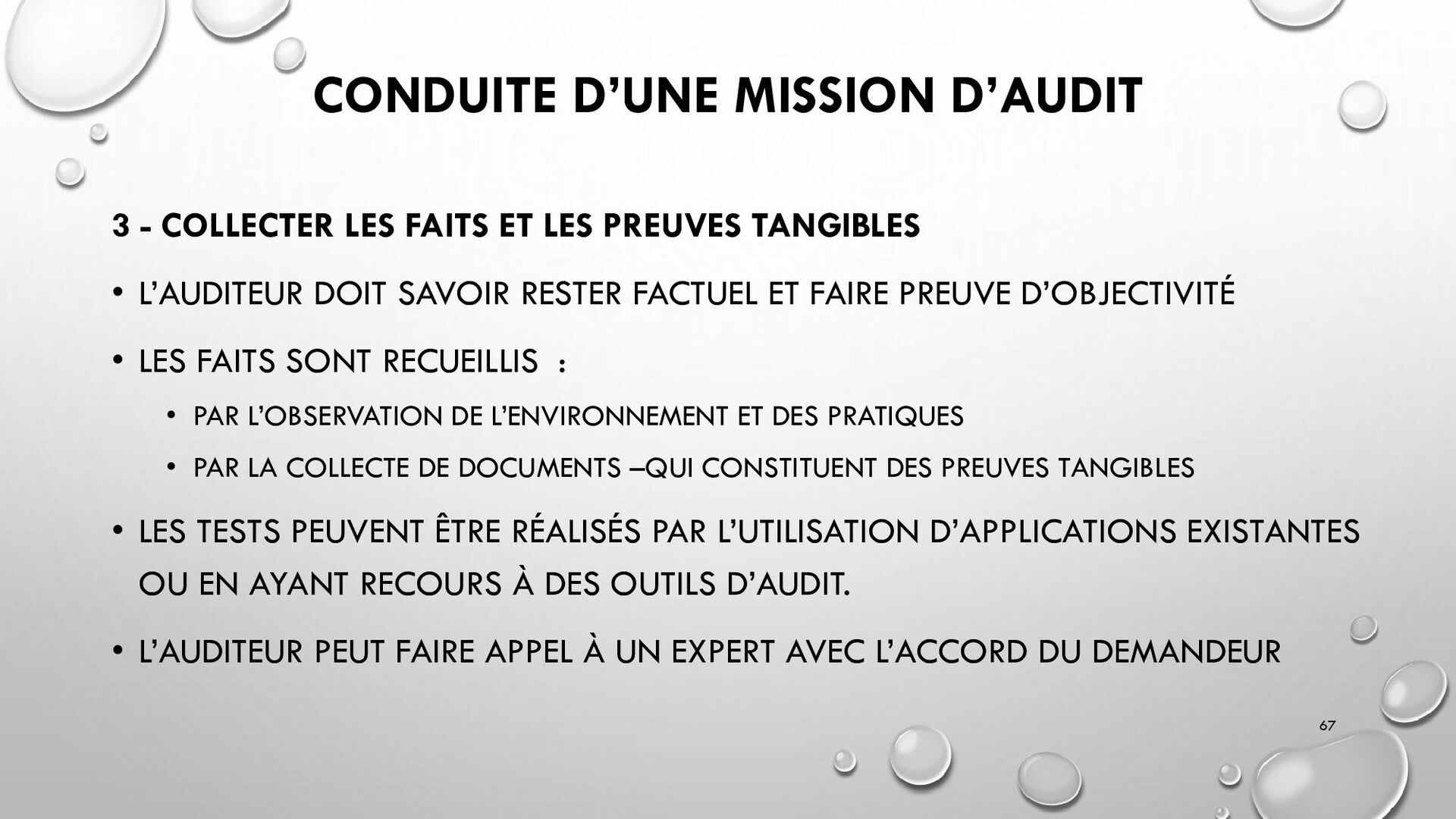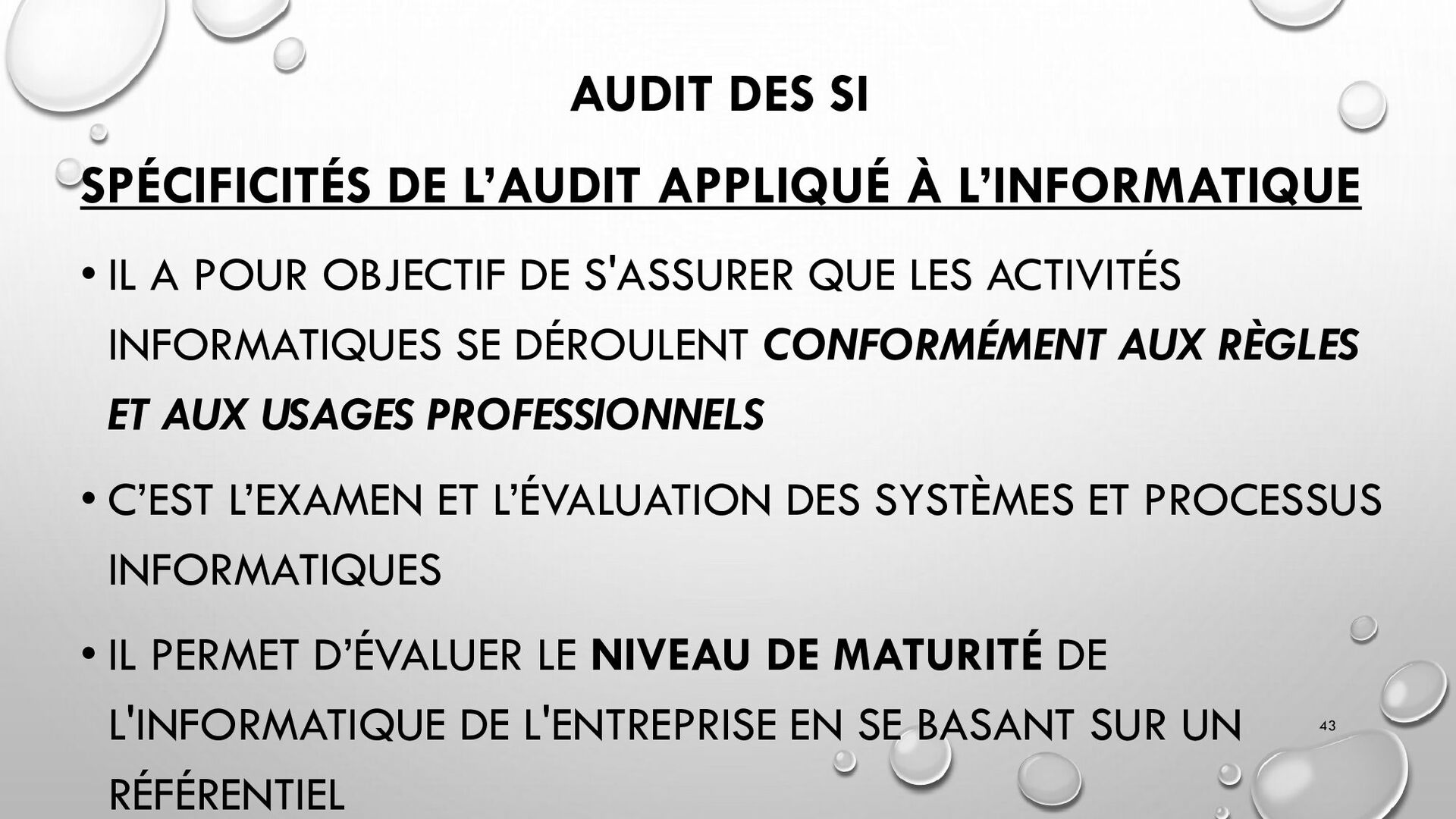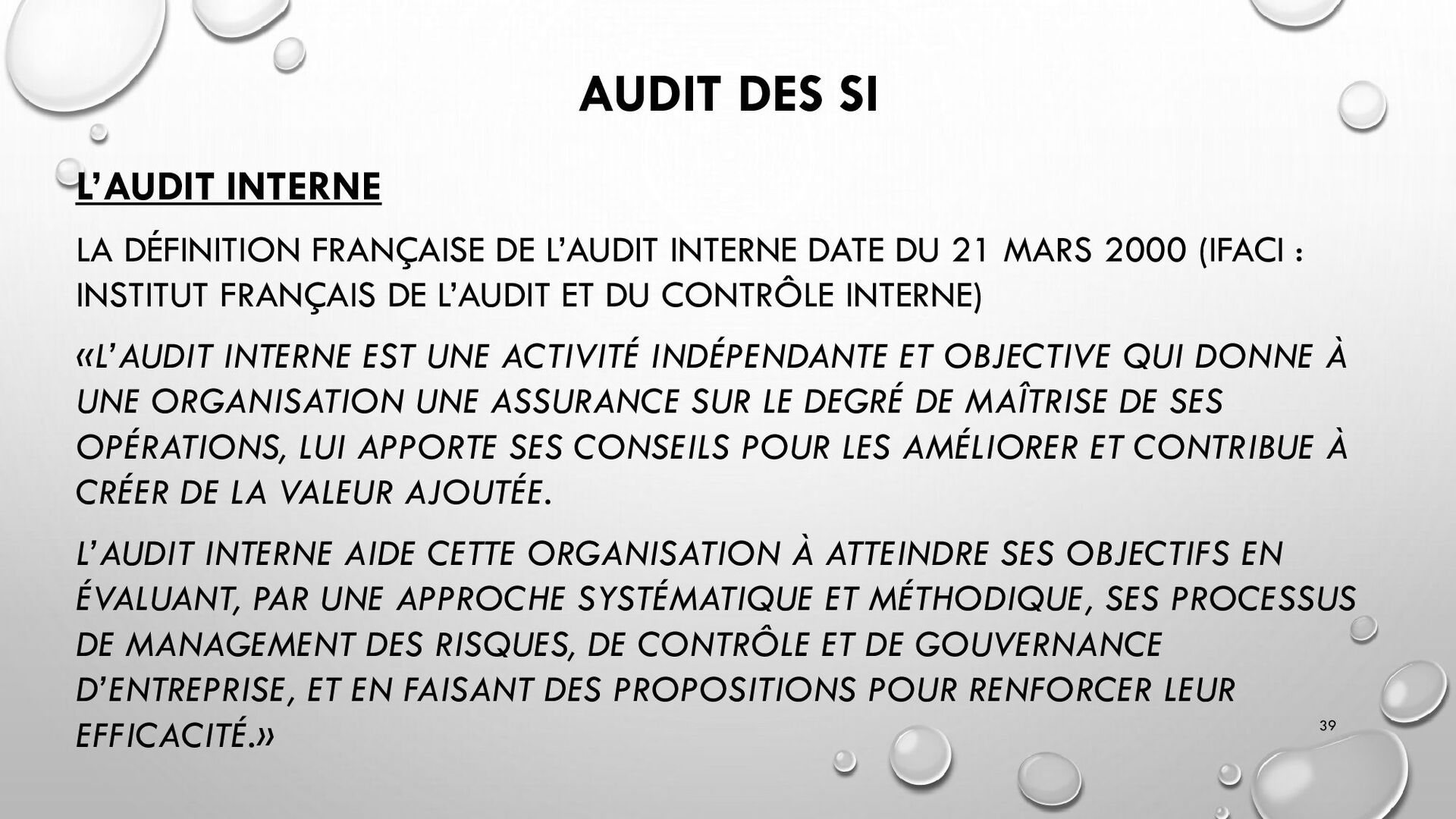CONTRÔLES TECHNIQUES DES SI : • CONTRÔLE DES LOGICIELS SYSTÈMES, SYSTÈME D’EXPLOITATION, SYSTÈME DE GESTION DE BDD, PARE-FEUX, ANTIVIRUS => RESTREINDRE L’ACCÈS LOGIQUE AU SYSTÈMES ET APPLICATIONS, PILOTE L’UTILISATION DES SYSTÈMES, GÉNÈRE DES PISTES D’AUDIT. • EXEMPLE : PENTEST, DROIT D’ACCÈS CONFORME À LA POLITIQUE, SÉPARATION DES TÂCHES, IDS, IPS, CHIFFREMENT, PROCÉDURES DE GESTION DES CHANGEMENTS ET DES PATCHS 32