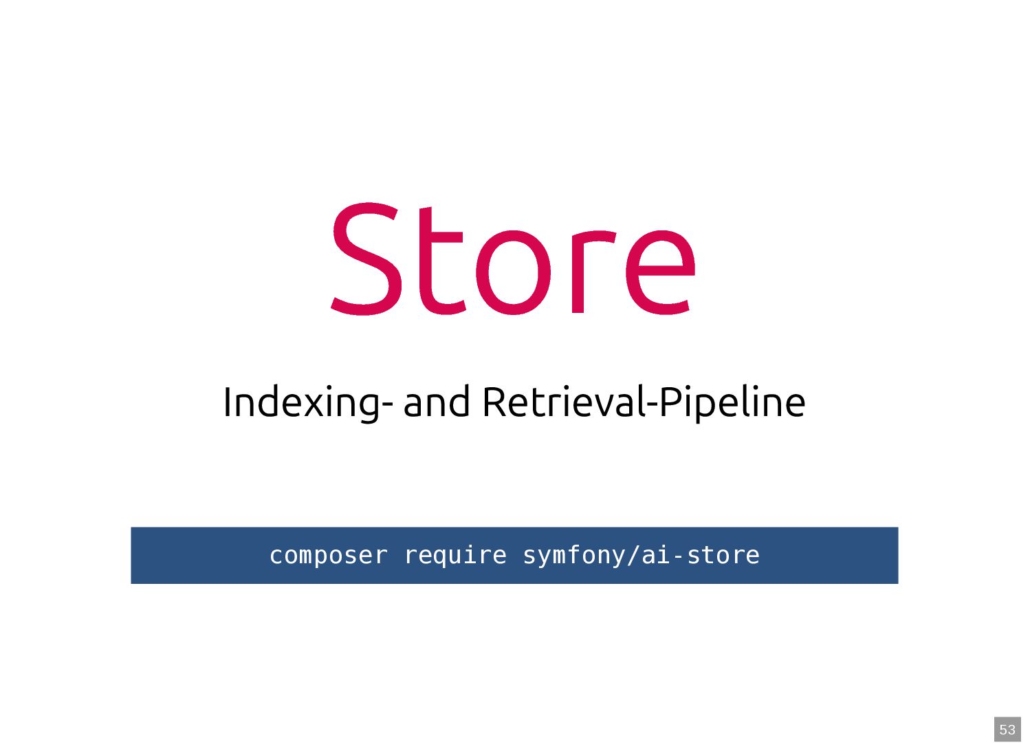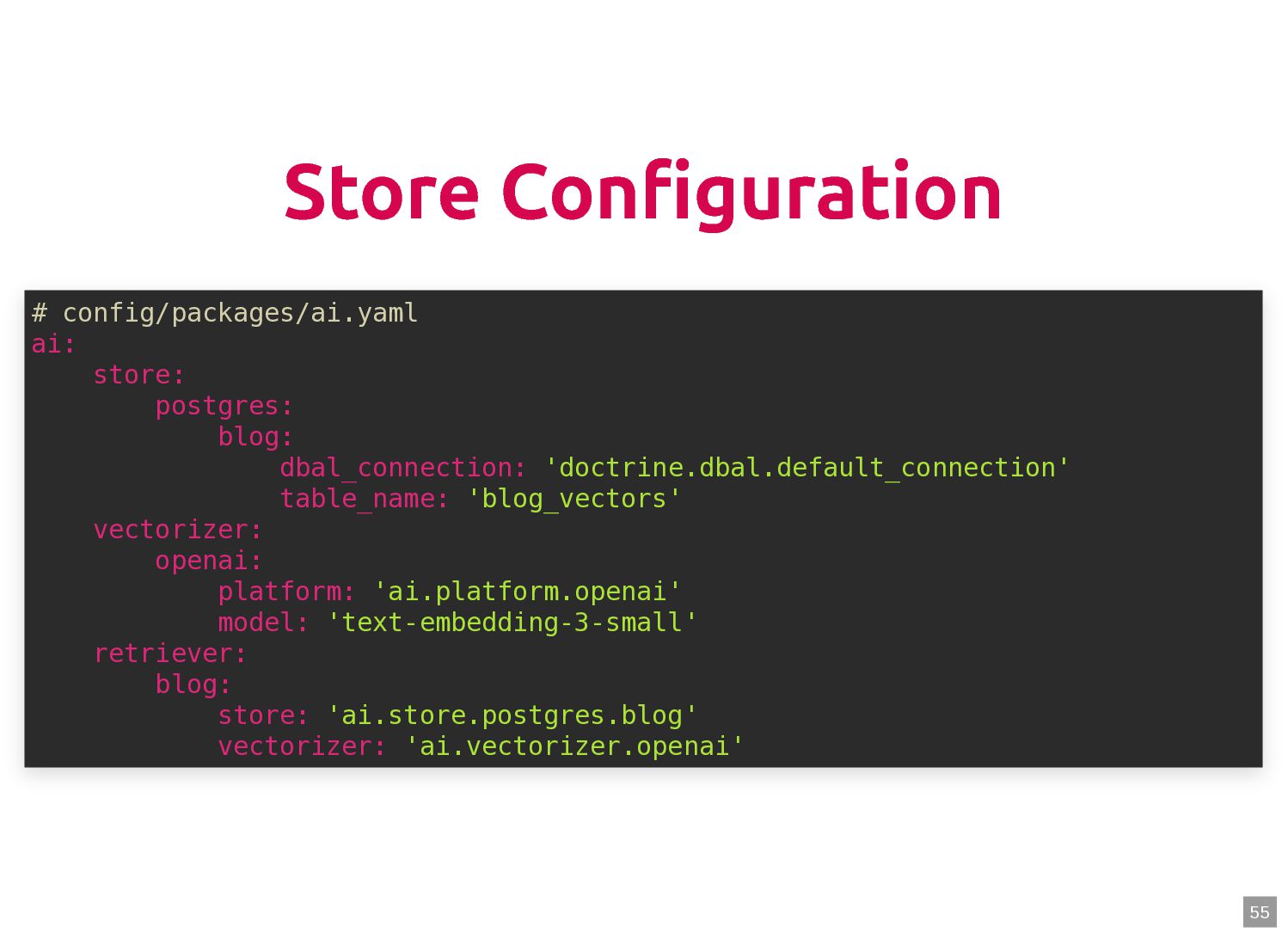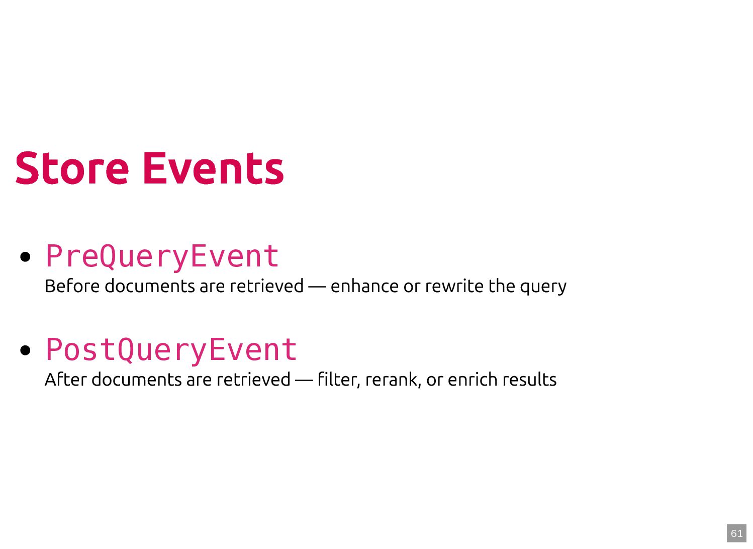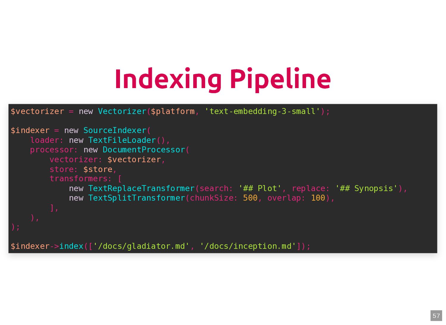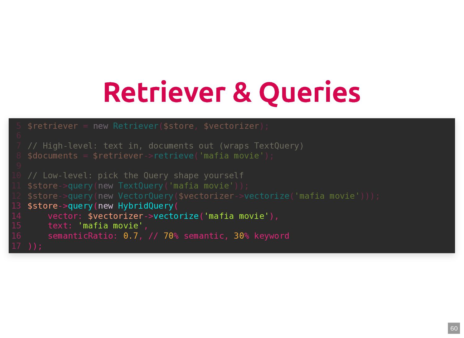 text in, documents out (wraps TextQuery) $documents = $retriever->retrieve('mafia movie'); // Low-level: pick the Query shape yourself $store->query(new TextQuery('mafia movie')); $store->query(new VectorQuery($vectorizer->vectorize('mafia movie'))); $store->query(new HybridQuery( vector: $vectorizer->vectorize('mafia movie'), text: 'mafia movie', semanticRatio: 0.7, // 70% semantic, 30% keyword )); 5 6 7 8 9 10 11 12 13 14 15 16 17 $retriever = new Retriever($store, $vectorizer); 5 6 // High-level: text in, documents out (wraps TextQuery) 7 $documents = $retriever->retrieve('mafia movie'); 8 9 // Low-level: pick the Query shape yourself 10 $store->query(new TextQuery('mafia movie')); 11 $store->query(new VectorQuery($vectorizer->vectorize('mafia movie'))); 12 $store->query(new HybridQuery( 13 vector: $vectorizer->vectorize('mafia movie'), 14 text: 'mafia movie', 15 semanticRatio: 0.7, // 70% semantic, 30% keyword 16 )); 17 $documents = $retriever->retrieve('mafia movie'); $retriever = new Retriever($store, $vectorizer); 5 6 // High-level: text in, documents out (wraps TextQuery) 7 8 9 // Low-level: pick the Query shape yourself 10 $store->query(new TextQuery('mafia movie')); 11 $store->query(new VectorQuery($vectorizer->vectorize('mafia movie'))); 12 $store->query(new HybridQuery( 13 vector: $vectorizer->vectorize('mafia movie'), 14 text: 'mafia movie', 15 semanticRatio: 0.7, // 70% semantic, 30% keyword 16 )); 17 $store->query(new TextQuery('mafia movie')); $retriever = new Retriever($store, $vectorizer); 5 6 // High-level: text in, documents out (wraps TextQuery) 7 $documents = $retriever->retrieve('mafia movie'); 8 9 // Low-level: pick the Query shape yourself 10 11 $store->query(new VectorQuery($vectorizer->vectorize('mafia movie'))); 12 $store->query(new HybridQuery( 13 vector: $vectorizer->vectorize('mafia movie'), 14 text: 'mafia movie', 15 semanticRatio: 0.7, // 70% semantic, 30% keyword 16 )); 17 $store->query(new VectorQuery($vectorizer->vectorize('mafia movie'))); $retriever = new Retriever($store, $vectorizer); 5 6 // High-level: text in, documents out (wraps TextQuery) 7 $documents = $retriever->retrieve('mafia movie'); 8 9 // Low-level: pick the Query shape yourself 10 $store->query(new TextQuery('mafia movie')); 11 12 $store->query(new HybridQuery( 13 vector: $vectorizer->vectorize('mafia movie'), 14 text: 'mafia movie', 15 semanticRatio: 0.7, // 70% semantic, 30% keyword 16 )); 17 $store->query(new HybridQuery( vector: $vectorizer->vectorize('mafia movie'), text: 'mafia movie', semanticRatio: 0.7, // 70% semantic, 30% keyword )); $retriever = new Retriever($store, $vectorizer); 5 6 // High-level: text in, documents out (wraps TextQuery) 7 $documents = $retriever->retrieve('mafia movie'); 8 9 // Low-level: pick the Query shape yourself 10 $store->query(new TextQuery('mafia movie')); 11 $store->query(new VectorQuery($vectorizer->vectorize('mafia movie'))); 12 13 14 15 16 17 60