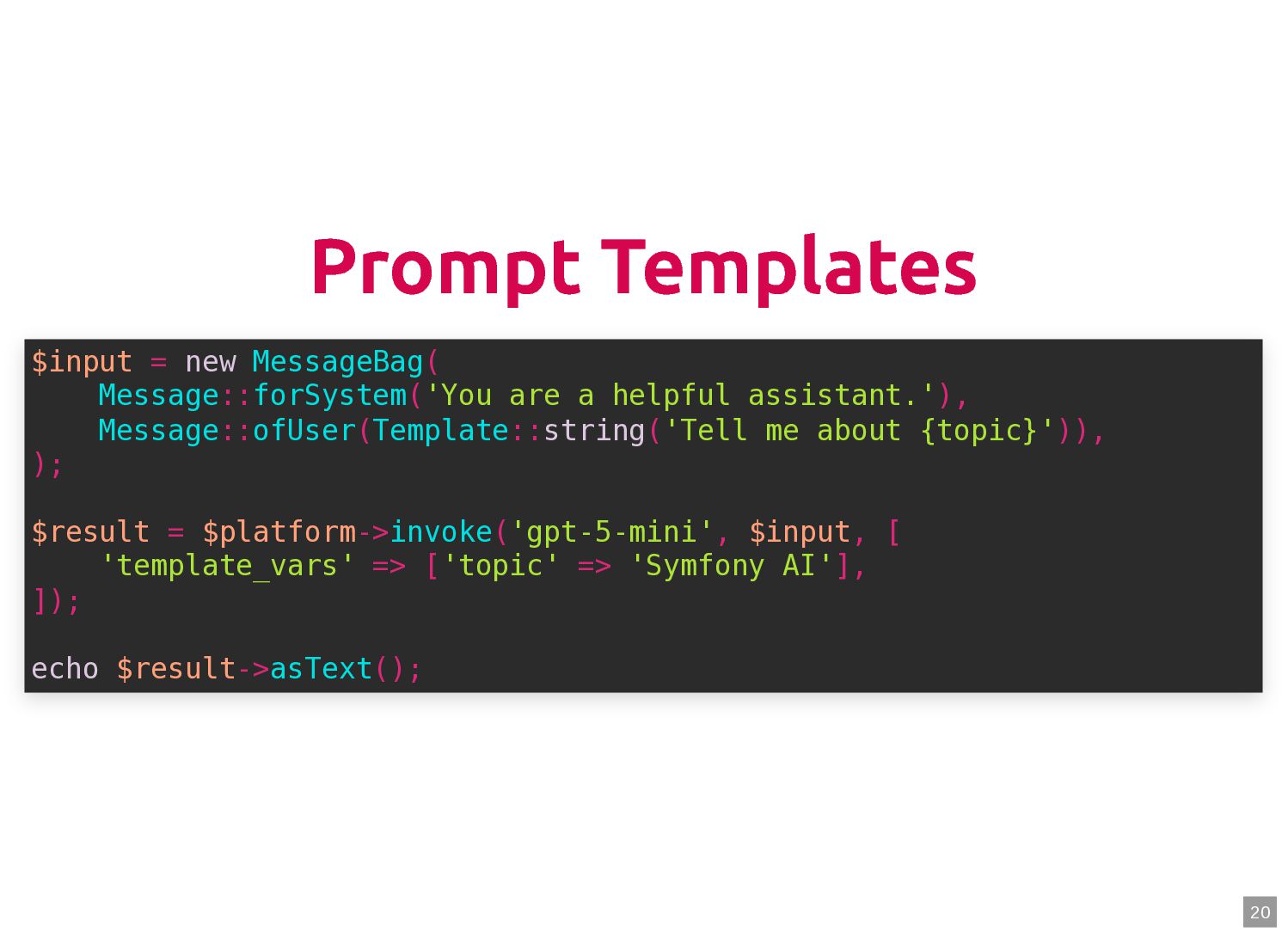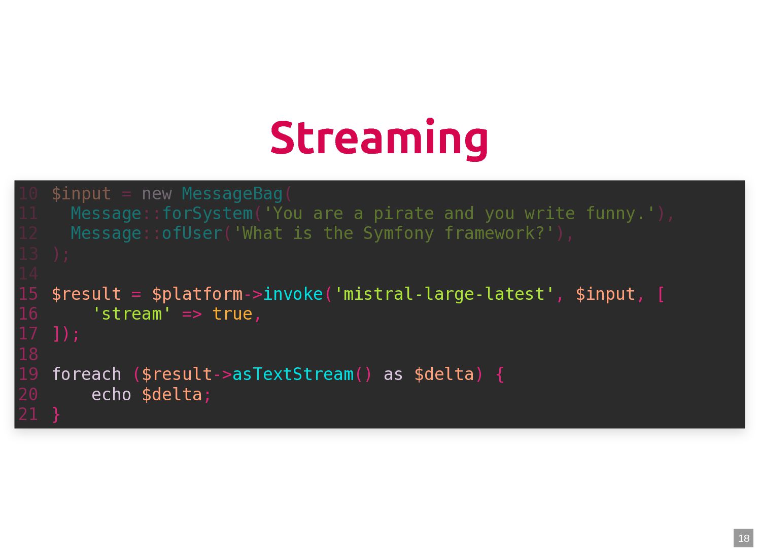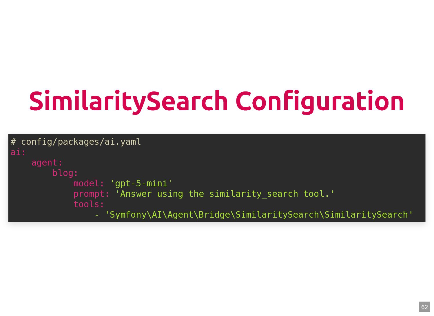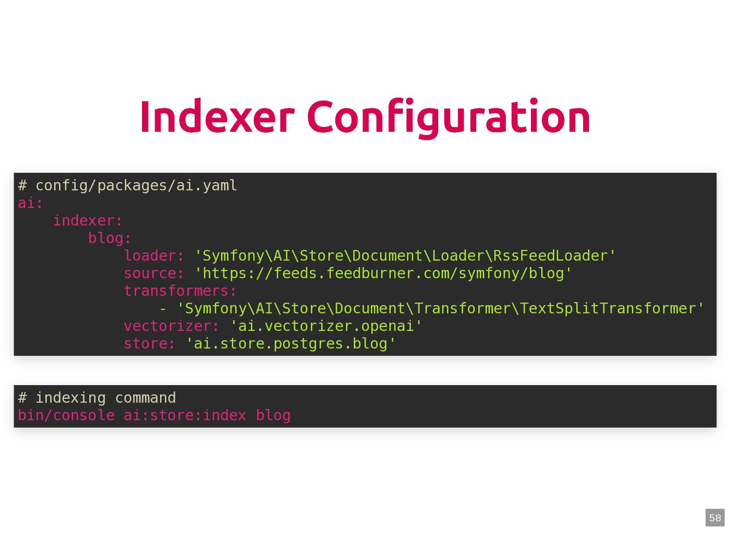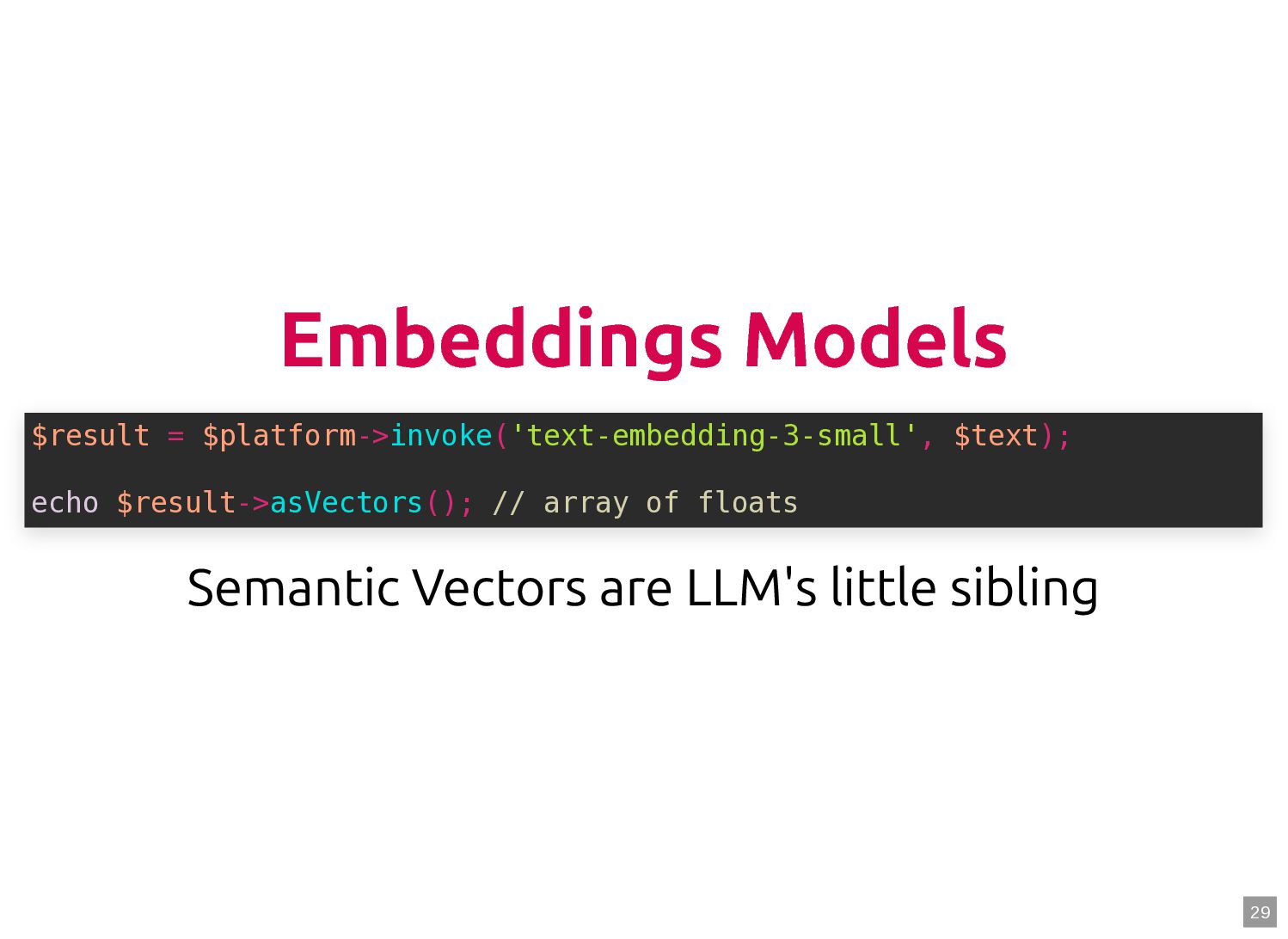 text in, documents out (wraps TextQuery) $documents = $retriever->retrieve('mafia movie'); // Low-level: pick the Query shape yourself $store->query(new TextQuery('mafia movie')); $store->query(new VectorQuery($vectorizer->vectorize('mafia movie'))); $store->query(new HybridQuery( vector: $vectorizer->vectorize('mafia movie'), text: 'mafia movie', semanticRatio: 0.7, // 70% semantic, 30% keyword )); 5 6 7 8 9 10 11 12 13 14 15 16 17 $retriever = new Retriever($store, $vectorizer); 5 6 // High-level: text in, documents out (wraps TextQuery) 7 $documents = $retriever->retrieve('mafia movie'); 8 9 // Low-level: pick the Query shape yourself 10 $store->query(new TextQuery('mafia movie')); 11 $store->query(new VectorQuery($vectorizer->vectorize('mafia movie'))); 12 $store->query(new HybridQuery( 13 vector: $vectorizer->vectorize('mafia movie'), 14 text: 'mafia movie', 15 semanticRatio: 0.7, // 70% semantic, 30% keyword 16 )); 17 $documents = $retriever->retrieve('mafia movie'); $retriever = new Retriever($store, $vectorizer); 5 6 // High-level: text in, documents out (wraps TextQuery) 7 8 9 // Low-level: pick the Query shape yourself 10 $store->query(new TextQuery('mafia movie')); 11 $store->query(new VectorQuery($vectorizer->vectorize('mafia movie'))); 12 $store->query(new HybridQuery( 13 vector: $vectorizer->vectorize('mafia movie'), 14 text: 'mafia movie', 15 semanticRatio: 0.7, // 70% semantic, 30% keyword 16 )); 17 $store->query(new TextQuery('mafia movie')); $retriever = new Retriever($store, $vectorizer); 5 6 // High-level: text in, documents out (wraps TextQuery) 7 $documents = $retriever->retrieve('mafia movie'); 8 9 // Low-level: pick the Query shape yourself 10 11 $store->query(new VectorQuery($vectorizer->vectorize('mafia movie'))); 12 $store->query(new HybridQuery( 13 vector: $vectorizer->vectorize('mafia movie'), 14 text: 'mafia movie', 15 semanticRatio: 0.7, // 70% semantic, 30% keyword 16 )); 17 $store->query(new VectorQuery($vectorizer->vectorize('mafia movie'))); $retriever = new Retriever($store, $vectorizer); 5 6 // High-level: text in, documents out (wraps TextQuery) 7 $documents = $retriever->retrieve('mafia movie'); 8 9 // Low-level: pick the Query shape yourself 10 $store->query(new TextQuery('mafia movie')); 11 12 $store->query(new HybridQuery( 13 vector: $vectorizer->vectorize('mafia movie'), 14 text: 'mafia movie', 15 semanticRatio: 0.7, // 70% semantic, 30% keyword 16 )); 17 $store->query(new HybridQuery( vector: $vectorizer->vectorize('mafia movie'), text: 'mafia movie', semanticRatio: 0.7, // 70% semantic, 30% keyword )); $retriever = new Retriever($store, $vectorizer); 5 6 // High-level: text in, documents out (wraps TextQuery) 7 $documents = $retriever->retrieve('mafia movie'); 8 9 // Low-level: pick the Query shape yourself 10 $store->query(new TextQuery('mafia movie')); 11 $store->query(new VectorQuery($vectorizer->vectorize('mafia movie'))); 12 13 14 15 16 17 60