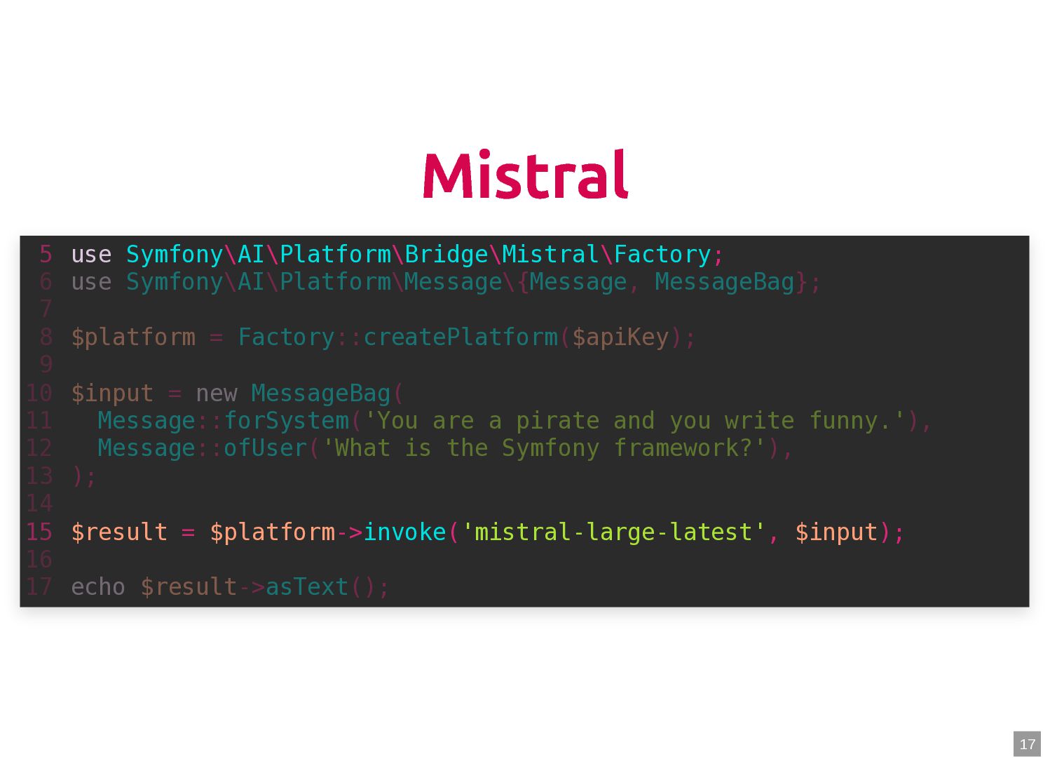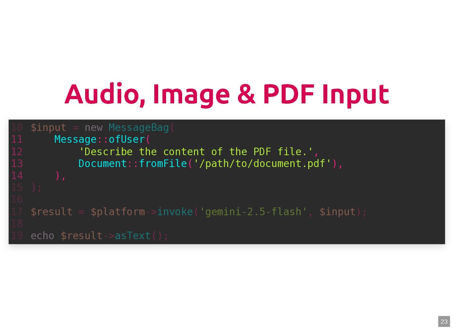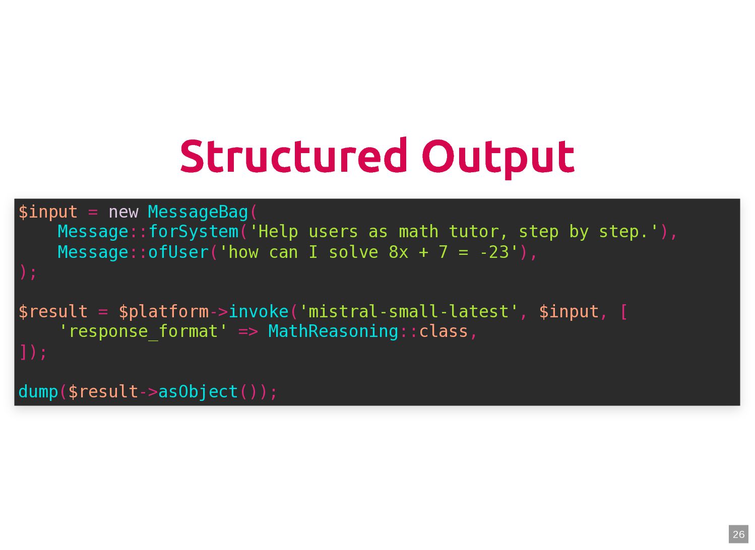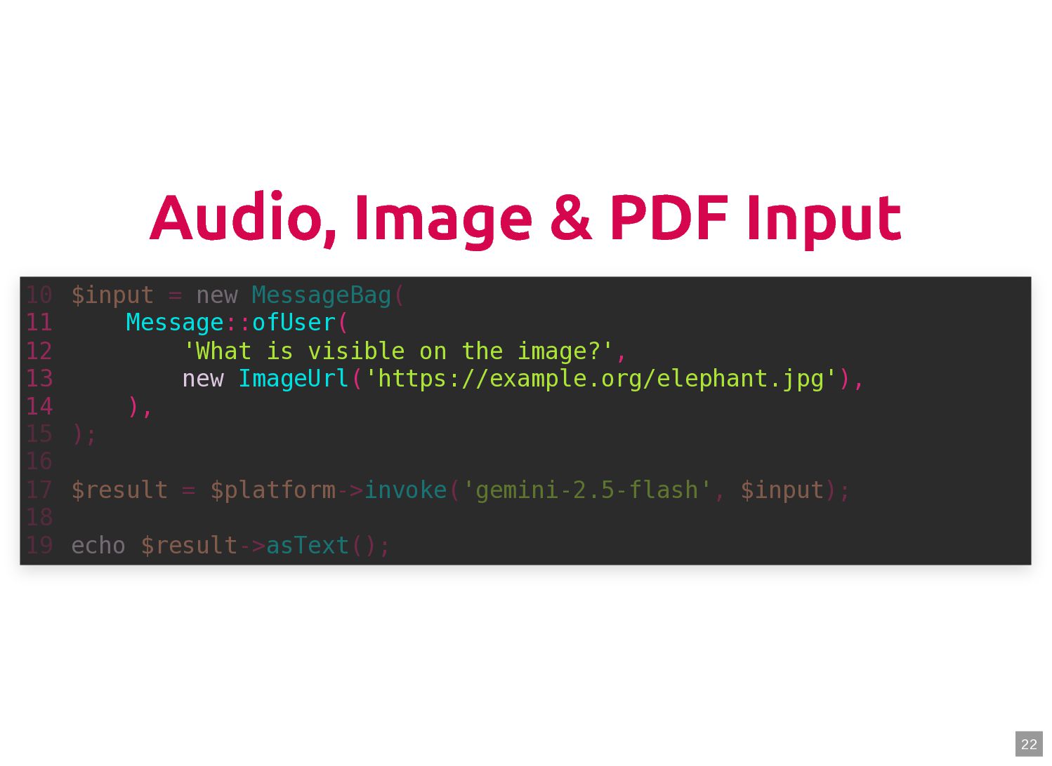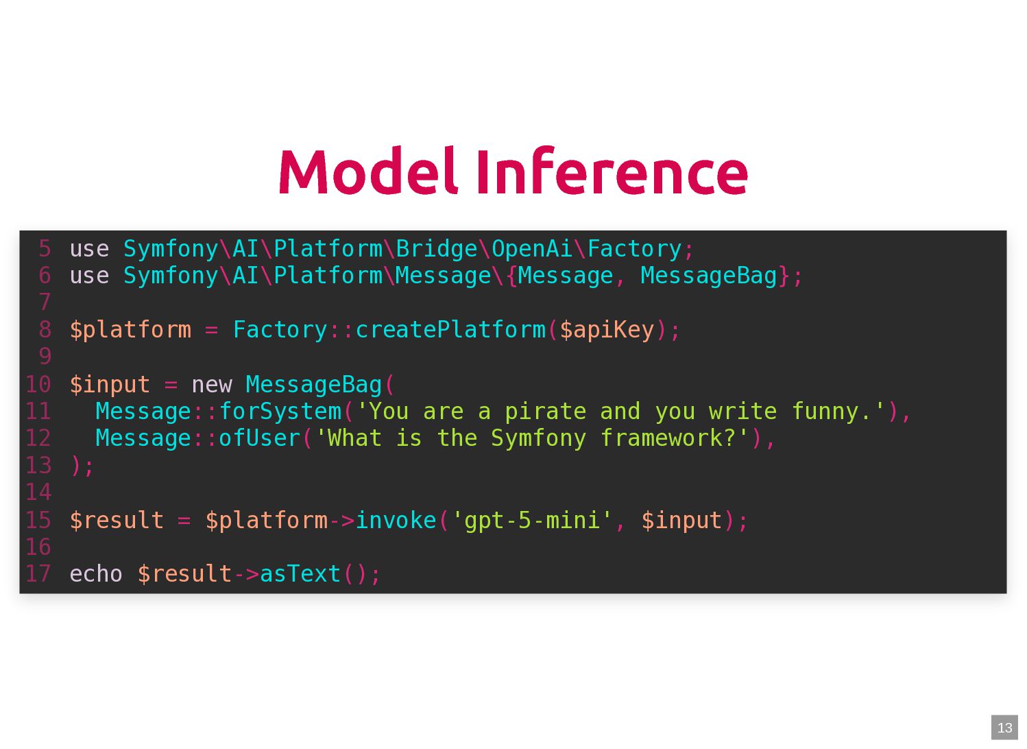 text in, documents out (wraps TextQuery) $documents = $retriever->retrieve('mafia movie'); // Low-level: pick the Query shape yourself $store->query(new TextQuery('mafia movie')); $store->query(new VectorQuery($vectorizer->vectorize('mafia movie'))); $store->query(new HybridQuery( vector: $vectorizer->vectorize('mafia movie'), text: 'mafia movie', semanticRatio: 0.7, // 70% semantic, 30% keyword )); 5 6 7 8 9 10 11 12 13 14 15 16 17 $retriever = new Retriever($store, $vectorizer); 5 6 // High-level: text in, documents out (wraps TextQuery) 7 $documents = $retriever->retrieve('mafia movie'); 8 9 // Low-level: pick the Query shape yourself 10 $store->query(new TextQuery('mafia movie')); 11 $store->query(new VectorQuery($vectorizer->vectorize('mafia movie'))); 12 $store->query(new HybridQuery( 13 vector: $vectorizer->vectorize('mafia movie'), 14 text: 'mafia movie', 15 semanticRatio: 0.7, // 70% semantic, 30% keyword 16 )); 17 $documents = $retriever->retrieve('mafia movie'); $retriever = new Retriever($store, $vectorizer); 5 6 // High-level: text in, documents out (wraps TextQuery) 7 8 9 // Low-level: pick the Query shape yourself 10 $store->query(new TextQuery('mafia movie')); 11 $store->query(new VectorQuery($vectorizer->vectorize('mafia movie'))); 12 $store->query(new HybridQuery( 13 vector: $vectorizer->vectorize('mafia movie'), 14 text: 'mafia movie', 15 semanticRatio: 0.7, // 70% semantic, 30% keyword 16 )); 17 $store->query(new TextQuery('mafia movie')); $retriever = new Retriever($store, $vectorizer); 5 6 // High-level: text in, documents out (wraps TextQuery) 7 $documents = $retriever->retrieve('mafia movie'); 8 9 // Low-level: pick the Query shape yourself 10 11 $store->query(new VectorQuery($vectorizer->vectorize('mafia movie'))); 12 $store->query(new HybridQuery( 13 vector: $vectorizer->vectorize('mafia movie'), 14 text: 'mafia movie', 15 semanticRatio: 0.7, // 70% semantic, 30% keyword 16 )); 17 $store->query(new VectorQuery($vectorizer->vectorize('mafia movie'))); $retriever = new Retriever($store, $vectorizer); 5 6 // High-level: text in, documents out (wraps TextQuery) 7 $documents = $retriever->retrieve('mafia movie'); 8 9 // Low-level: pick the Query shape yourself 10 $store->query(new TextQuery('mafia movie')); 11 12 $store->query(new HybridQuery( 13 vector: $vectorizer->vectorize('mafia movie'), 14 text: 'mafia movie', 15 semanticRatio: 0.7, // 70% semantic, 30% keyword 16 )); 17 $store->query(new HybridQuery( vector: $vectorizer->vectorize('mafia movie'), text: 'mafia movie', semanticRatio: 0.7, // 70% semantic, 30% keyword )); $retriever = new Retriever($store, $vectorizer); 5 6 // High-level: text in, documents out (wraps TextQuery) 7 $documents = $retriever->retrieve('mafia movie'); 8 9 // Low-level: pick the Query shape yourself 10 $store->query(new TextQuery('mafia movie')); 11 $store->query(new VectorQuery($vectorizer->vectorize('mafia movie'))); 12 13 14 15 16 17 60